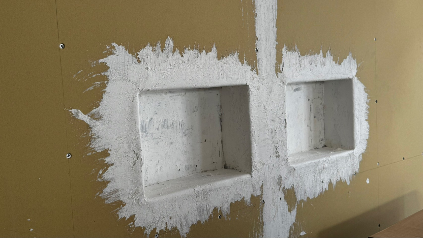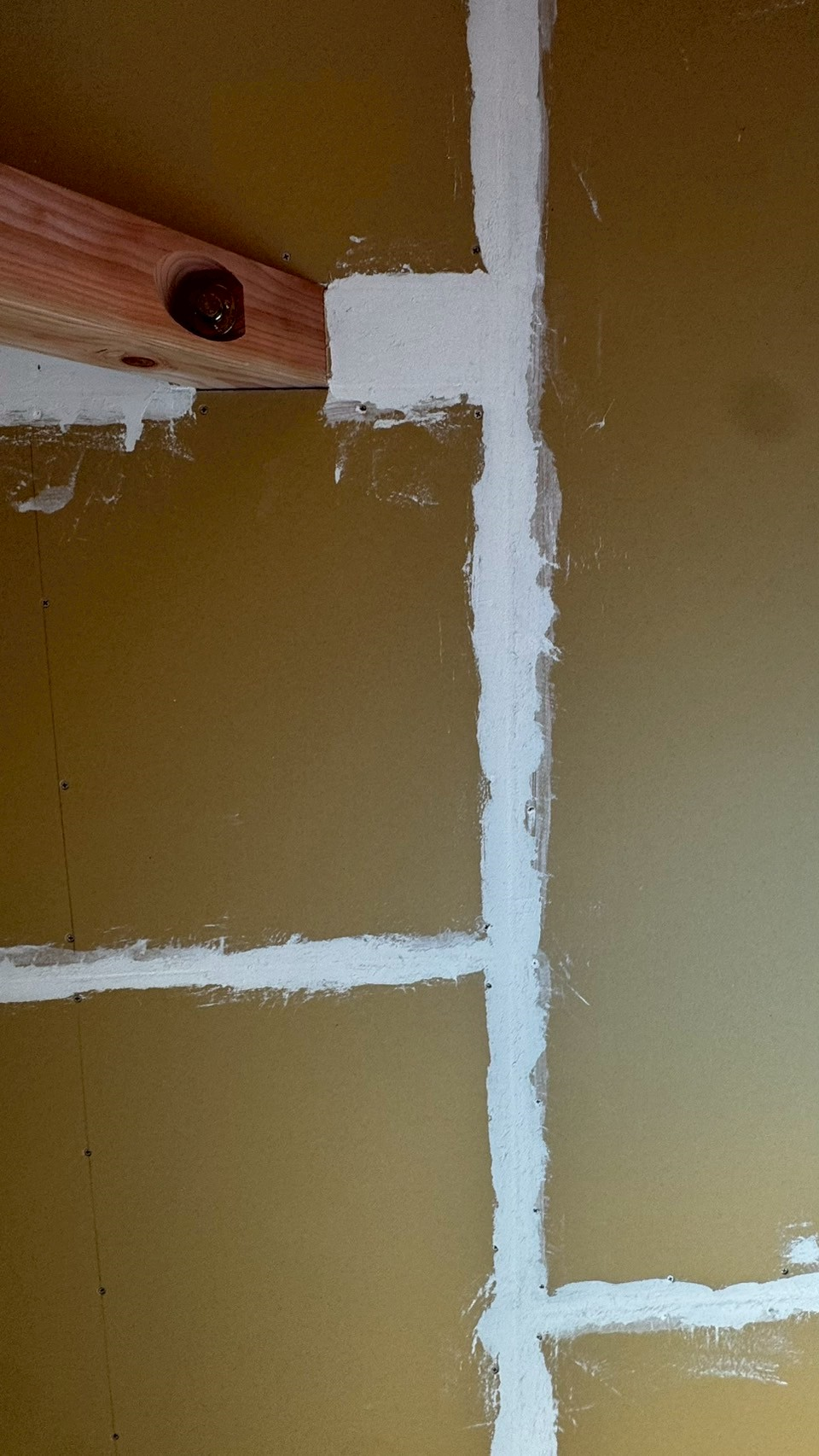 石膏ボード(壁の黄色い板)同士の間を埋める作業です。