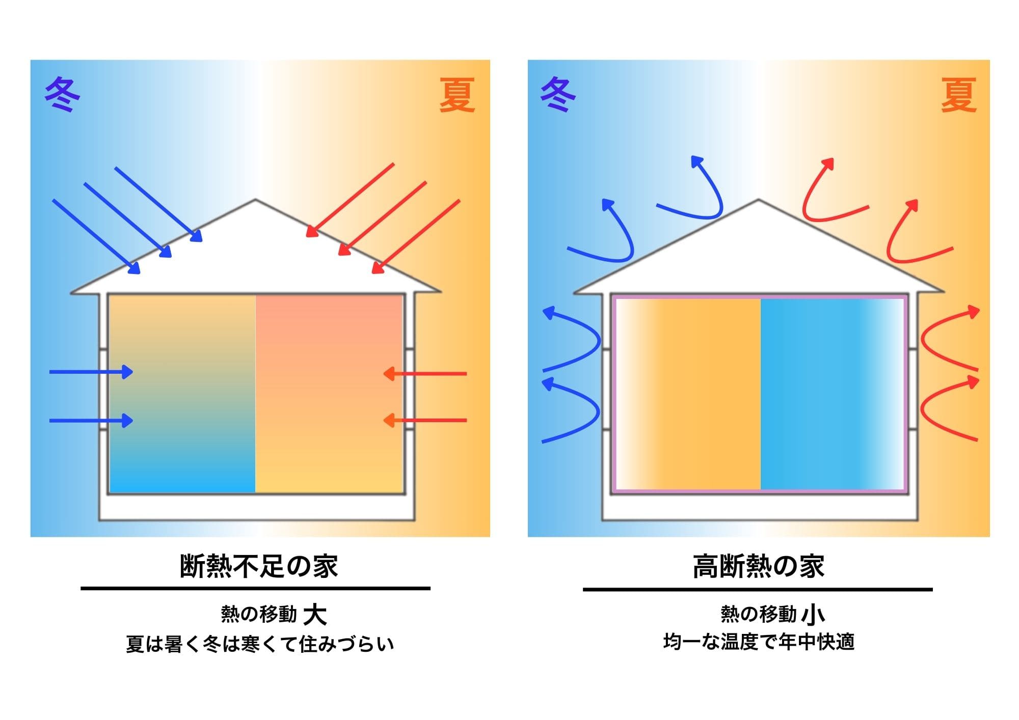 「高断熱」とは、断熱材などを用いて熱移動を防ぎ、