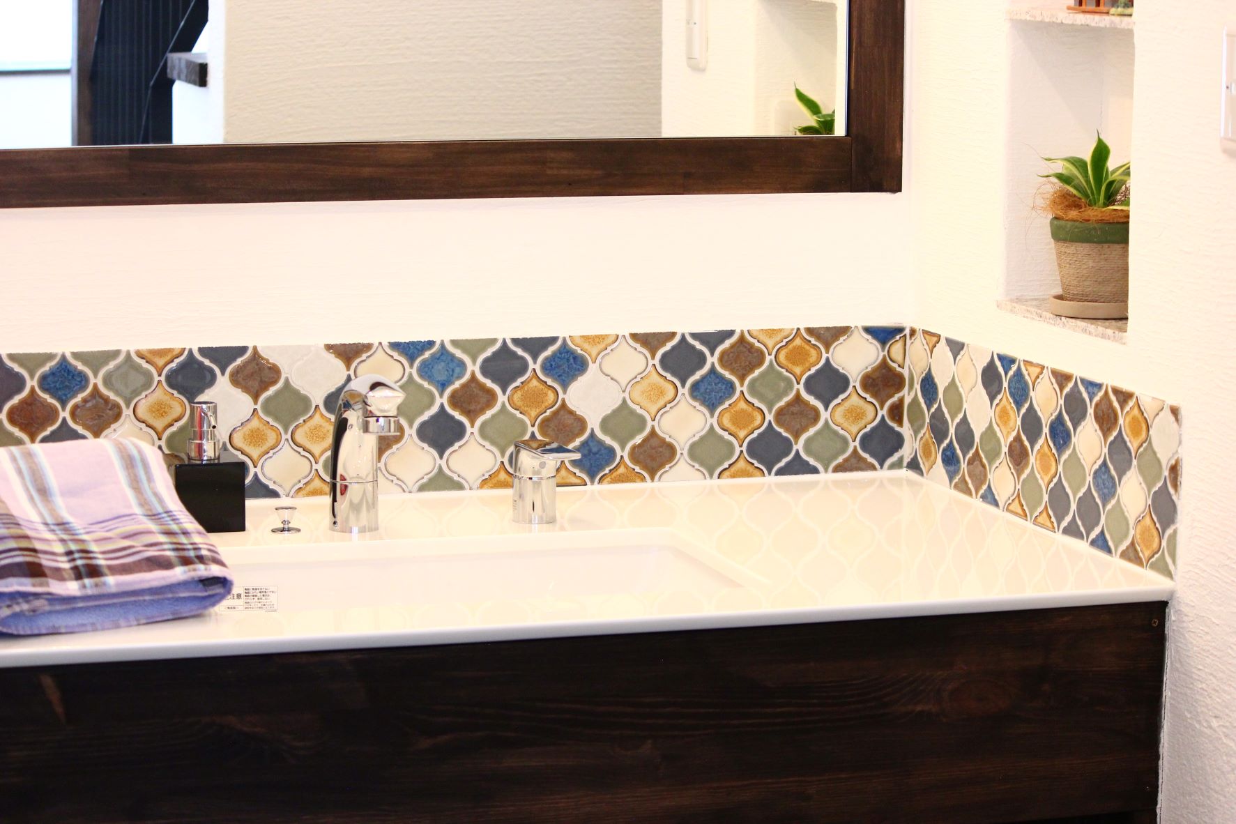 キッチンには、爽やかなアースカラーのタイルを使いました。