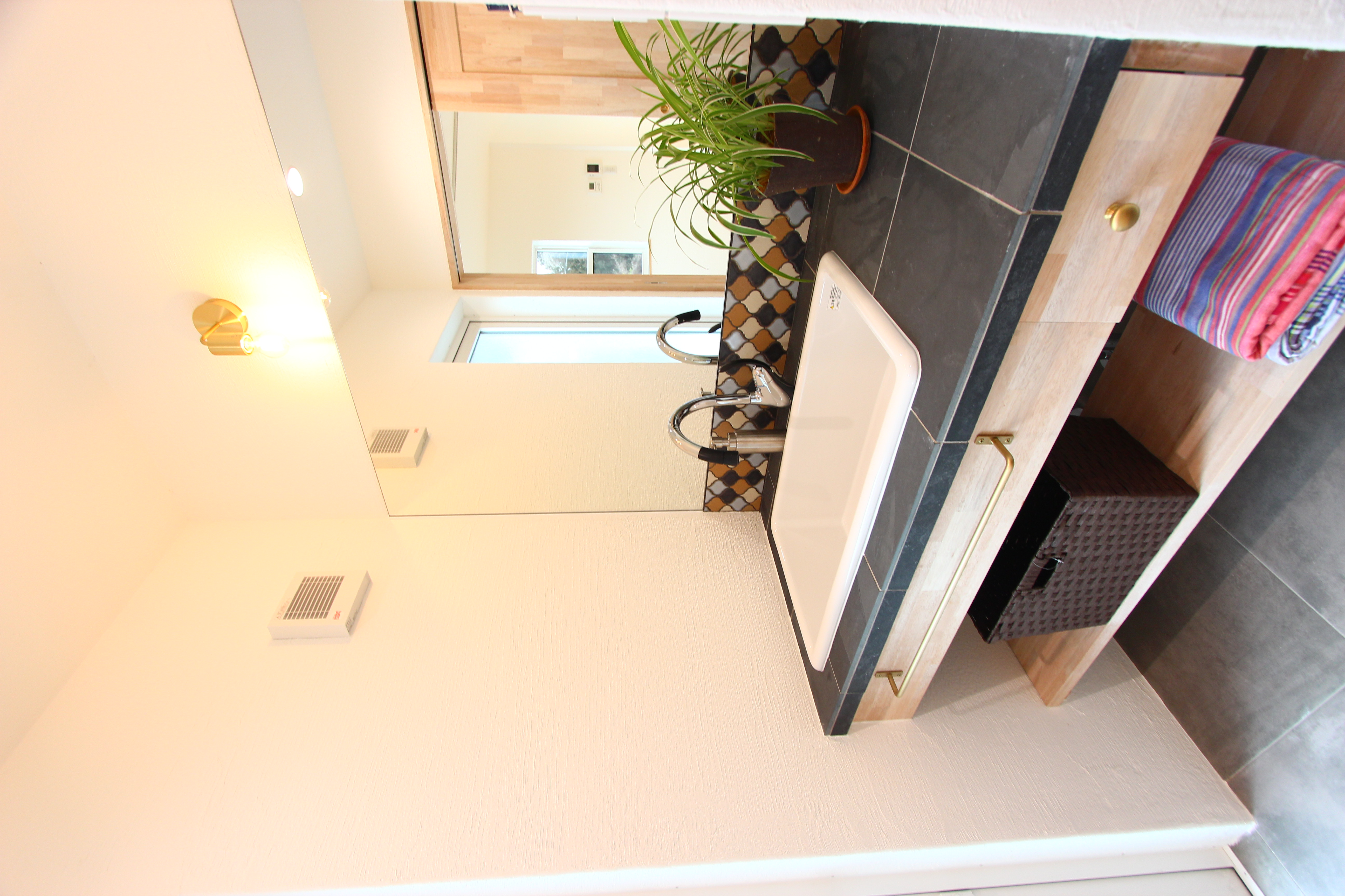 壁に貼った、砂岩タイルの淡いピンクによく合います。