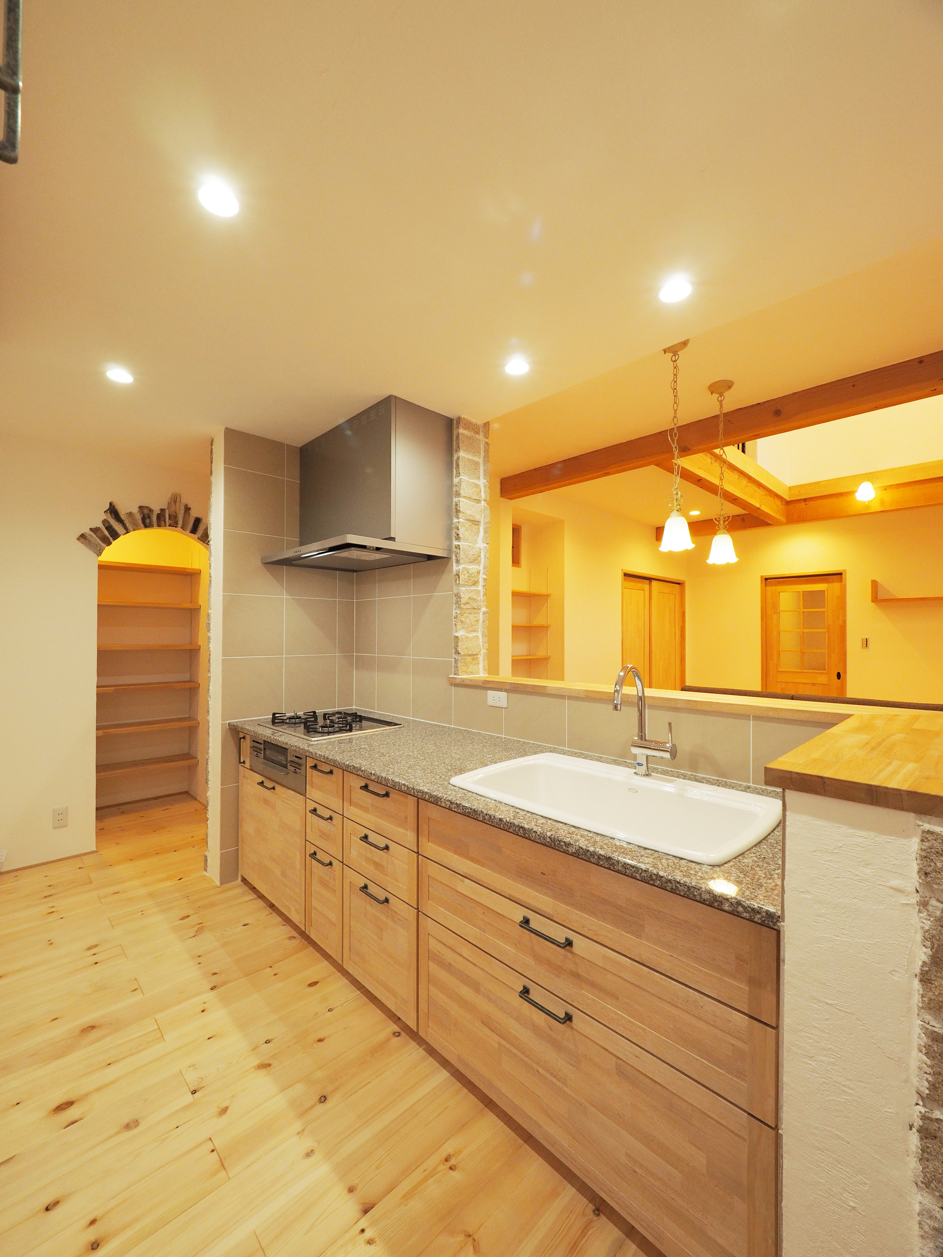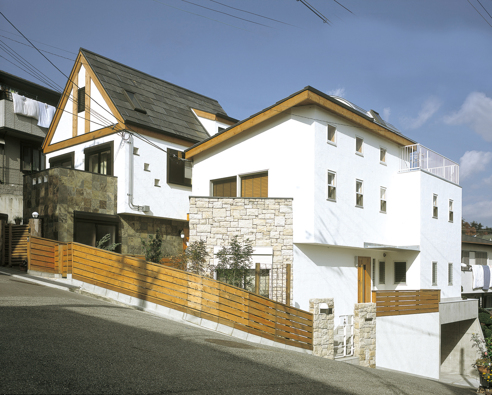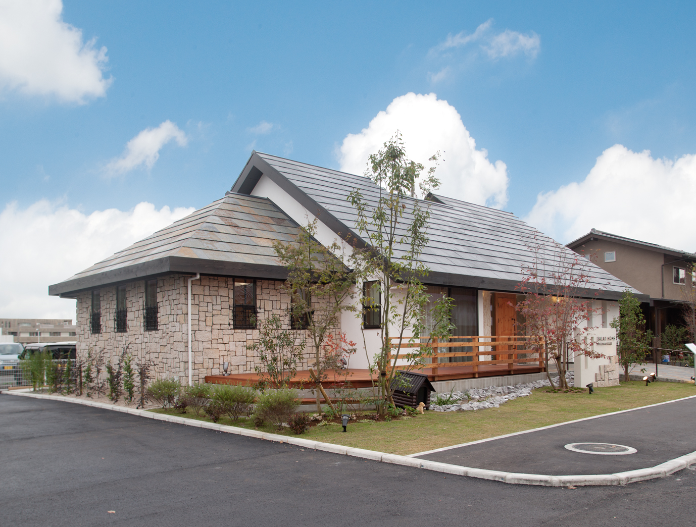 外壁には、錆バラやコーラルストーン、砂岩などを貼っています。