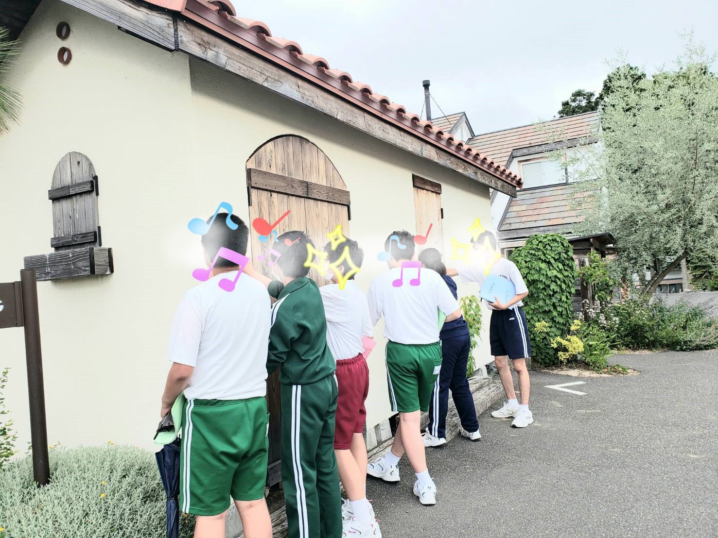 ↑ 無添加オリジナル漆喰でできた物置の壁を触っています!