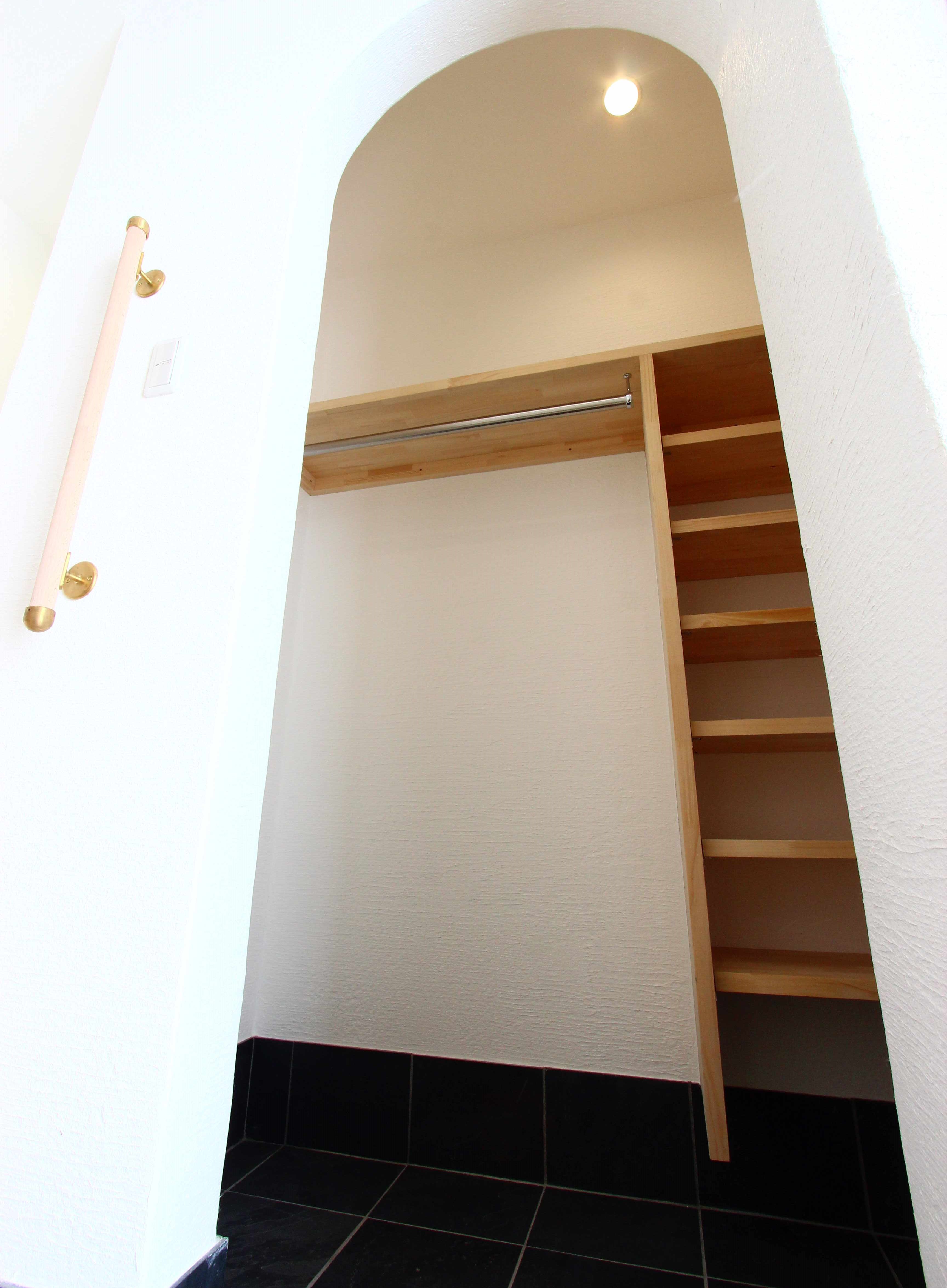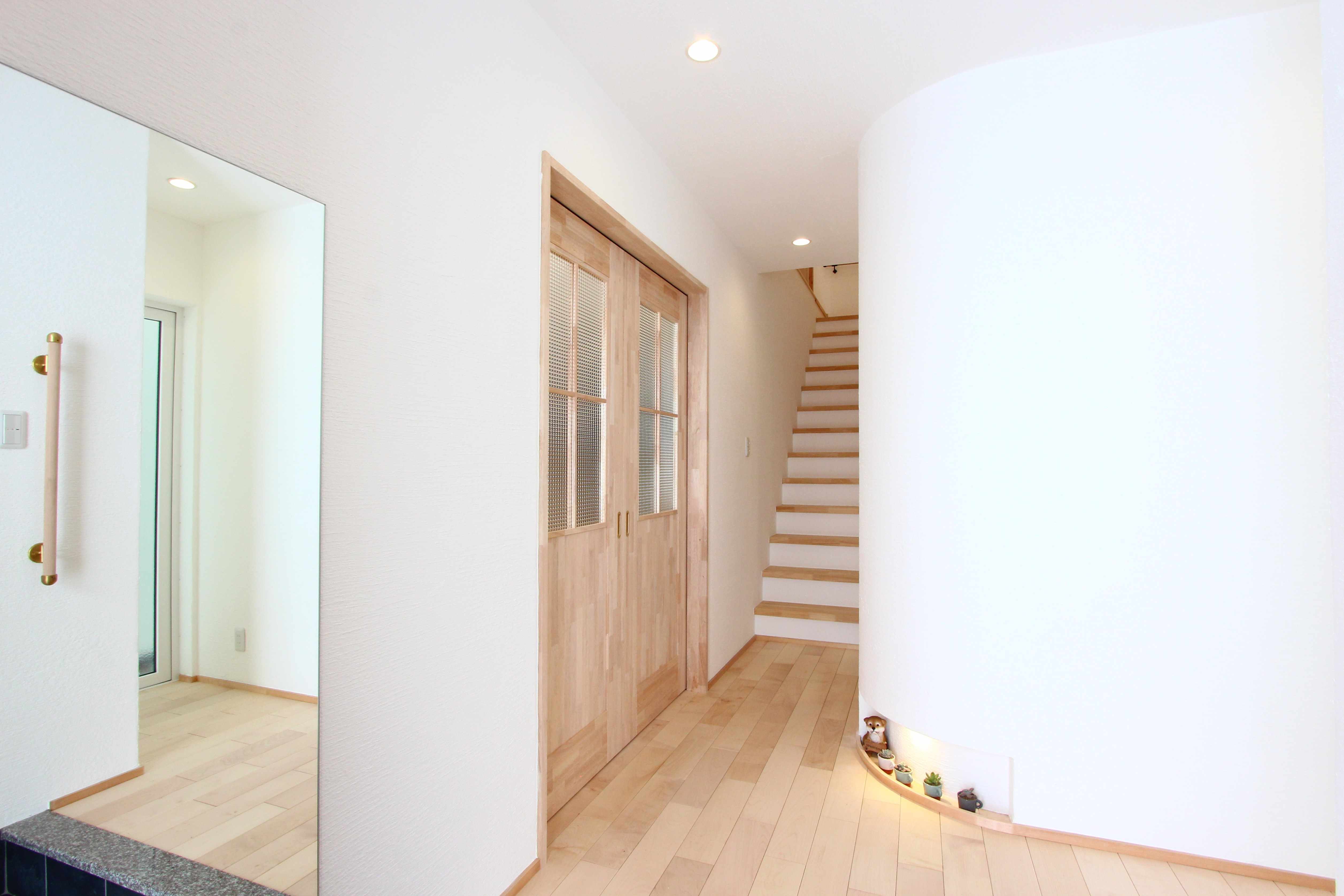 漆喰ならではのアールの壁が出迎えてくれます。照明のついたニッチが素敵です。