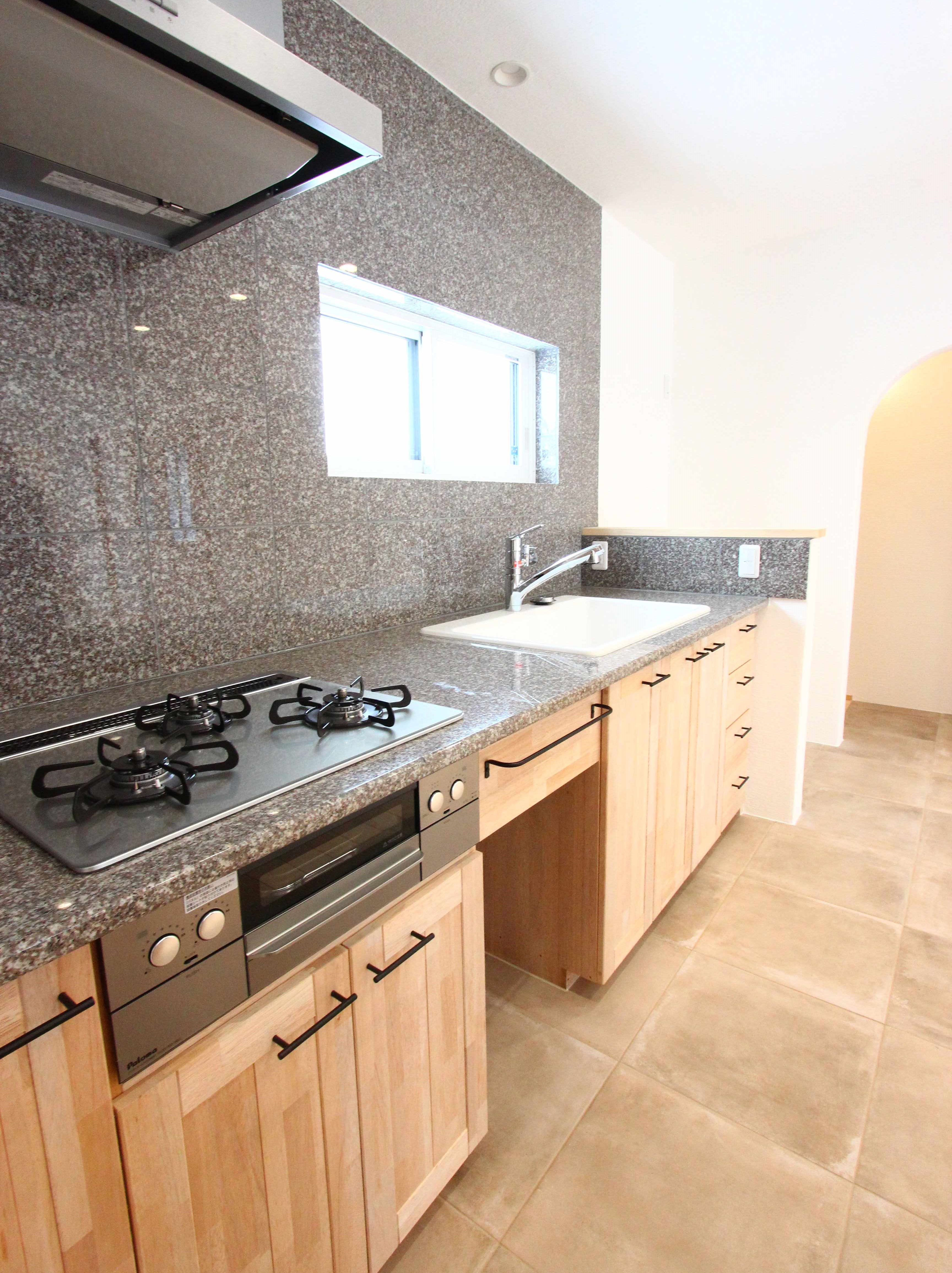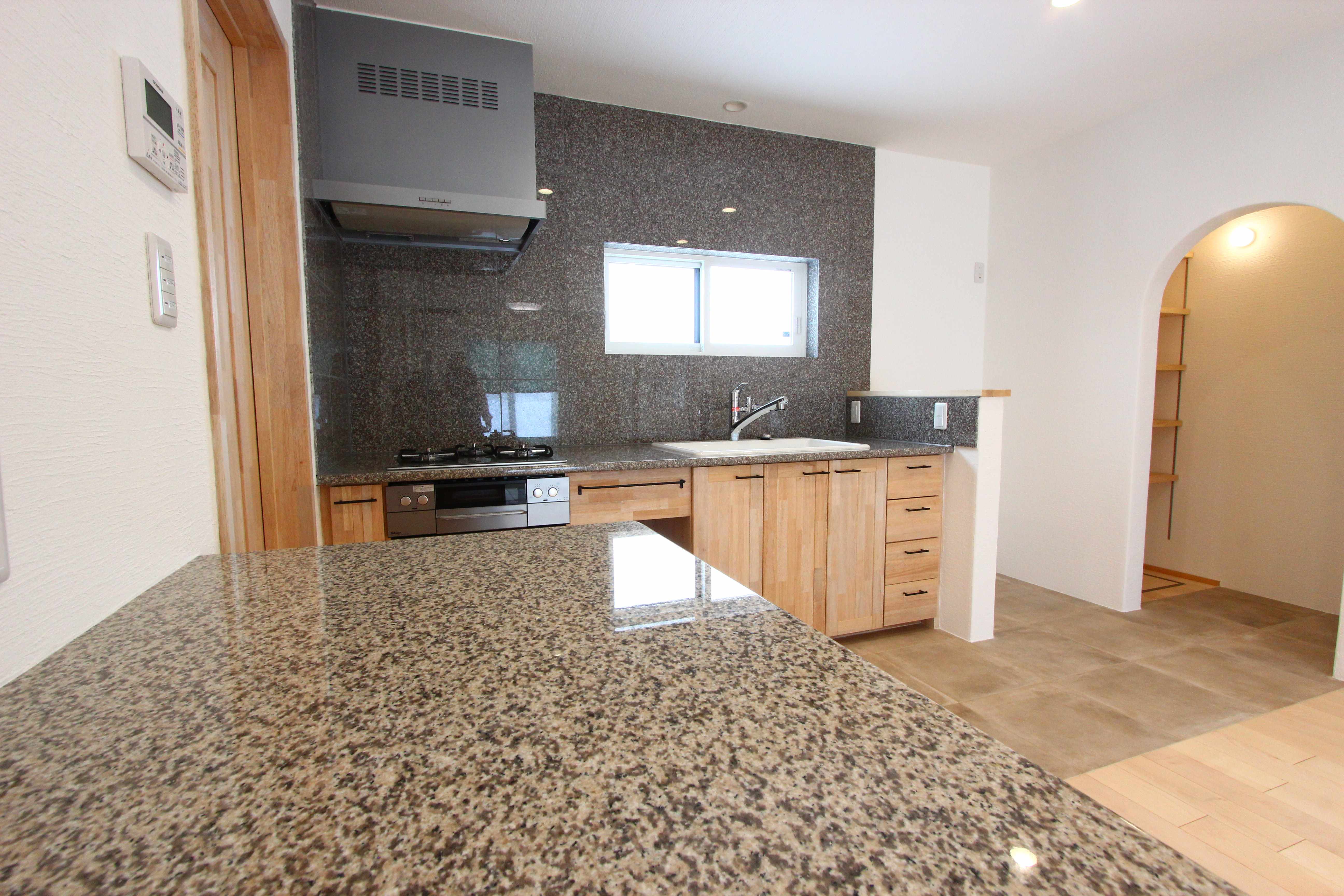 背面キッチンが一面御影石【ロイヤルパープル】を使用しており
