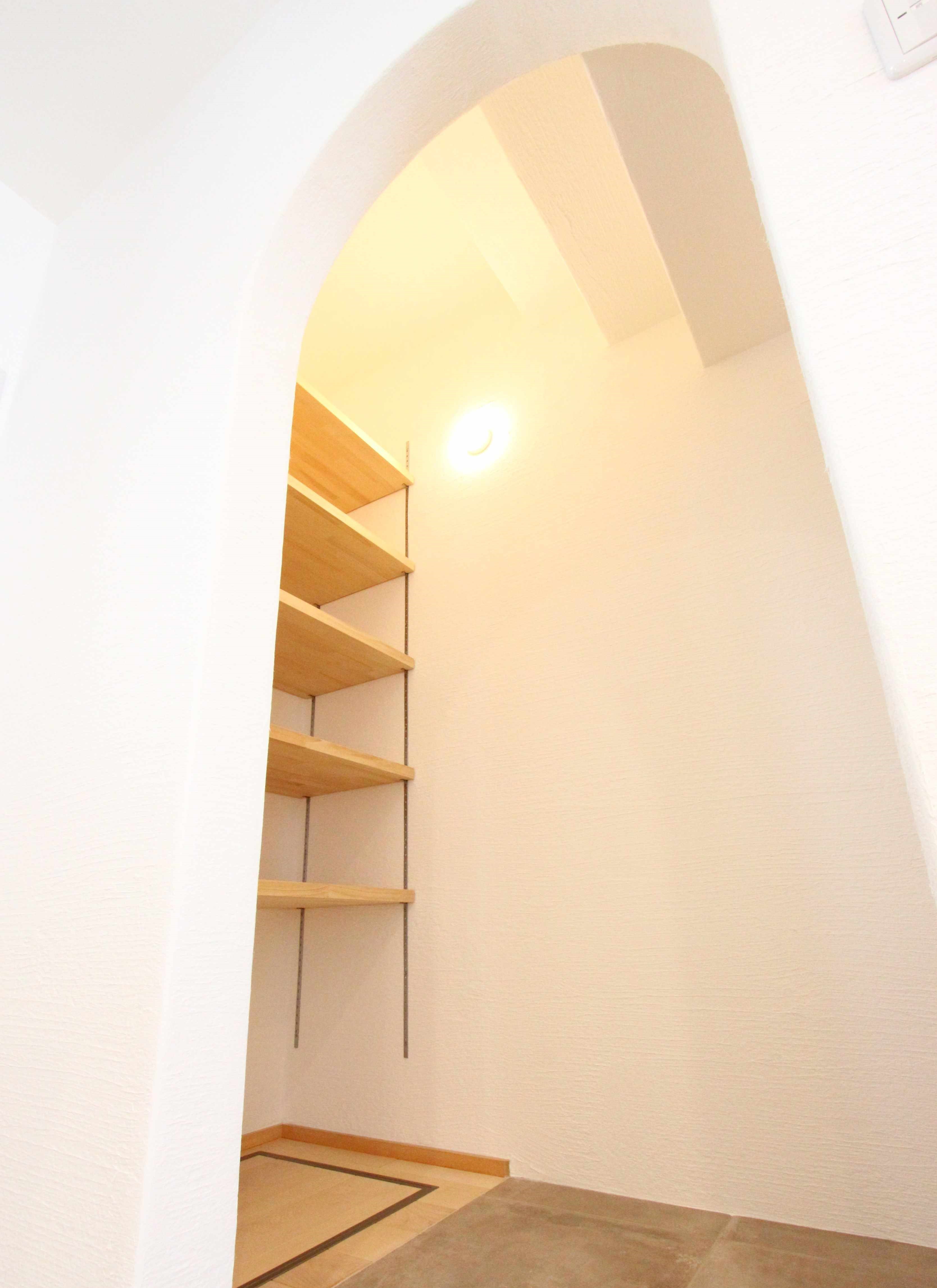 キッチン脇のパントリーは階段下のスペースを利用しました。