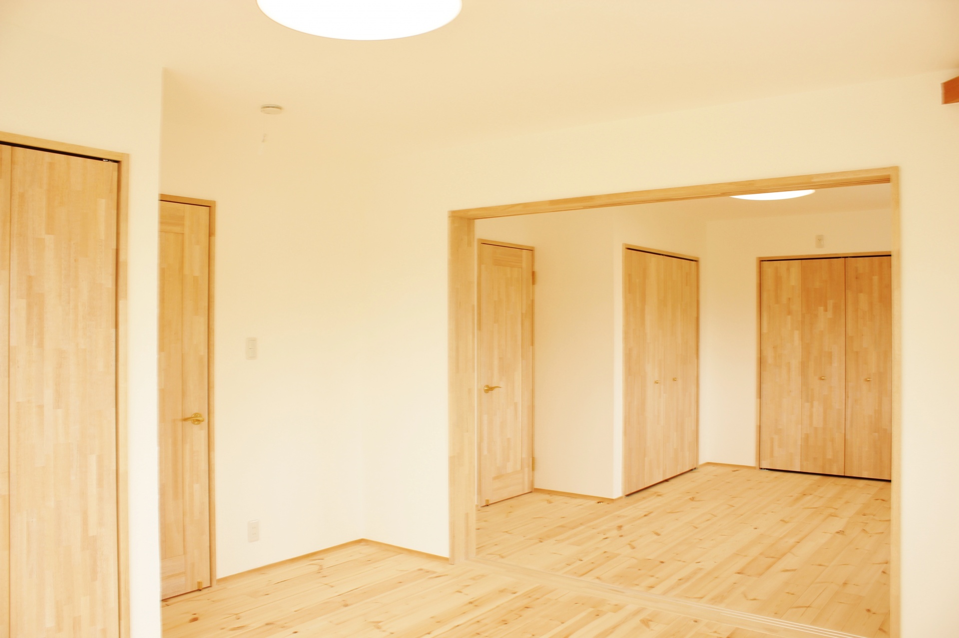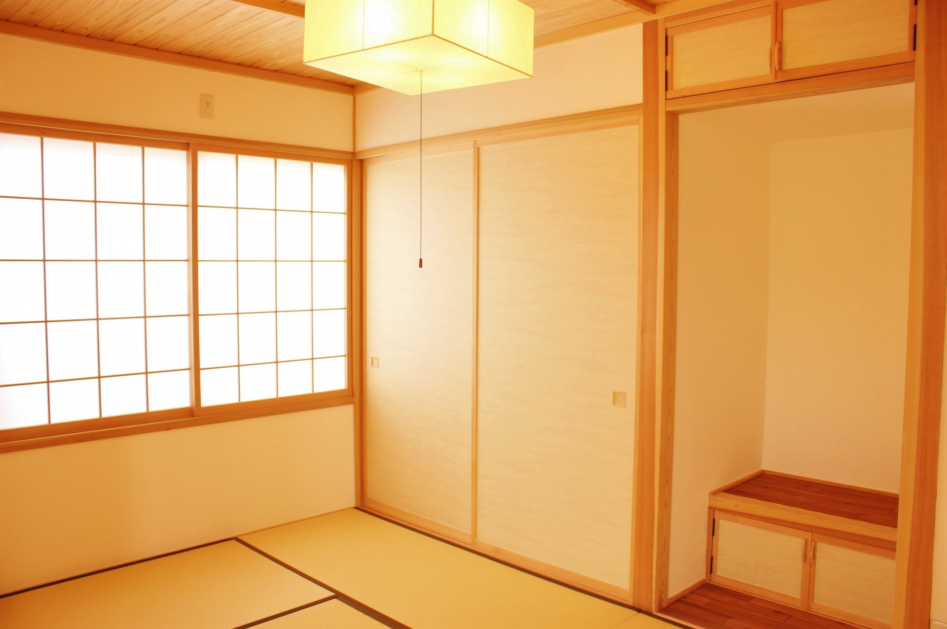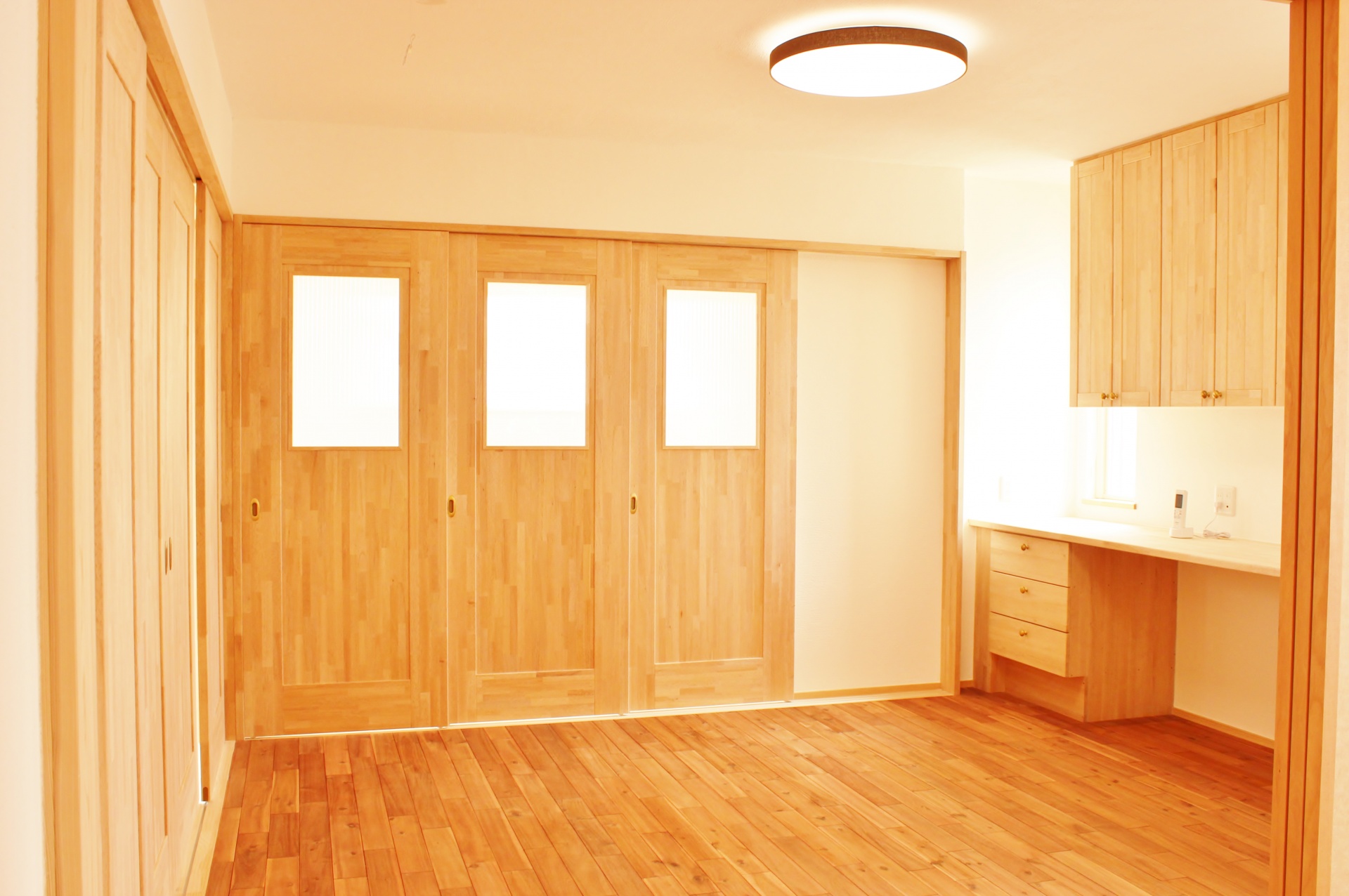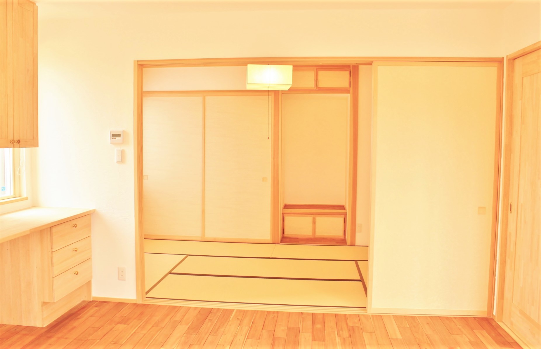 H様邸は、ご夫婦お二人で、ゆったりとした時間を過ごせる家をお建てになりました。〝くつろぎ〟にこだわったH様邸は、和室も真壁造りで本格和室に仕上げました。和室からご夫婦のプライベートルームへつながります。襖3枚を引き込めるので、開口部が大きく奥行のある空間です。ご気分によって、洋室でも、和室でもくつろぎを選べます。