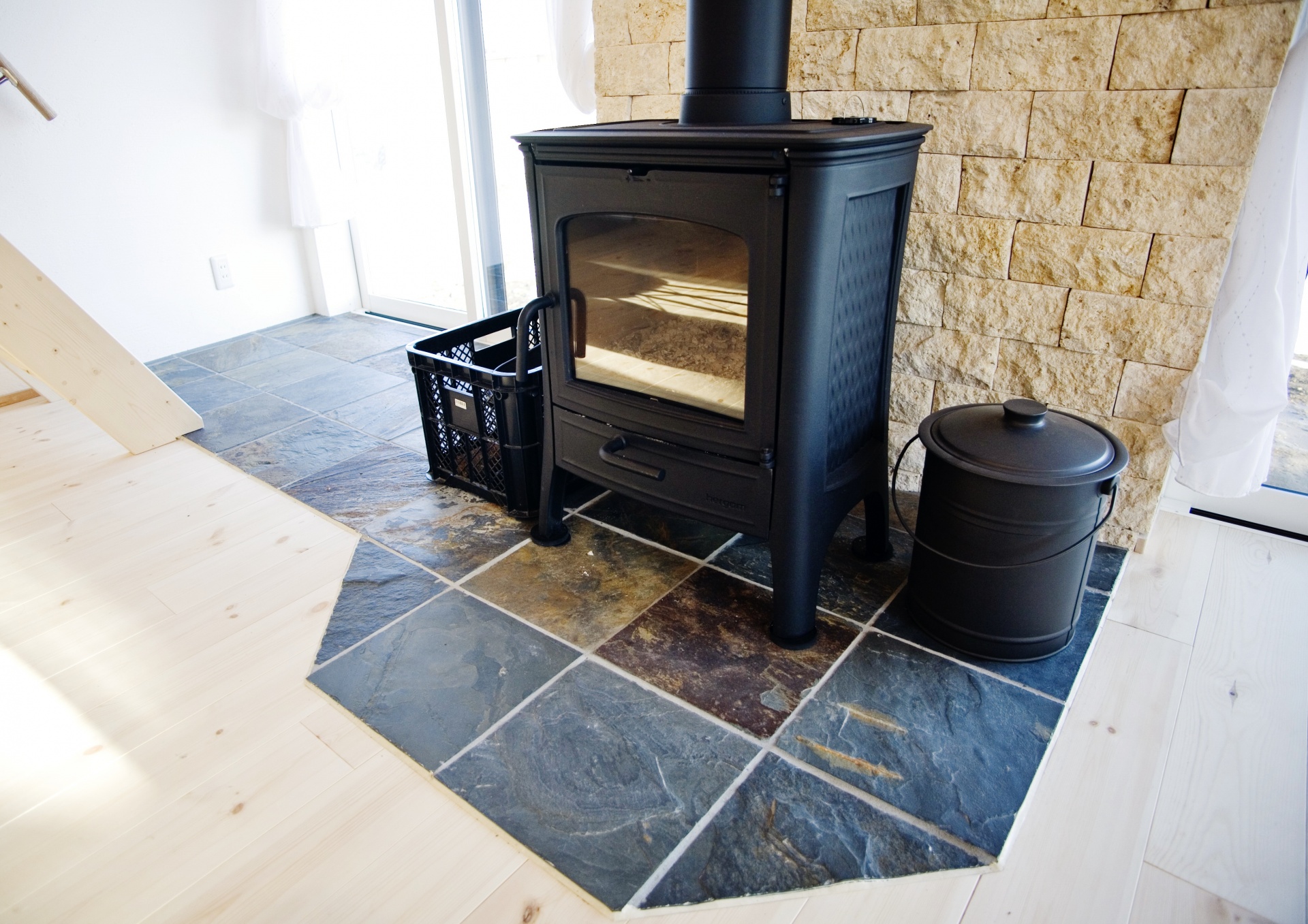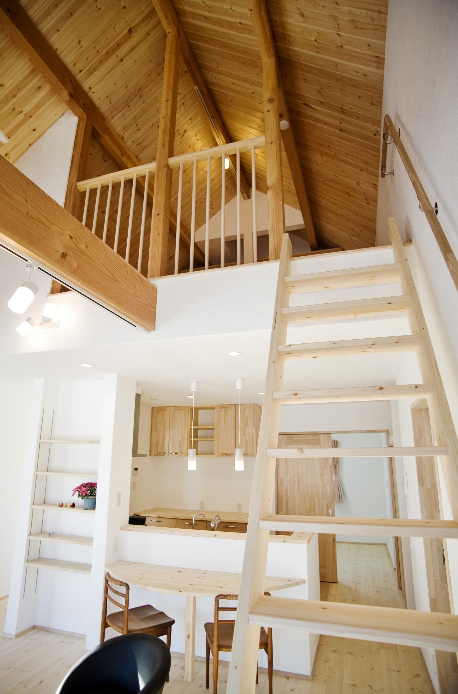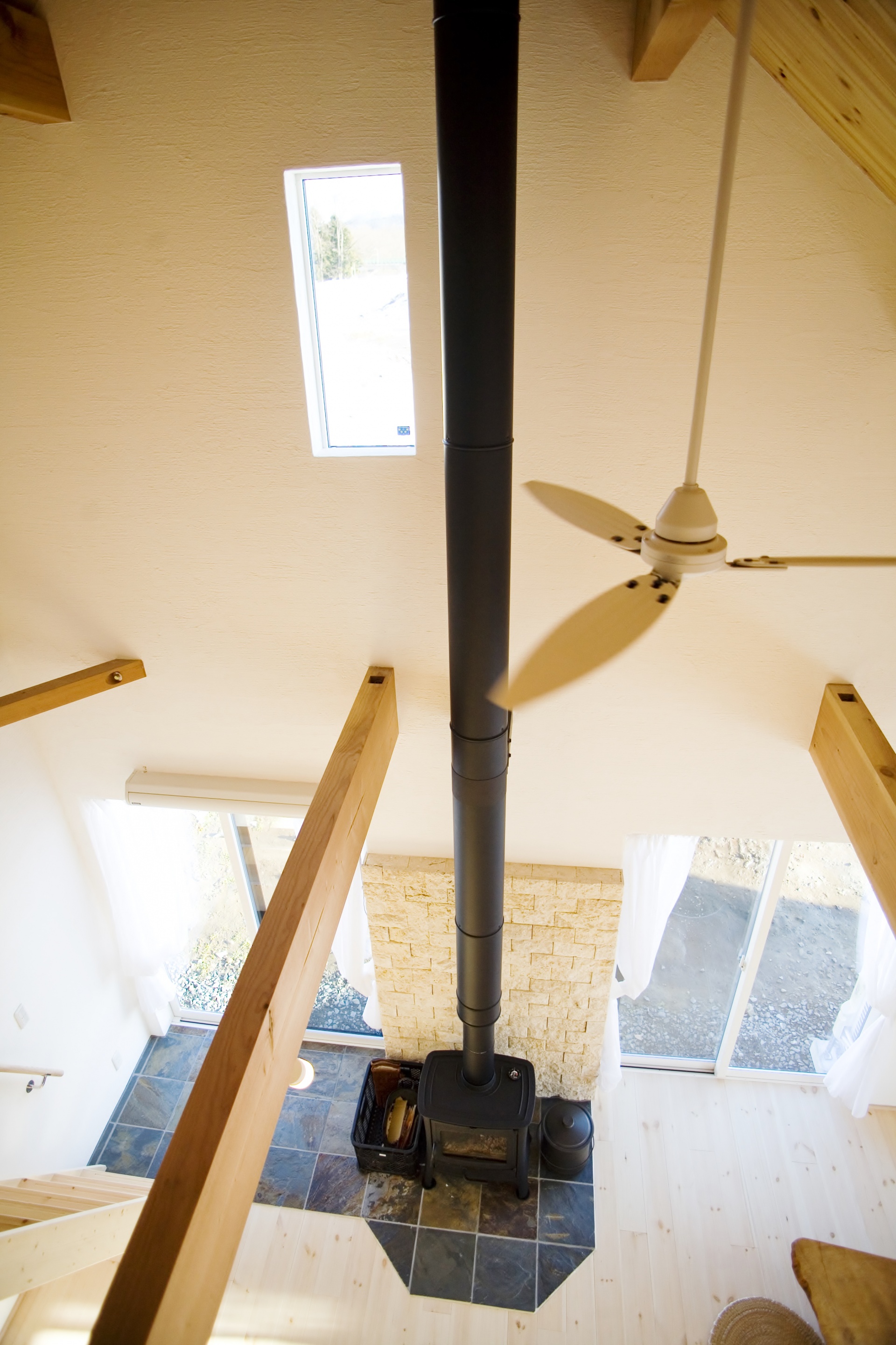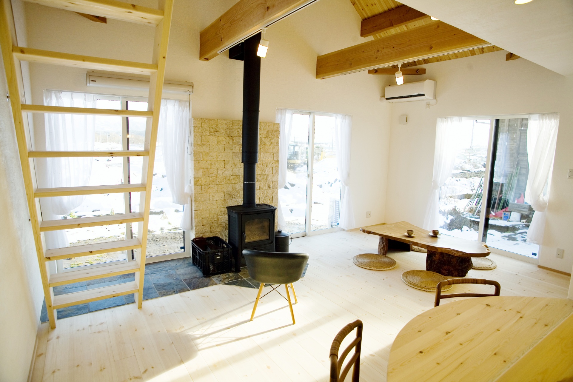 親御さんご夫妻のお宅は、急勾配の石屋根に薪ストーブの煙突が山小屋を思わせる外観です。林檎農家のS様、林檎栽培の際に剪定されるリンゴの枝を薪として利用します。