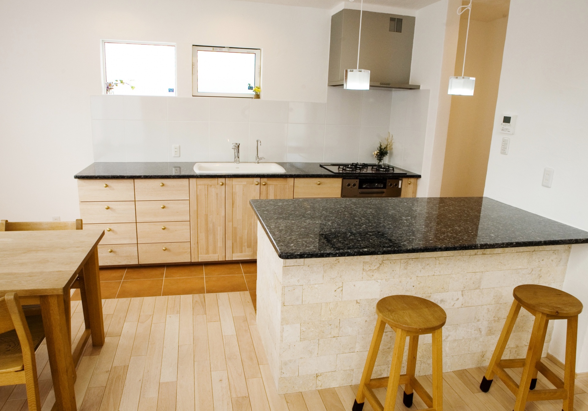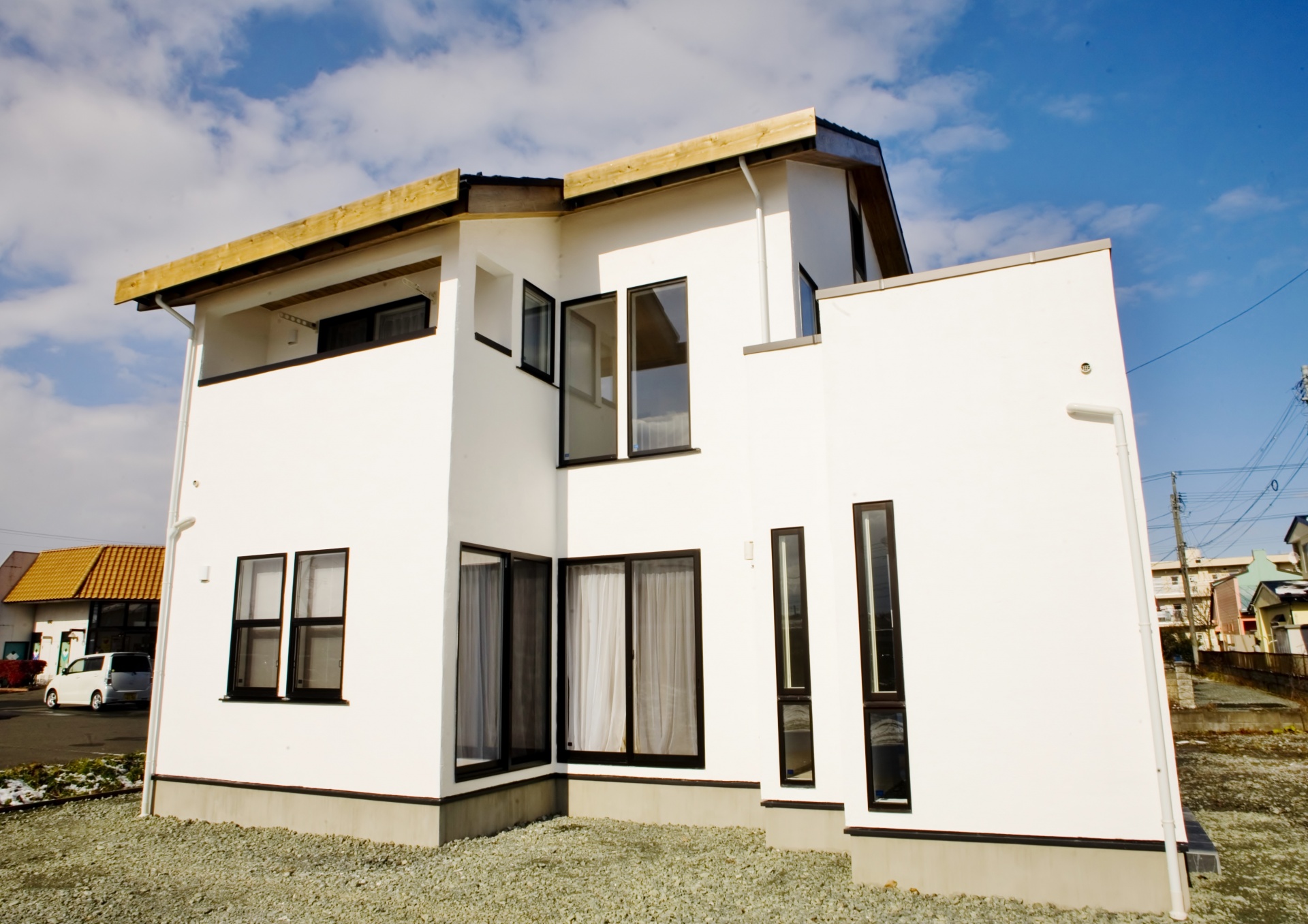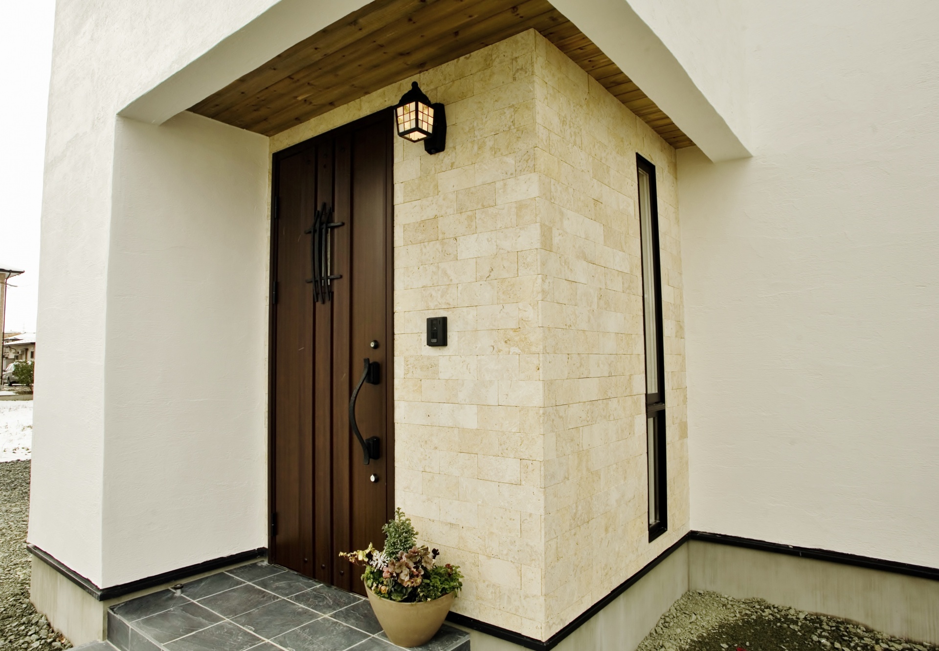 スタイリッシュな外観が目を引き、漆喰・無垢材・コーラルストーンが映える無添加住宅。