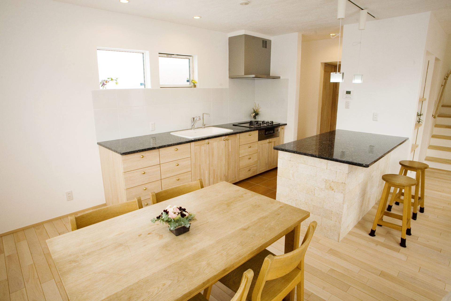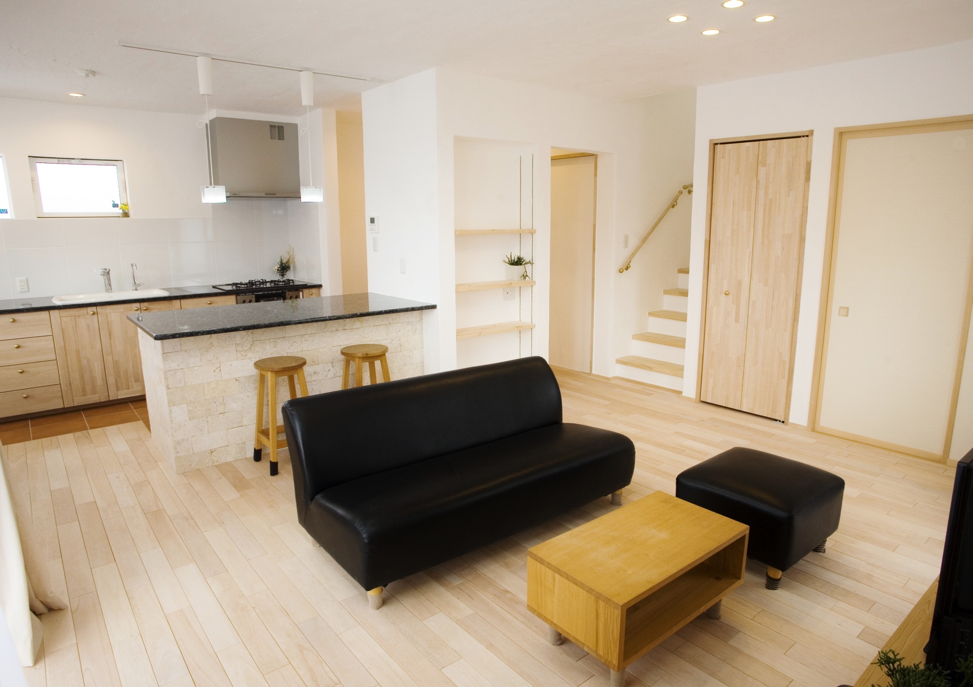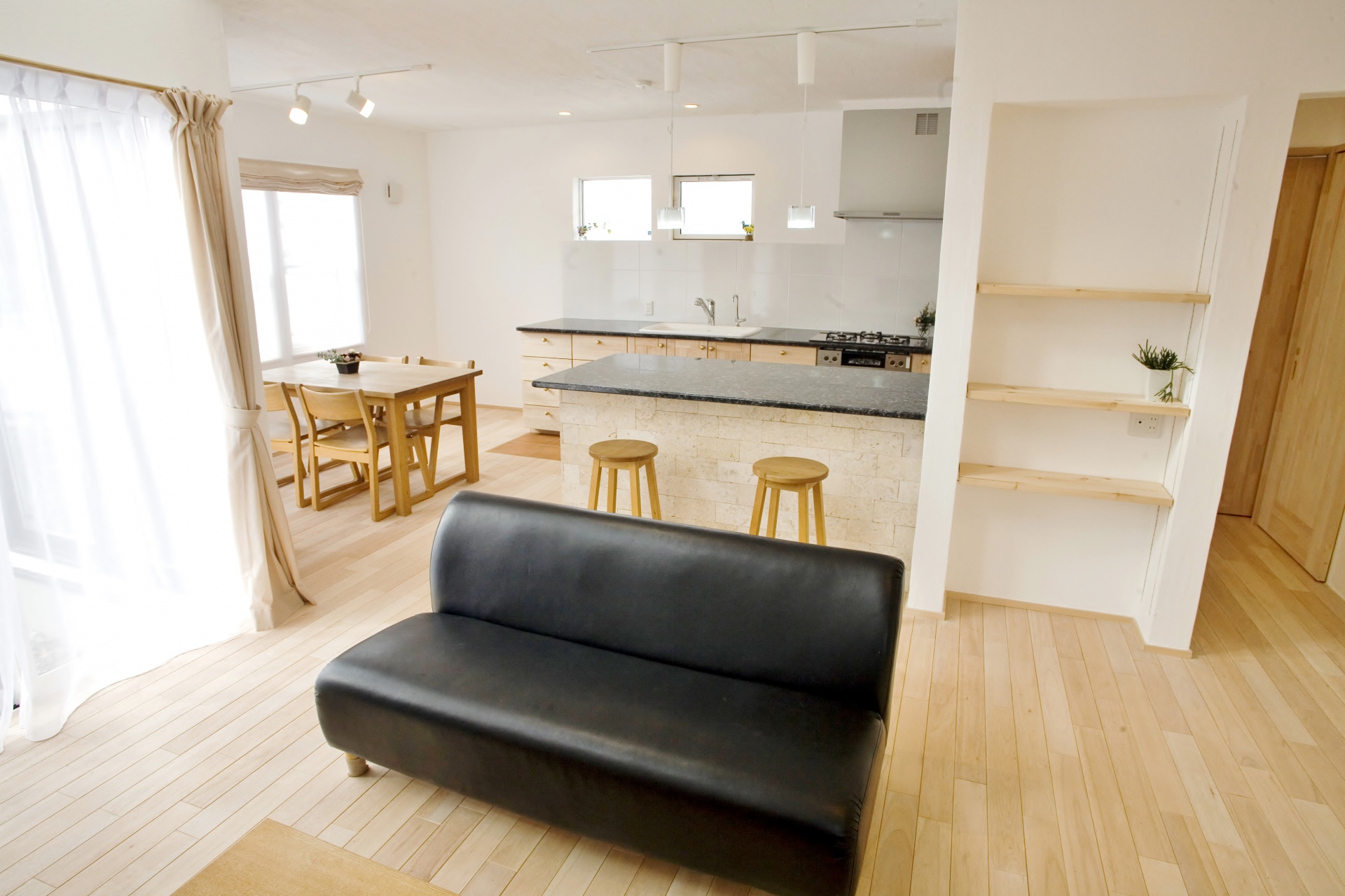 スタイリッシュな外観が目を引き、漆喰・無垢材・コーラルストーンが映える無添加住宅。