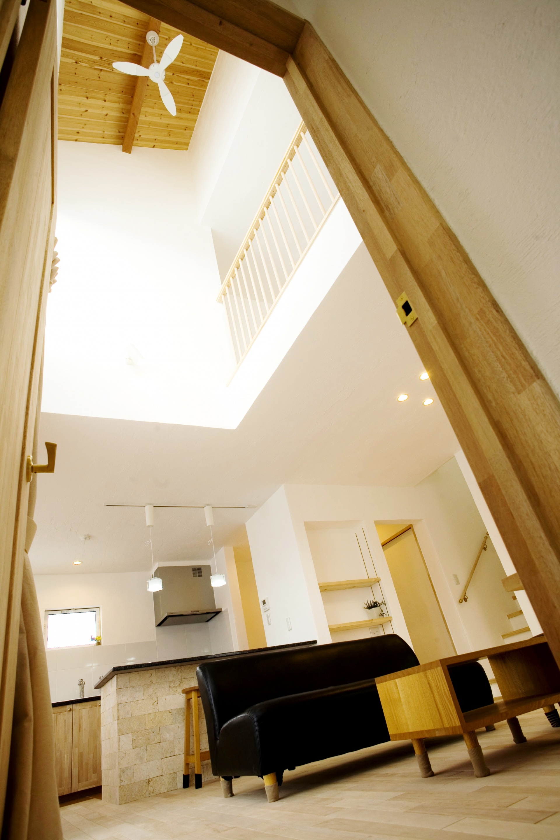 リビングに足を踏み入れると高い天井から日差しが明るく差し込んでいます。漆喰、無垢材、そして天然石が優しく美しい風合いのコントラストを造りだしています。