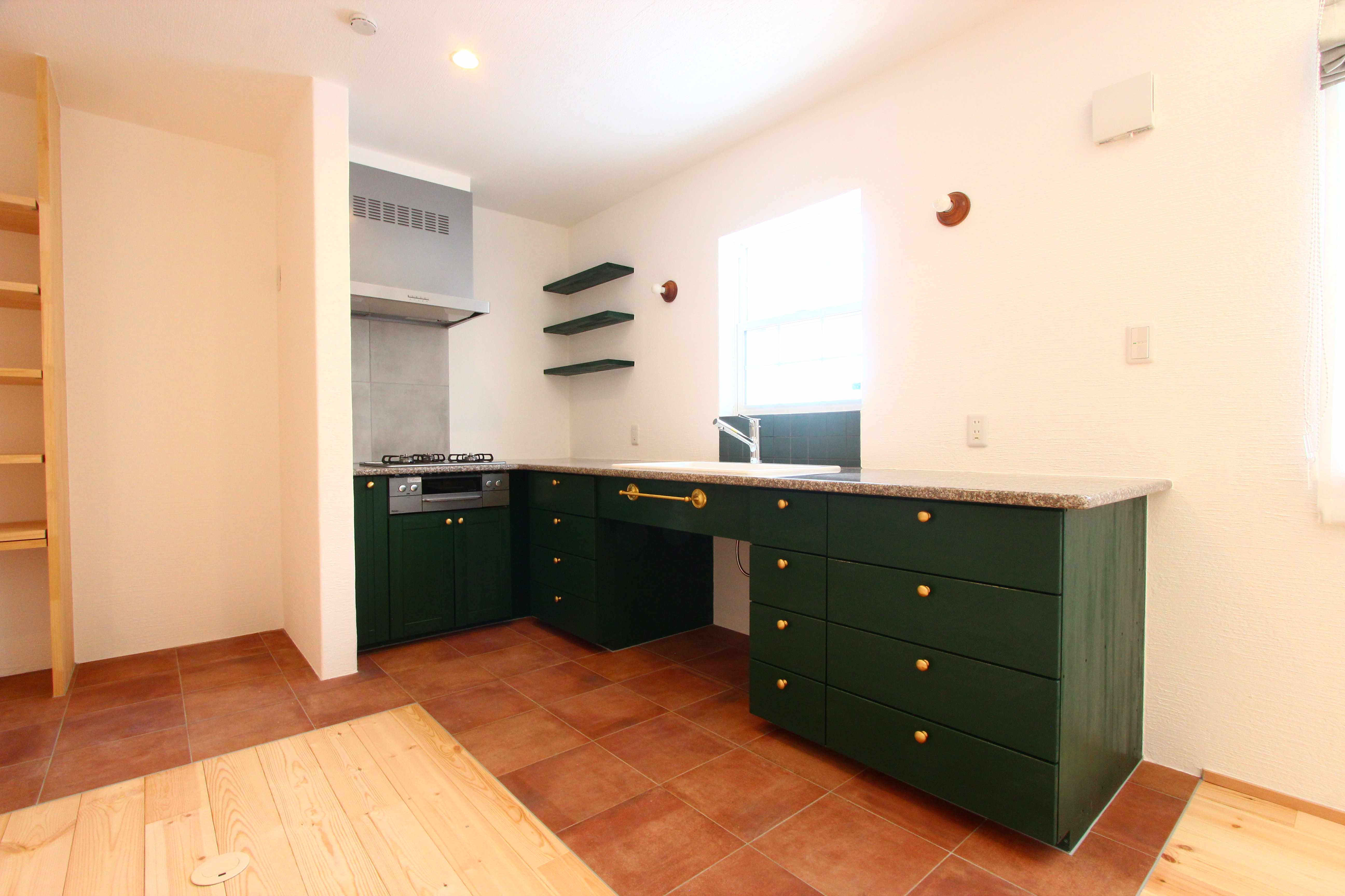 グリーンのキッチンがかわいい自然素材100%のお家