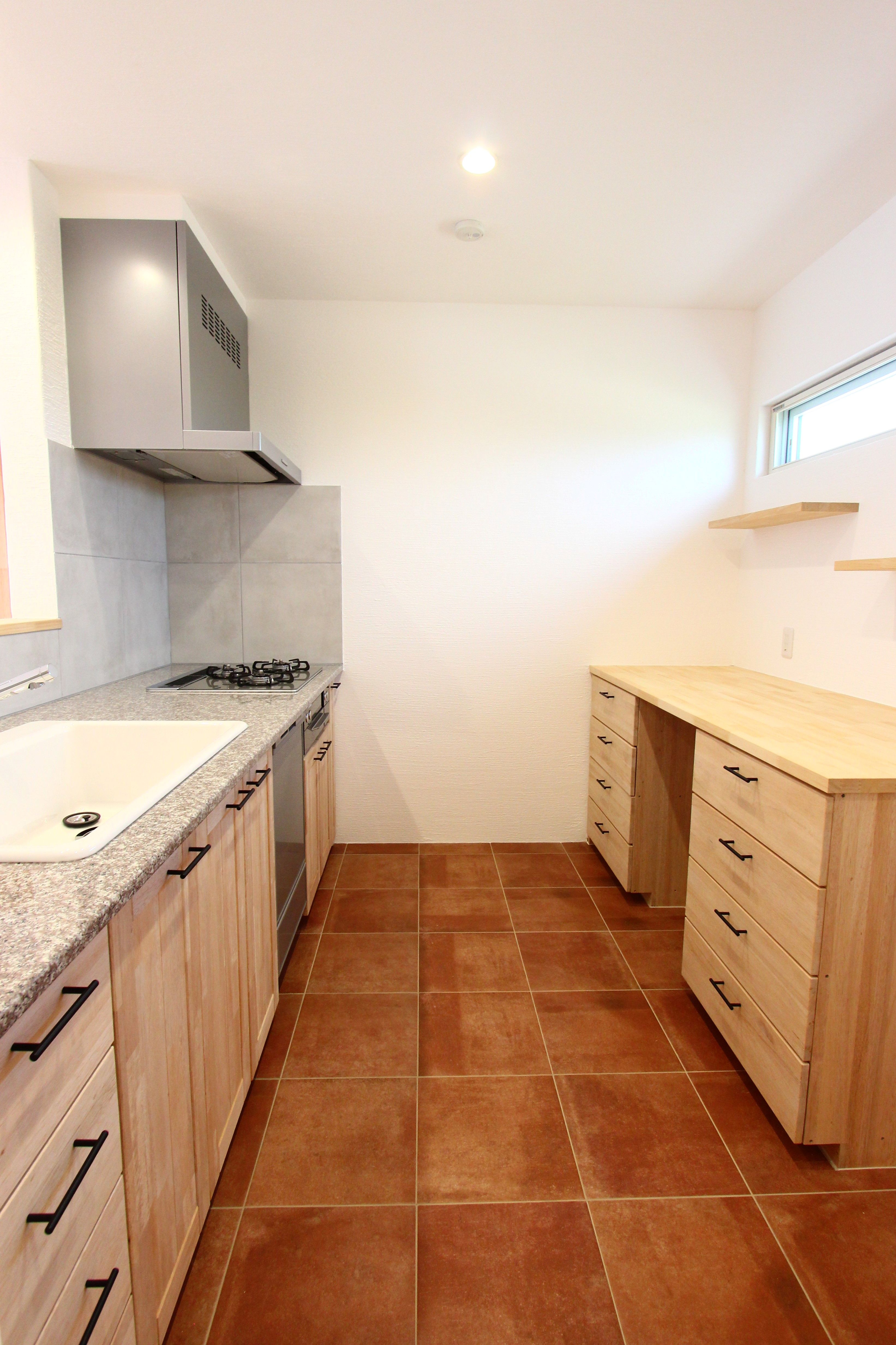 あたたかみのあるキッチン床です。テラコッタ調が人気のタイルです。