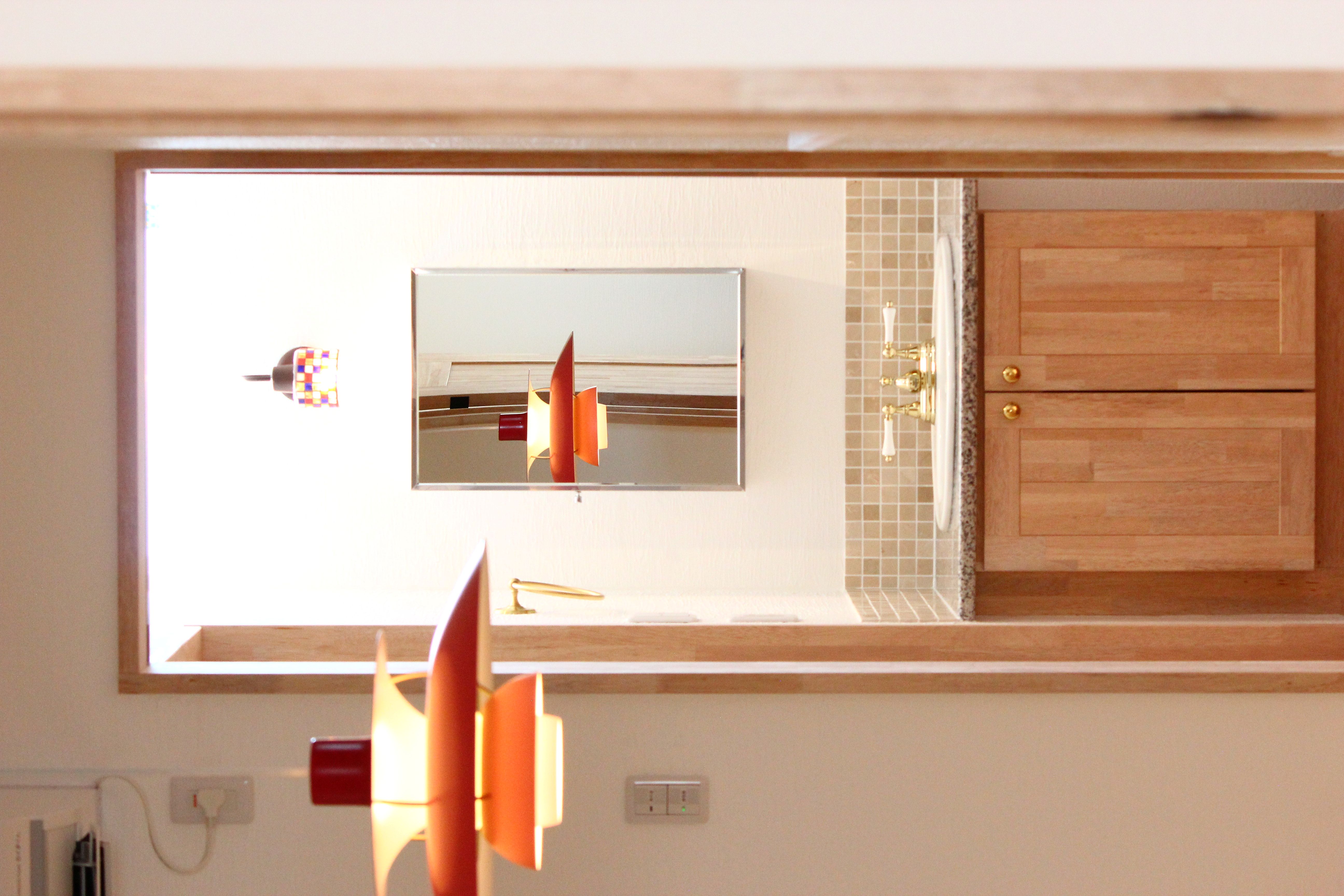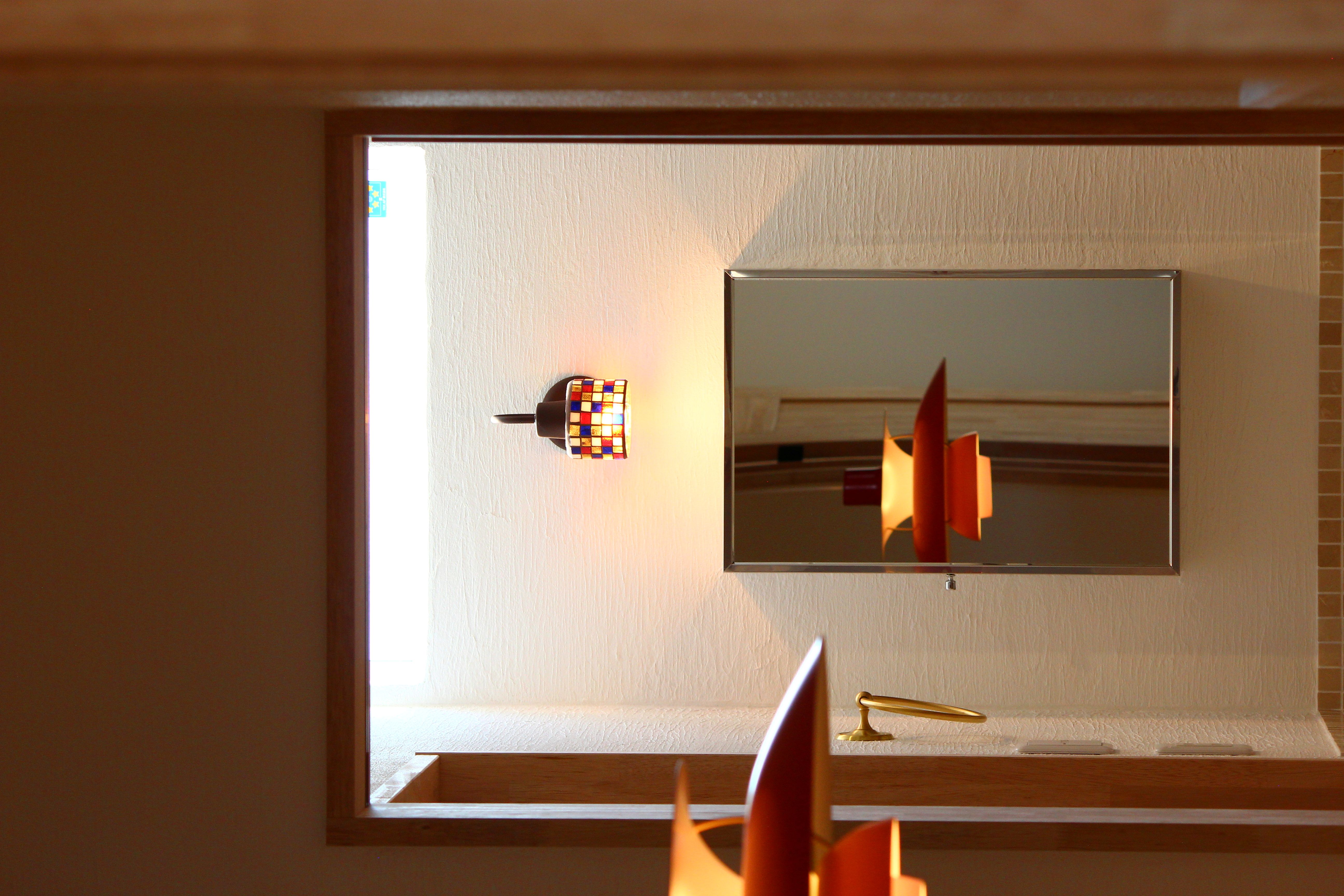 御影石の洗面台に、立ち上がりのタイルは、大理石のモザイクタイルです。やわらかな赤がやさしいですね。