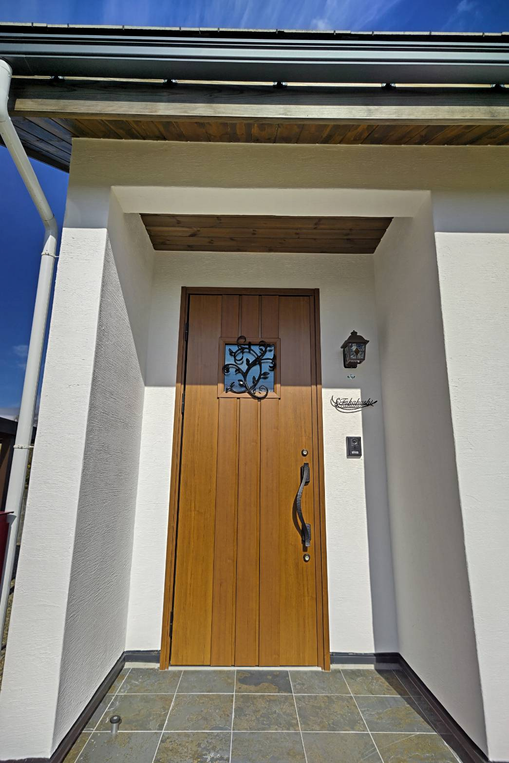 帰ってきたときに、うれしくなるようなそんな玄関ポーチになりました。照明とドア、アイアンの表札がお洒落ですね。
