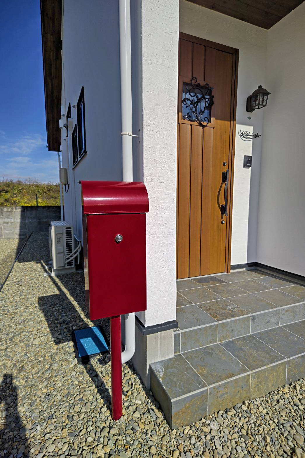 濃い赤がかわいいポストです!漆喰に映えますね。