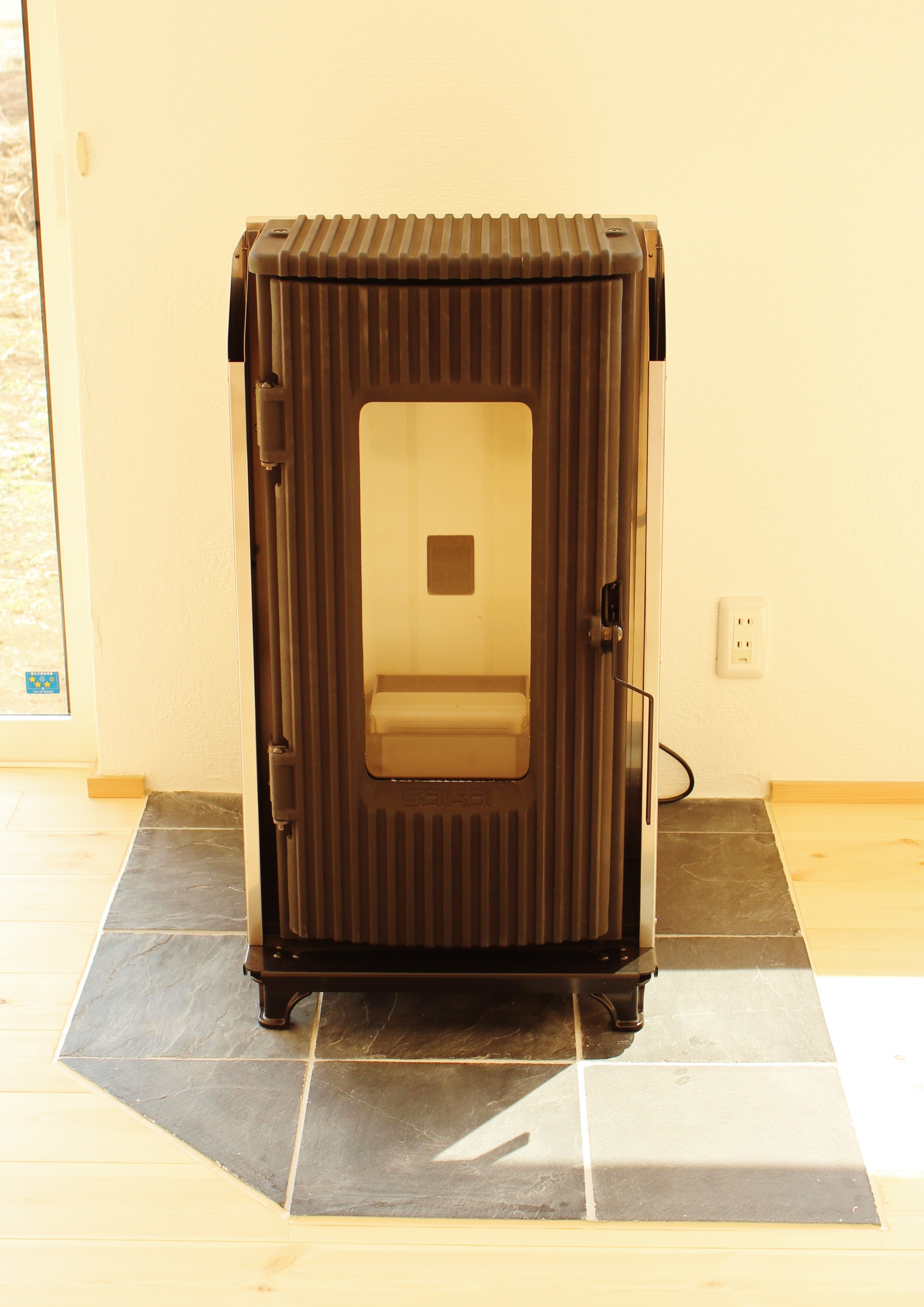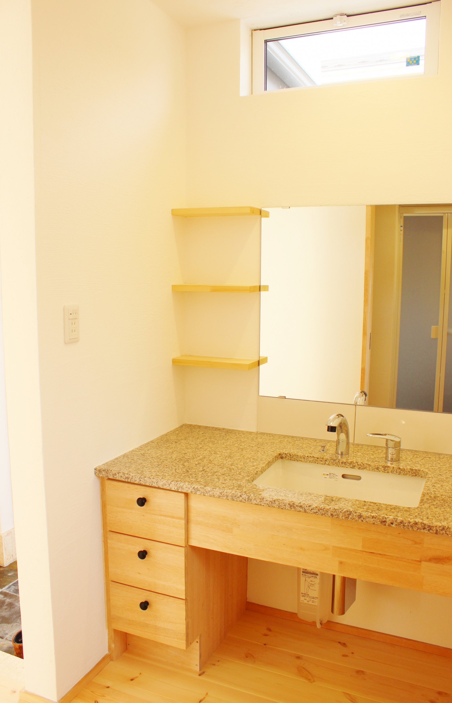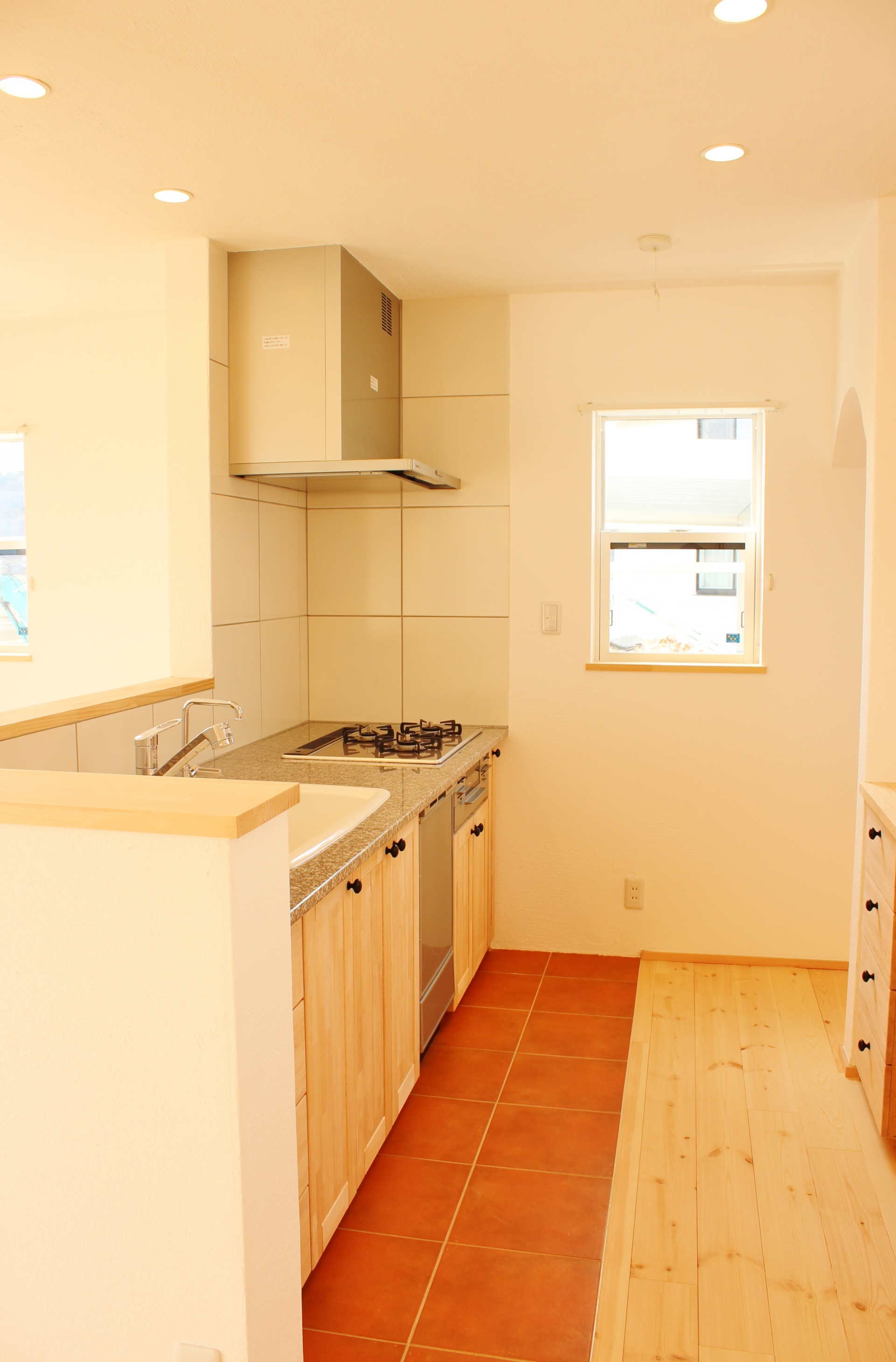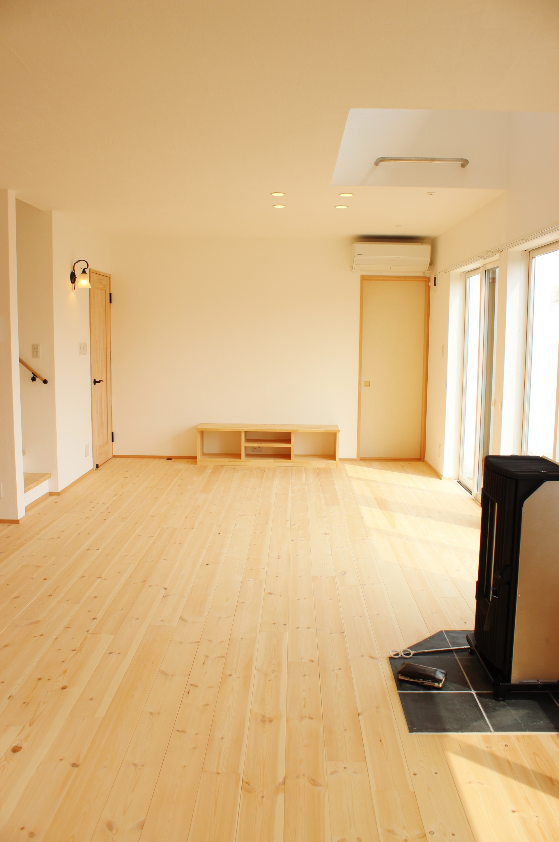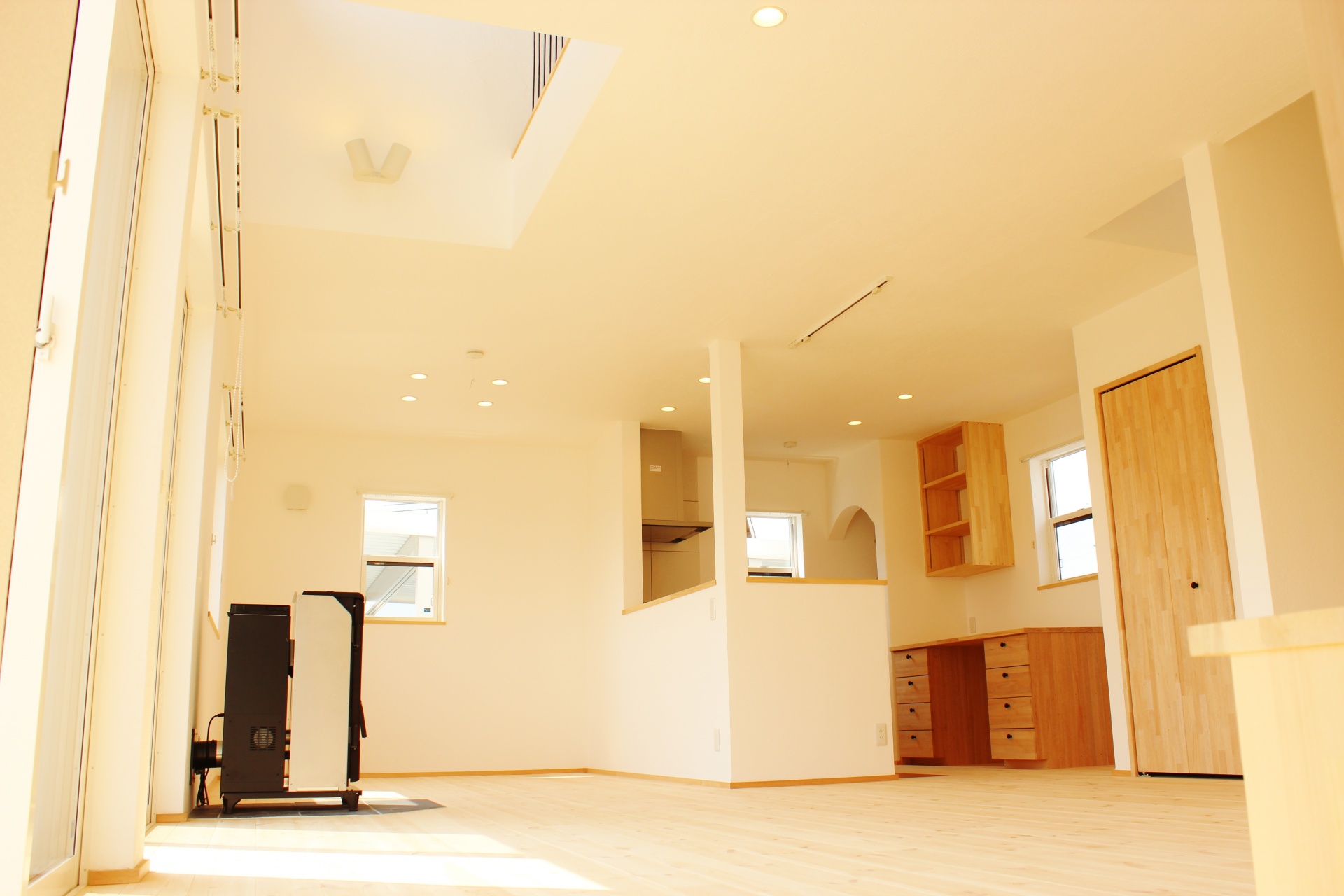 天然素材をふんだんに使っているから、自然の景色に溶け込むのですね。南側の田園風景を望む光が差し込む明るいリビング。奥はキッチンです。キッチン横にダイニングテーブルが配置されます。ダイニングテーブルが置かれることにより、キッチン内や冷蔵庫などが程よく目隠しされる配置です。キッチンと対面のプレイルームでは