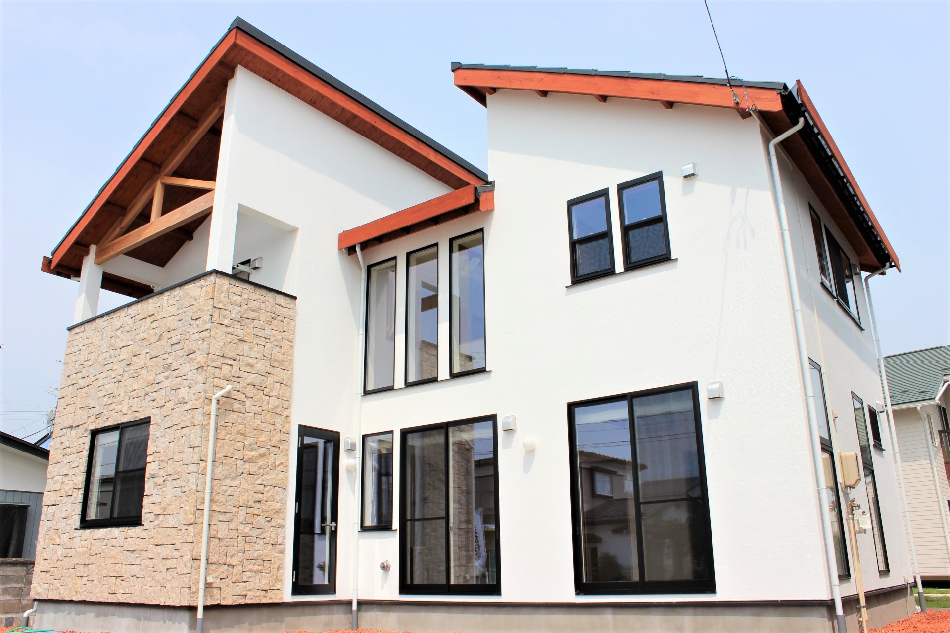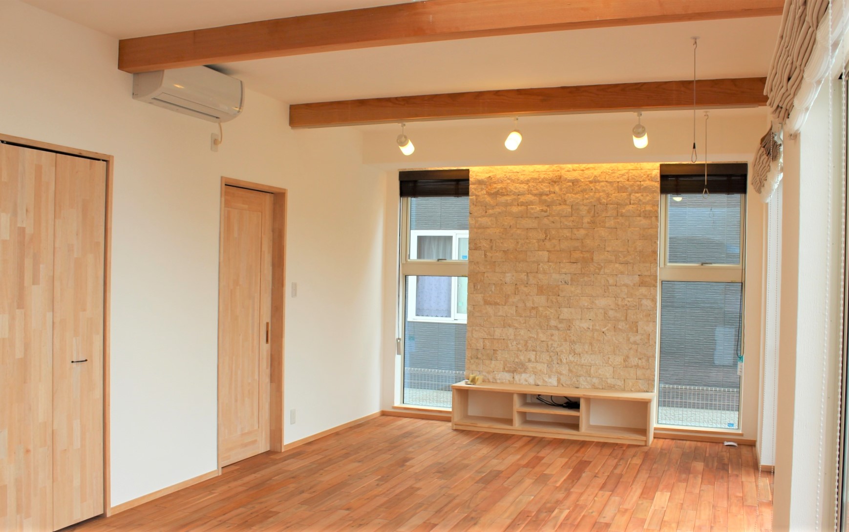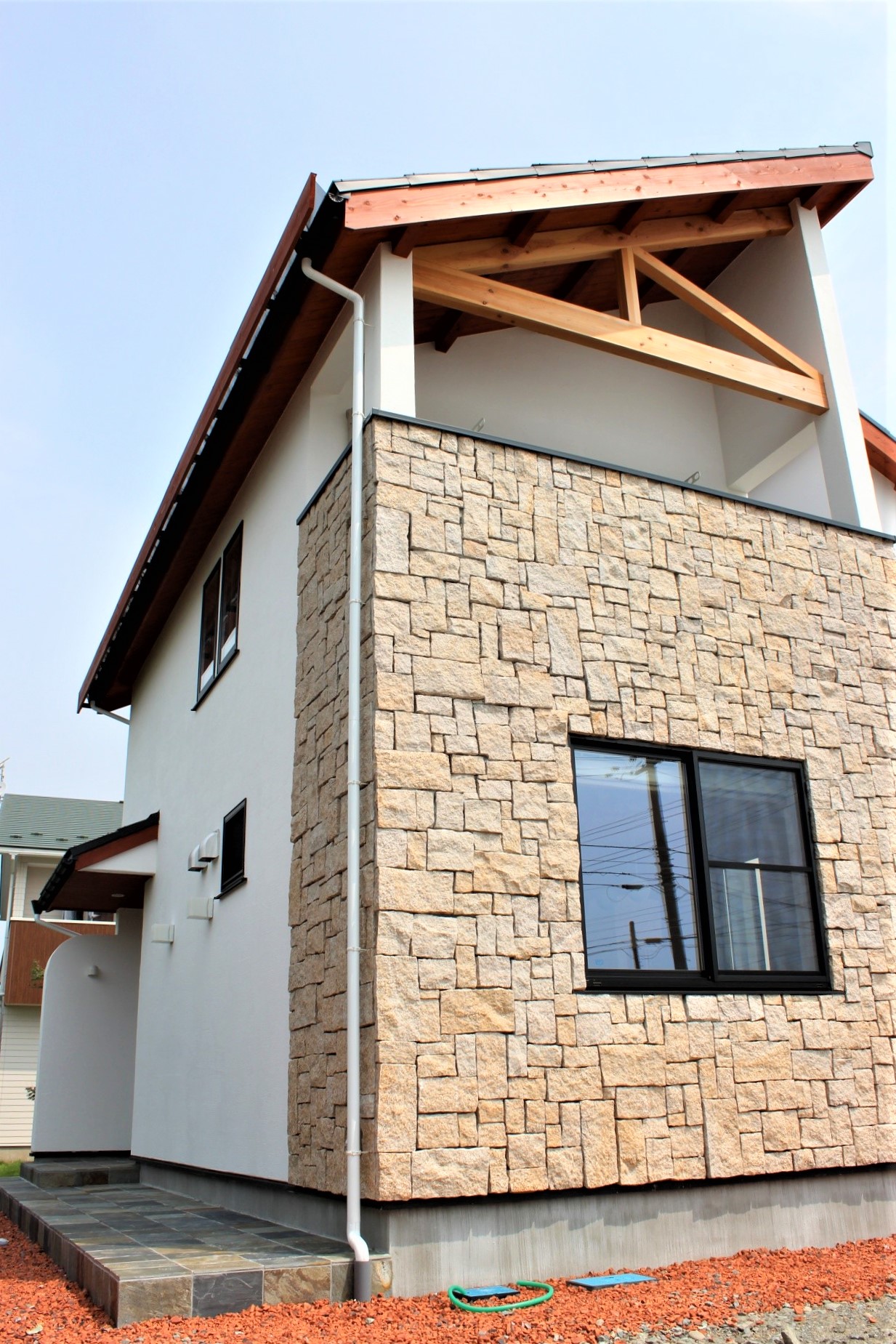 無垢材表しと石貼りの外観が特徴的で、随所にアクセントで天然石を使用して高級感のあるオンリーワン住宅。