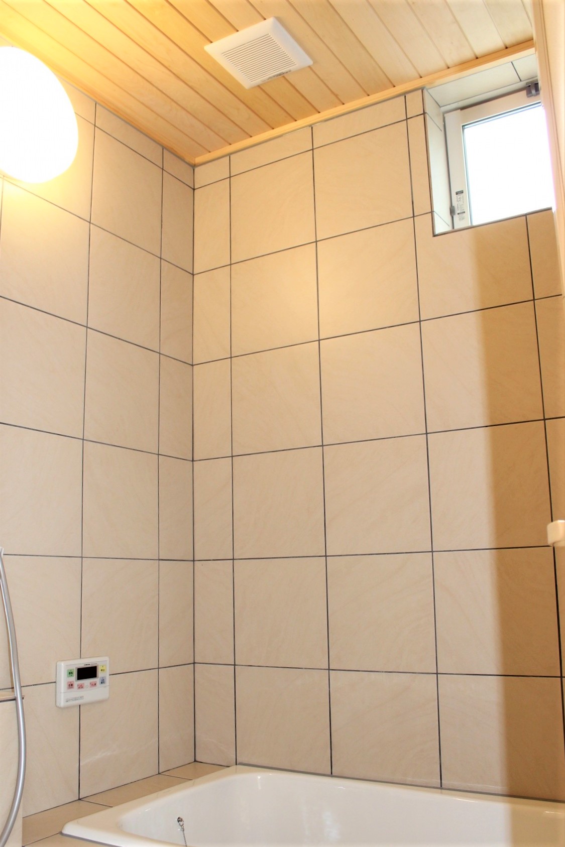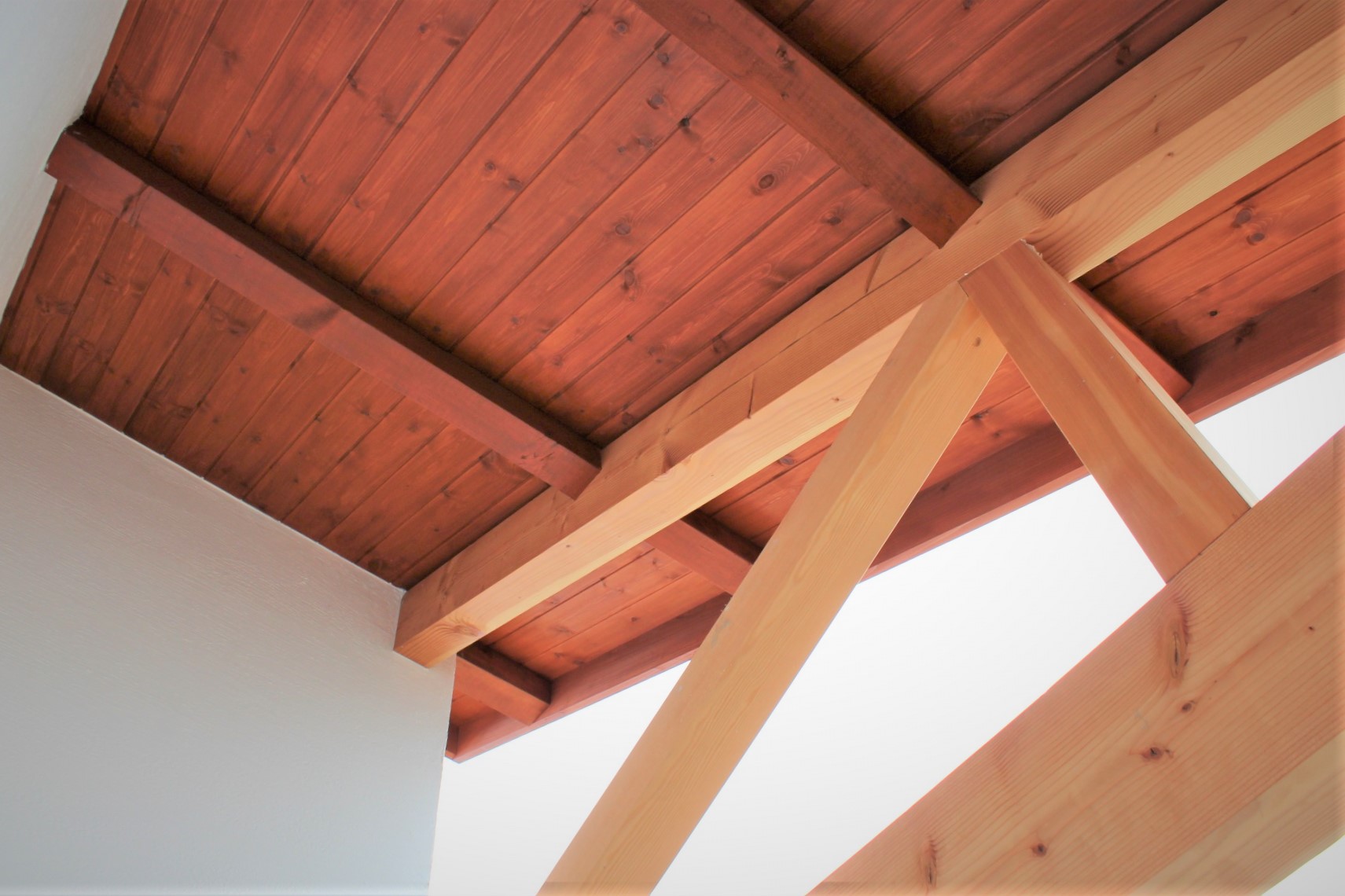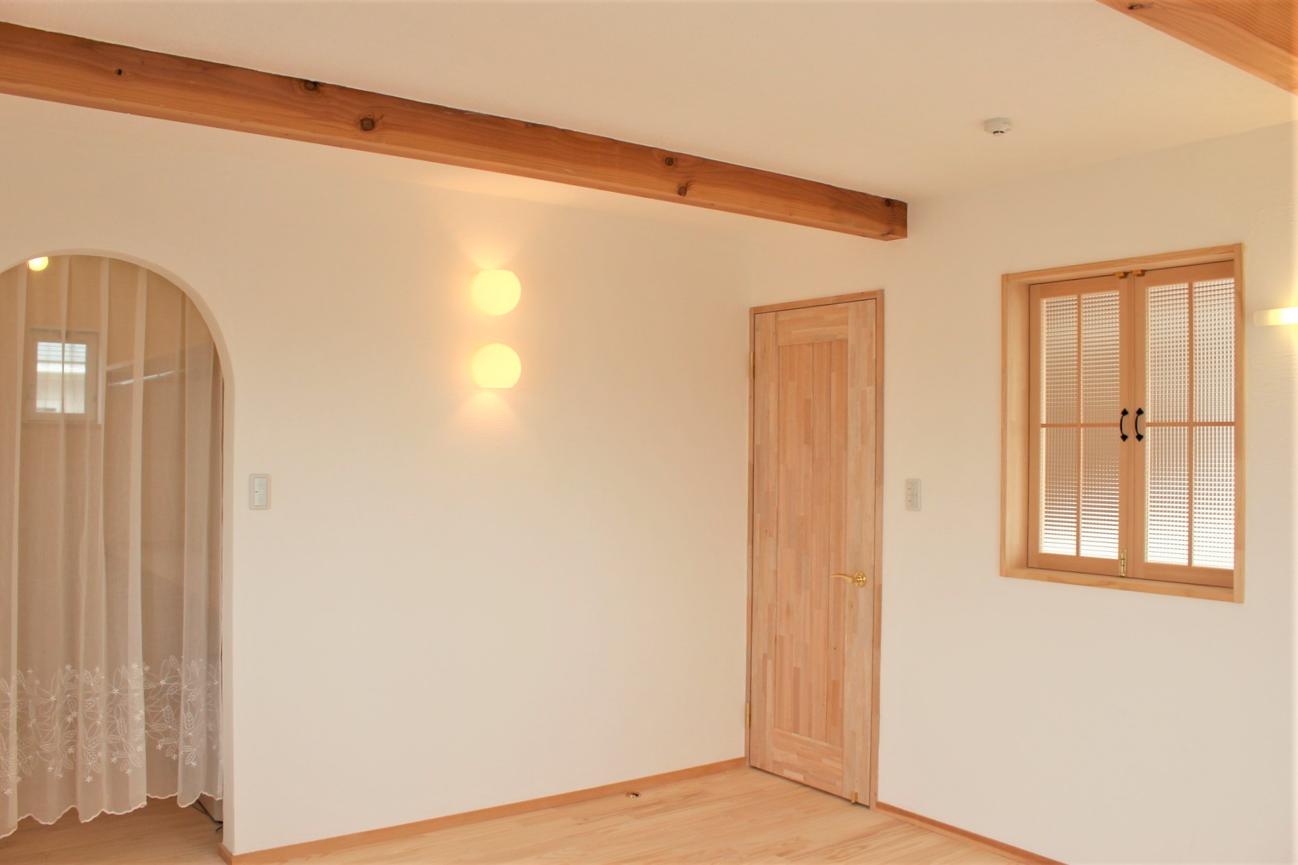 特にも特徴的なのが石屋根。外観にアクセントを与える石貼りの壁。(錆バラ)漆喰と木製の破風板、石貼りの壁、日の光を際限なく取り込む窓、そして石屋根。