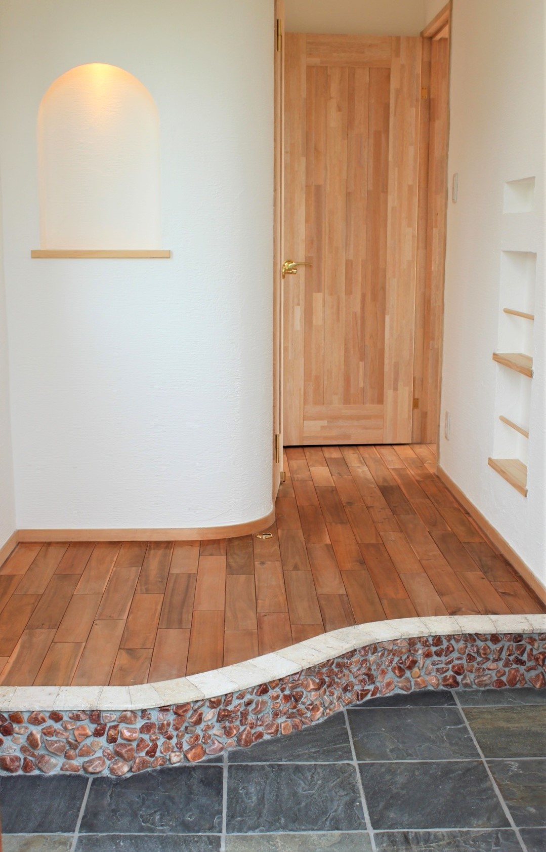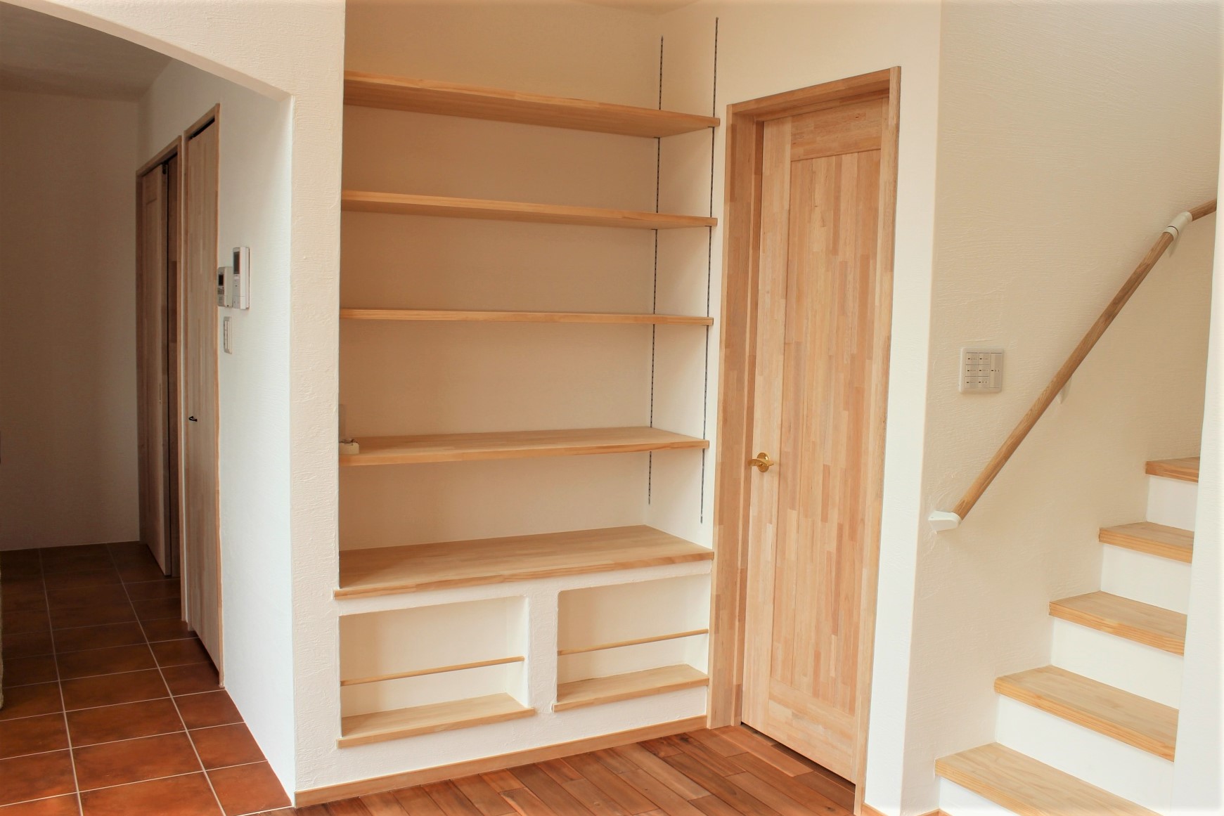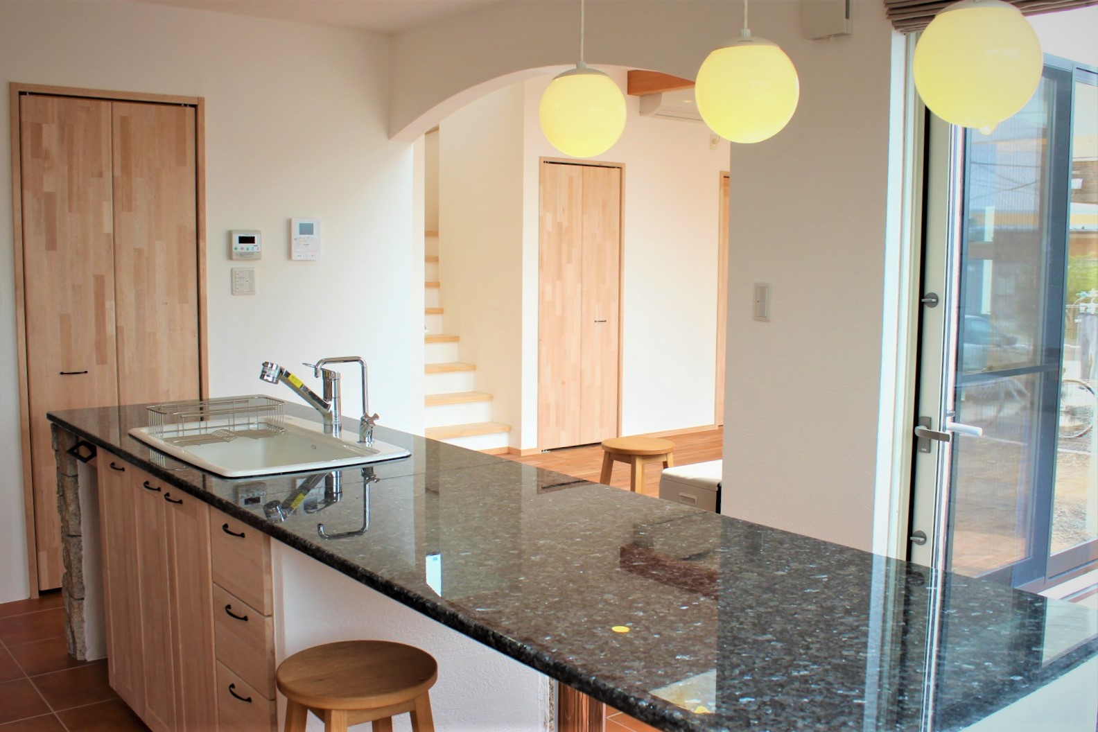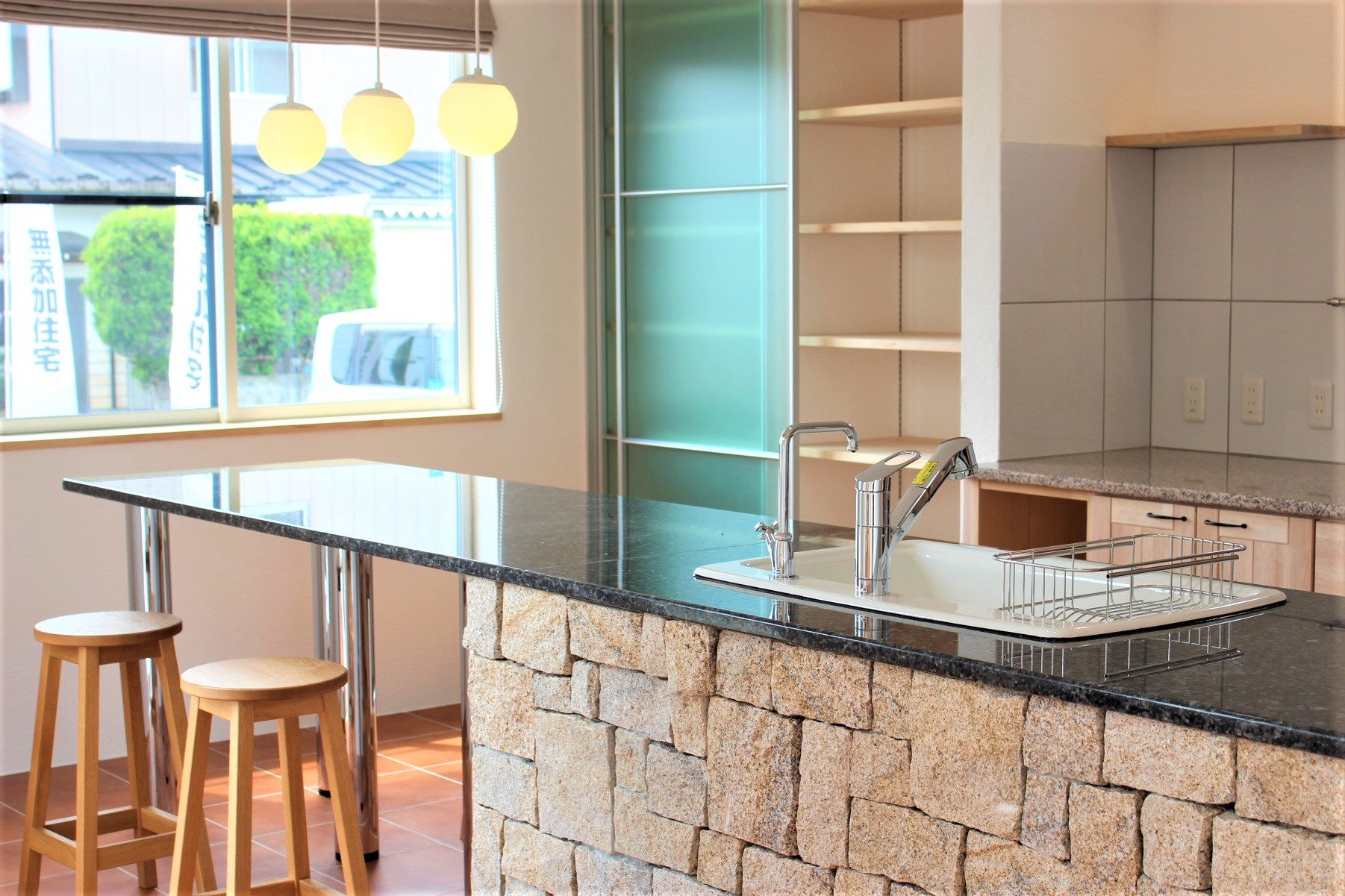 内部にも天然石がアクセントとして使われていて表情を豊かにしています。動線は玄関からパントリーへ、その先はキッチンへとつながり家事の負担を軽減します。
