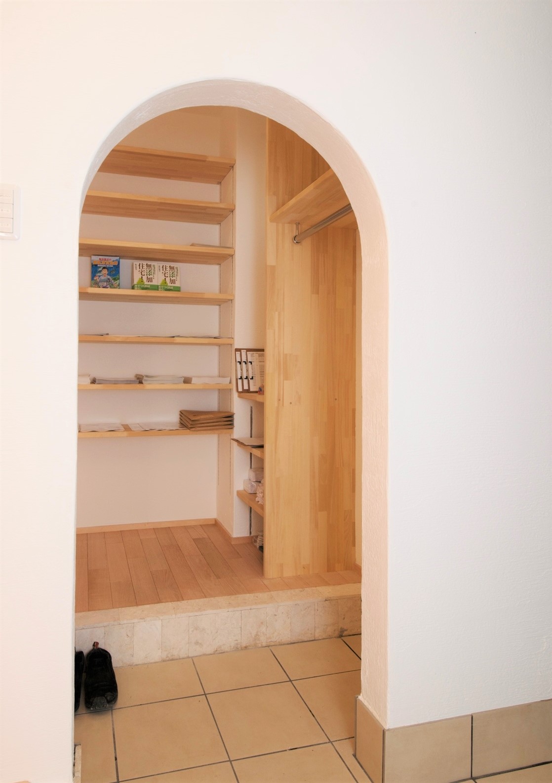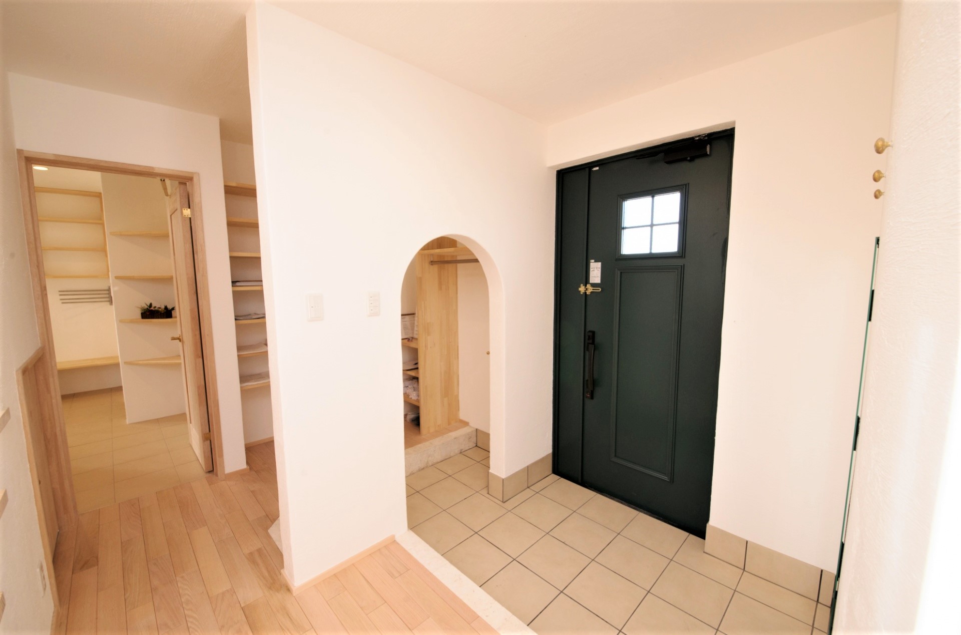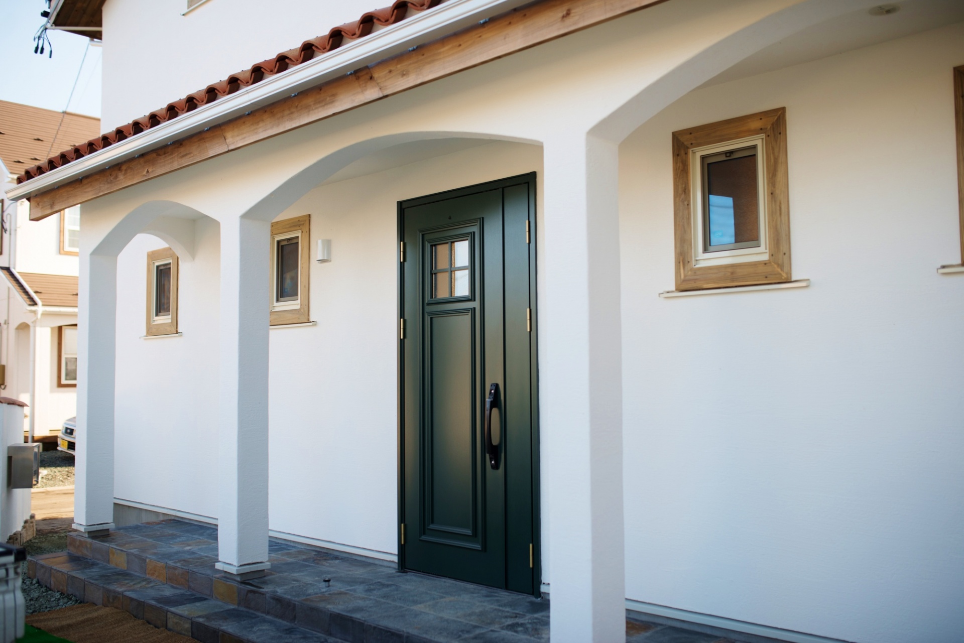 建物正面では緩くつながる三連のアールの開口、木枠に縁どられた窓が並んだ美しいエントランスに迎えられます。広い玄関ポーチは石畳みのように天然石独特のニュアンスを醸し出しています。