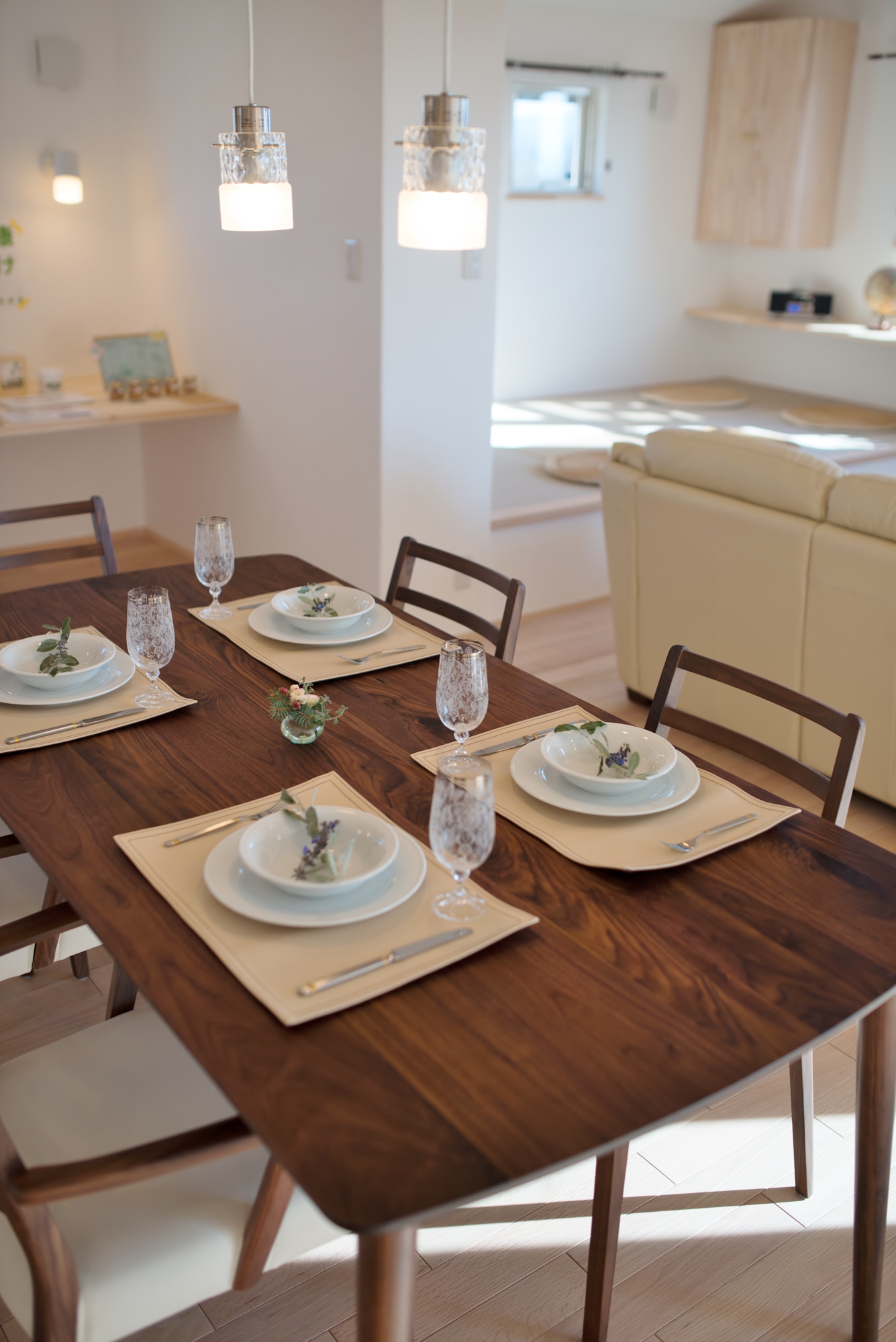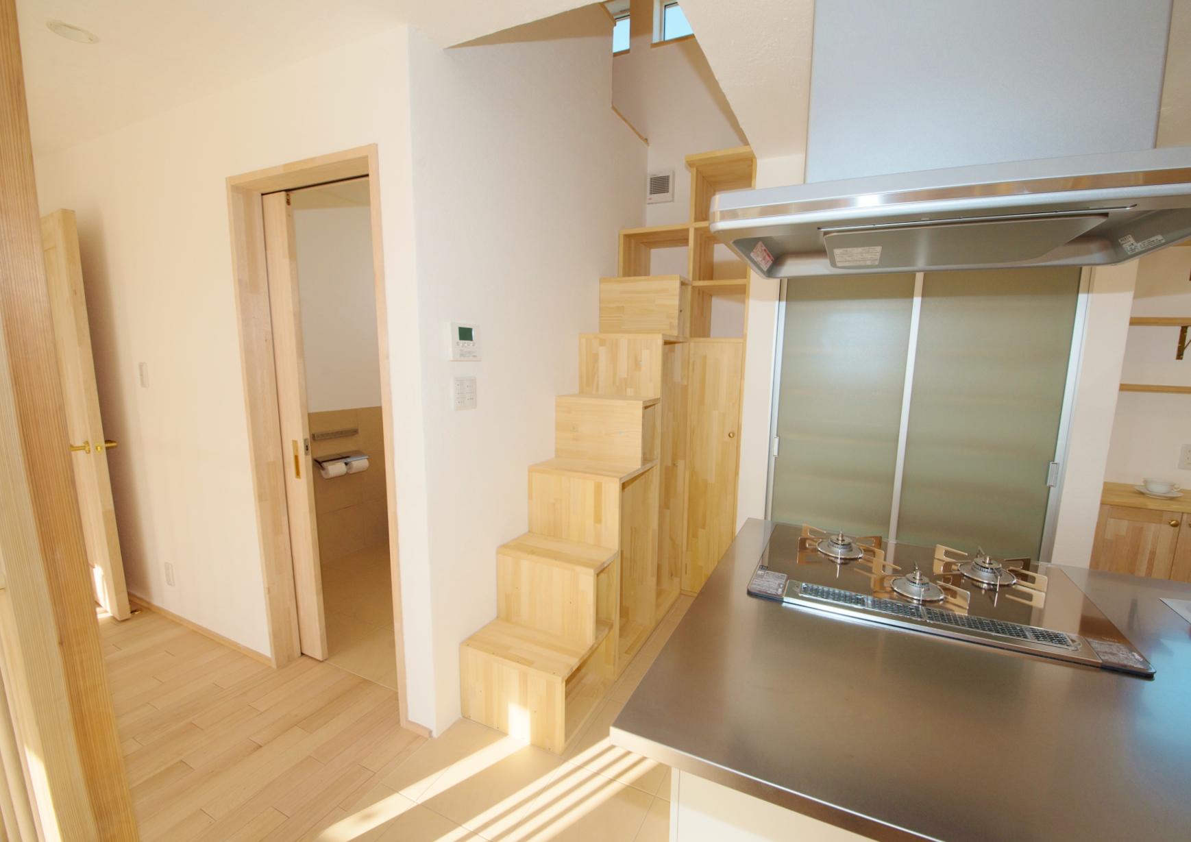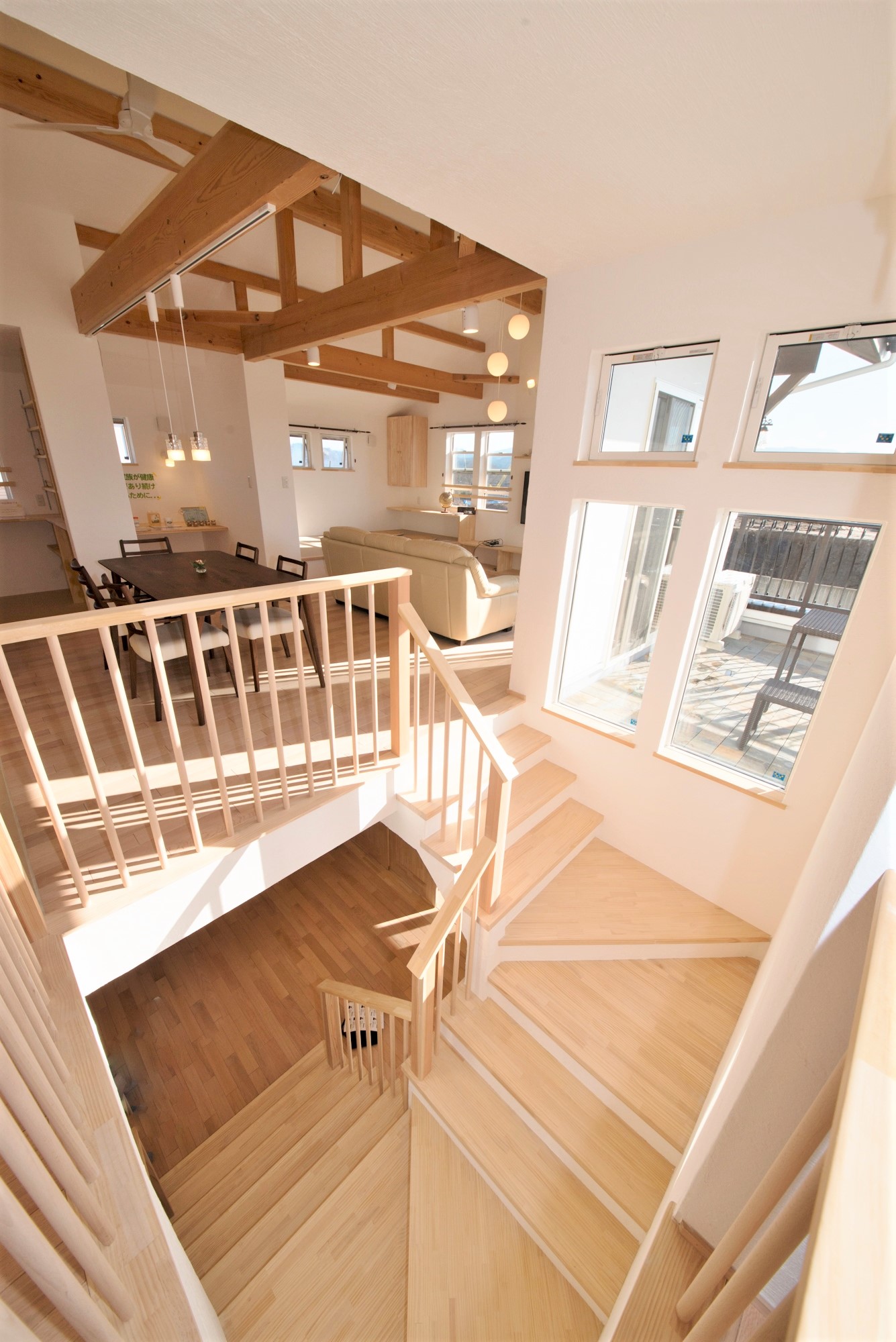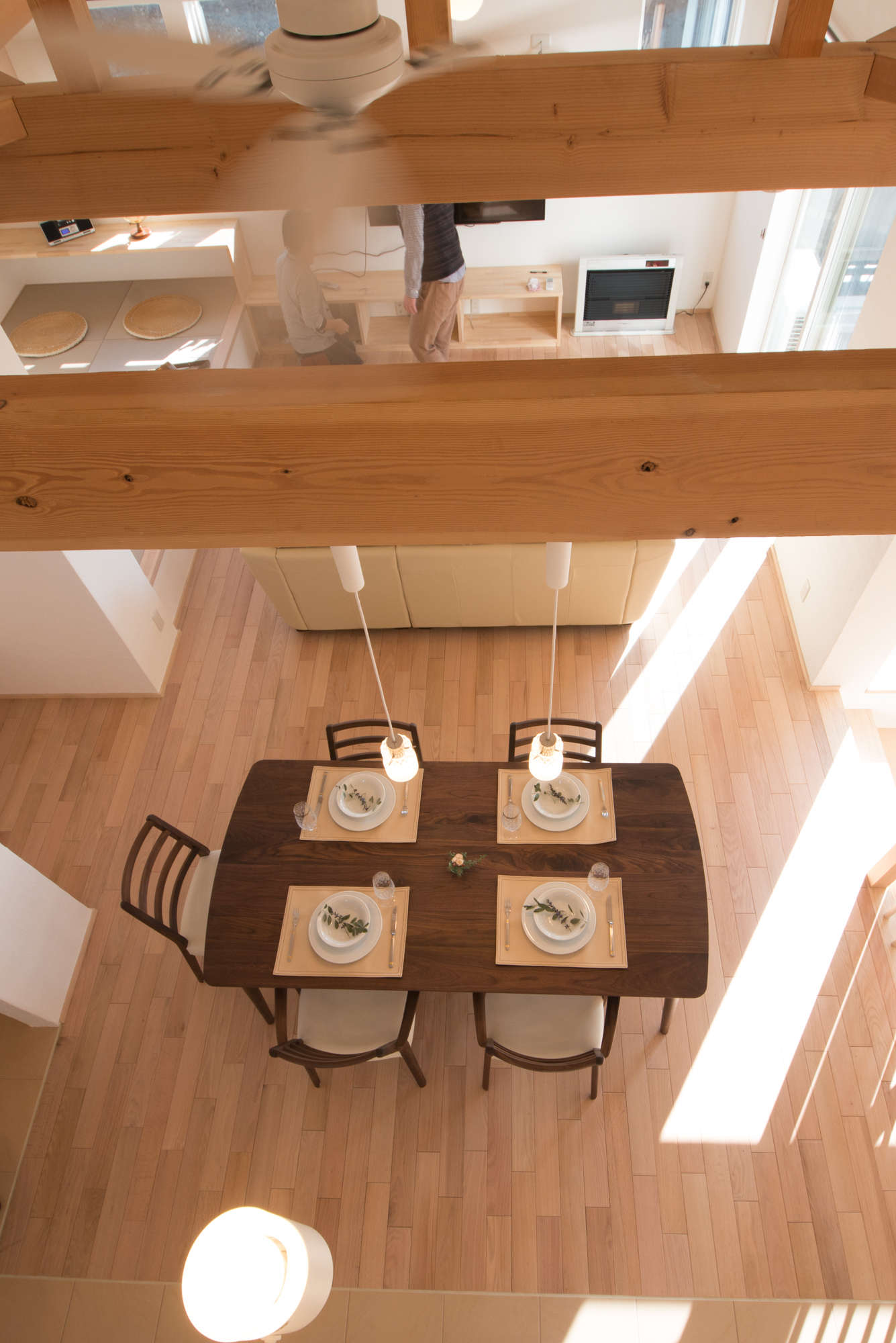 建物中央に位置する、二階へ続く木製手摺が美しい階段は、一階へ光や風運びます。明るく優しい日差しの中を抜けるとそこは家族の集まる賑やかなリビングへ続きます。