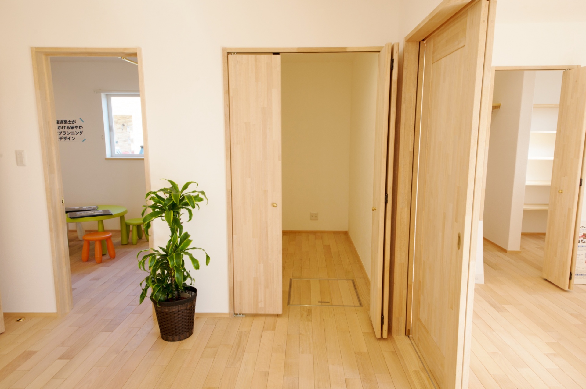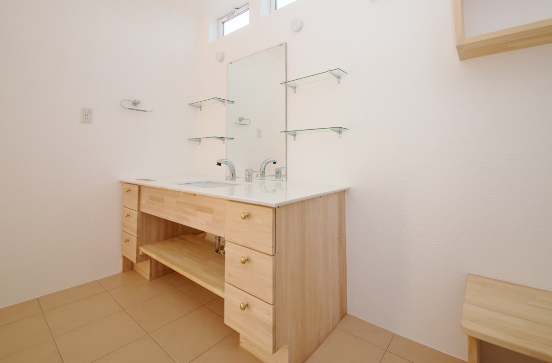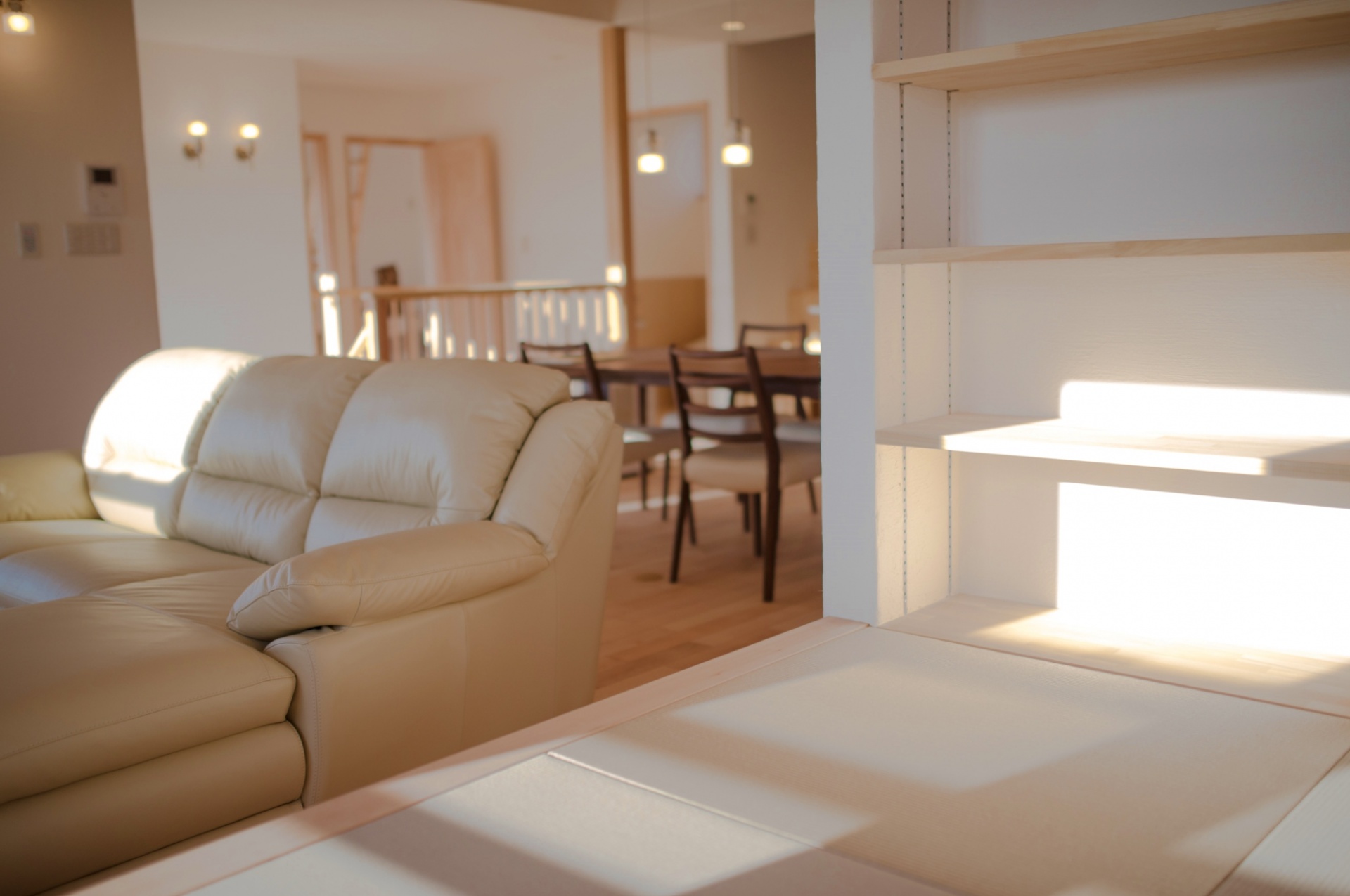 建物中央に位置する、二階へ続く木製手摺が美しい階段は、一階へ光や風運びます。明るく優しい日差しの中を抜けるとそこは家族の集まる賑やかなリビングへ続きます。