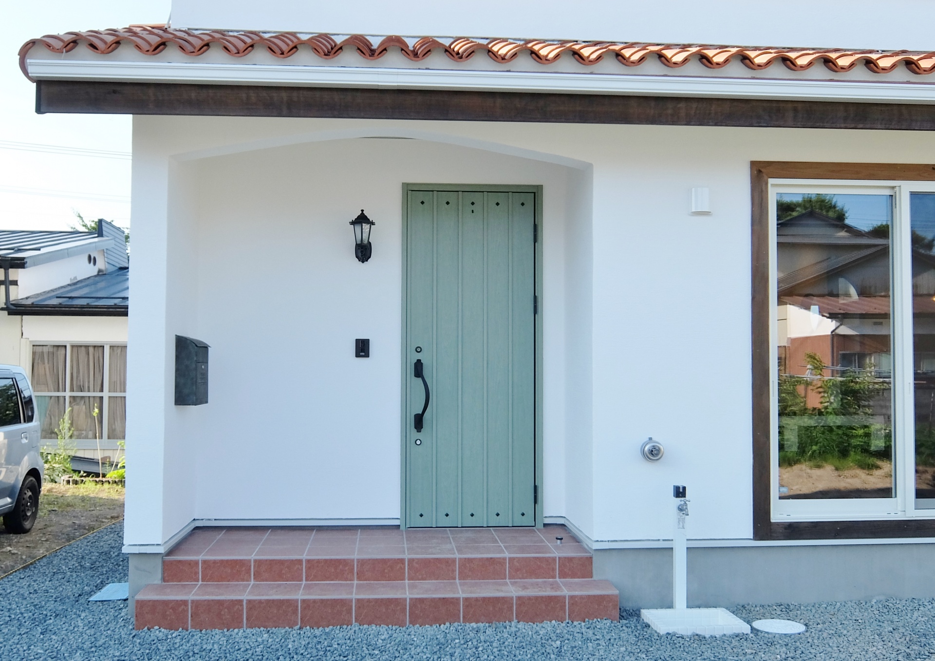 フランス瓦の屋根にミントグリーンの玄関ドア。中世の面影が残る南フランスを思わせる可愛らしい雰囲気の外観です。