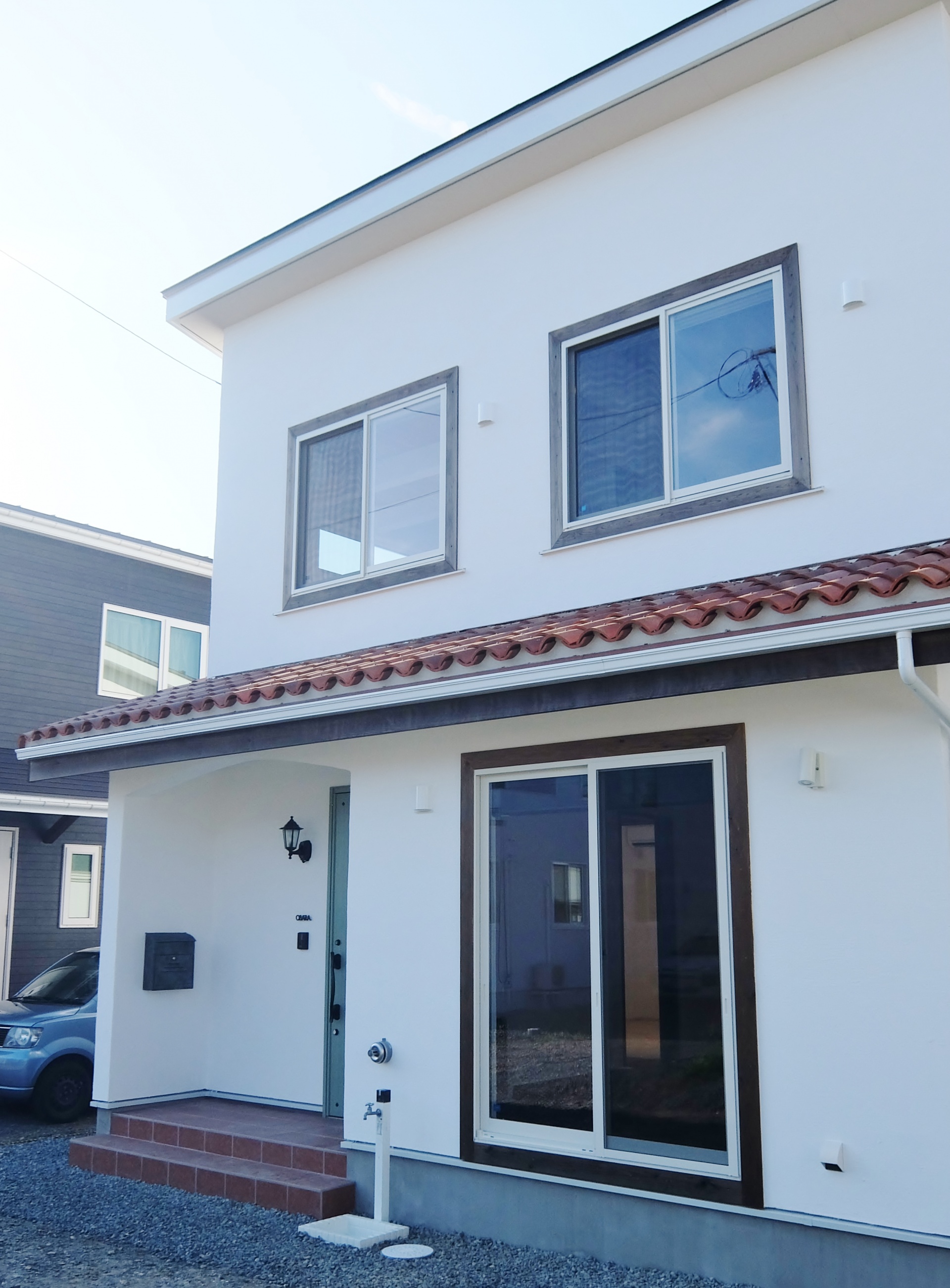 フランス瓦が特徴で濃いブラウンに塗装した無垢材と壁の白さを対照的にマッチした無添加住宅。