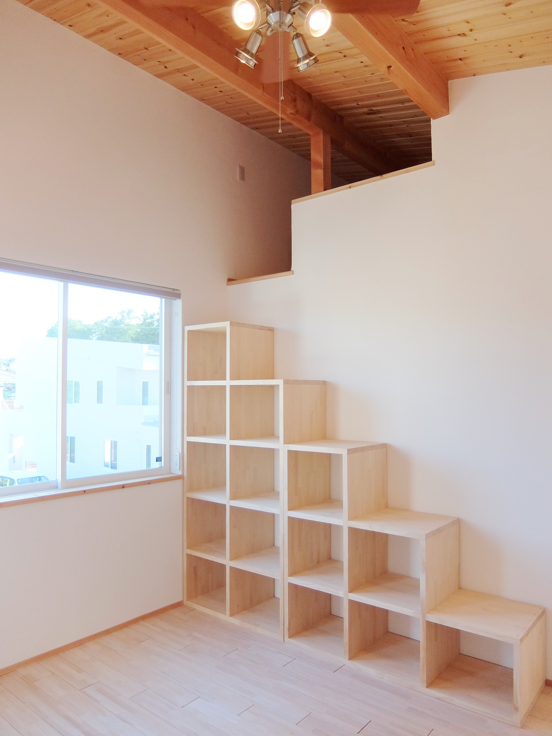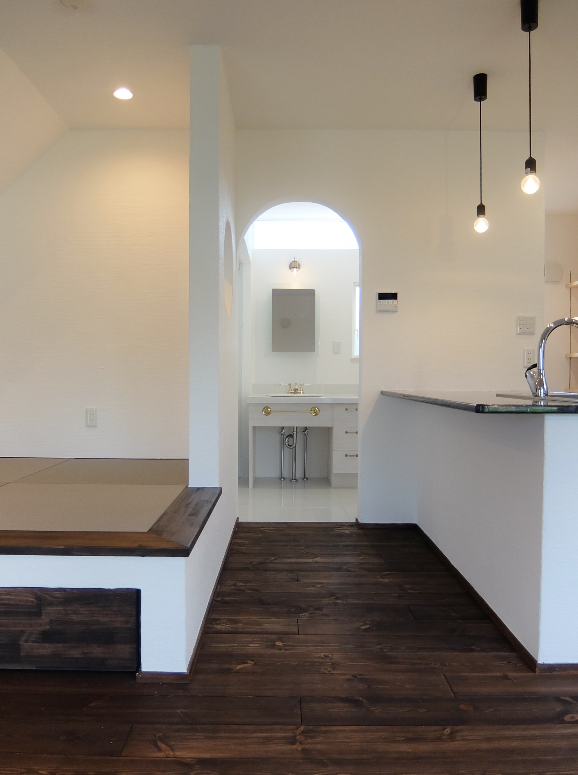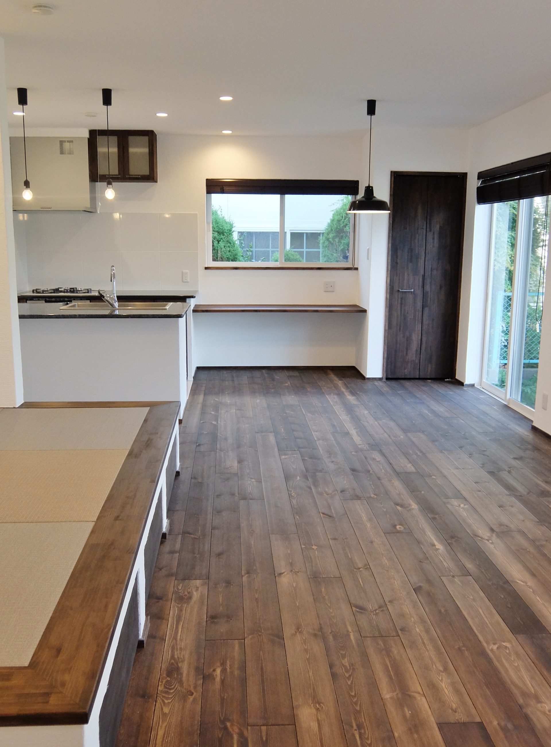 流行の塩系インテリアですが、「物を置かない」「色味を抑える」ために、生活感を極力見せない収納が重要!小上りの畳コーナーの下は引出し式の大型収納になっています。