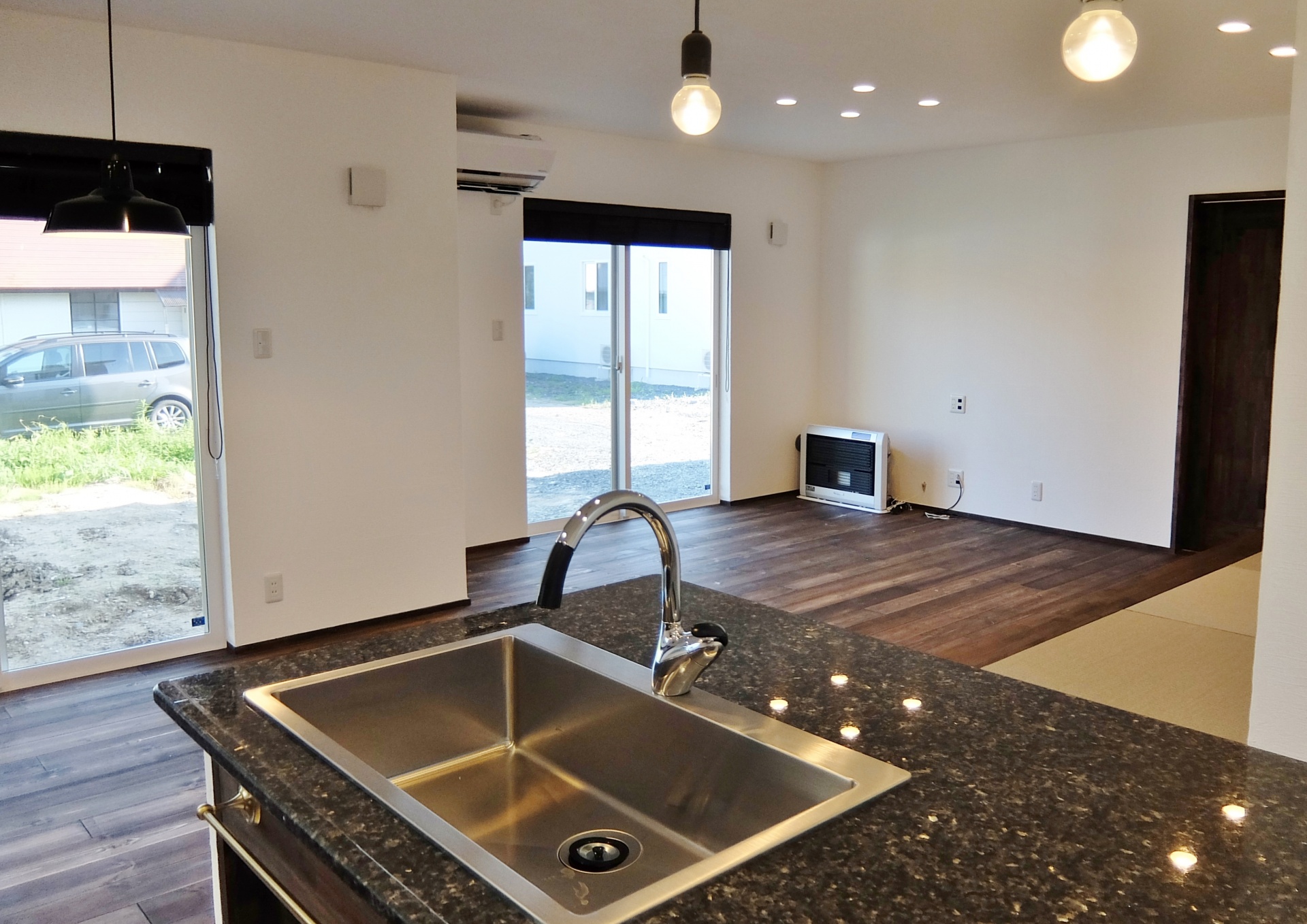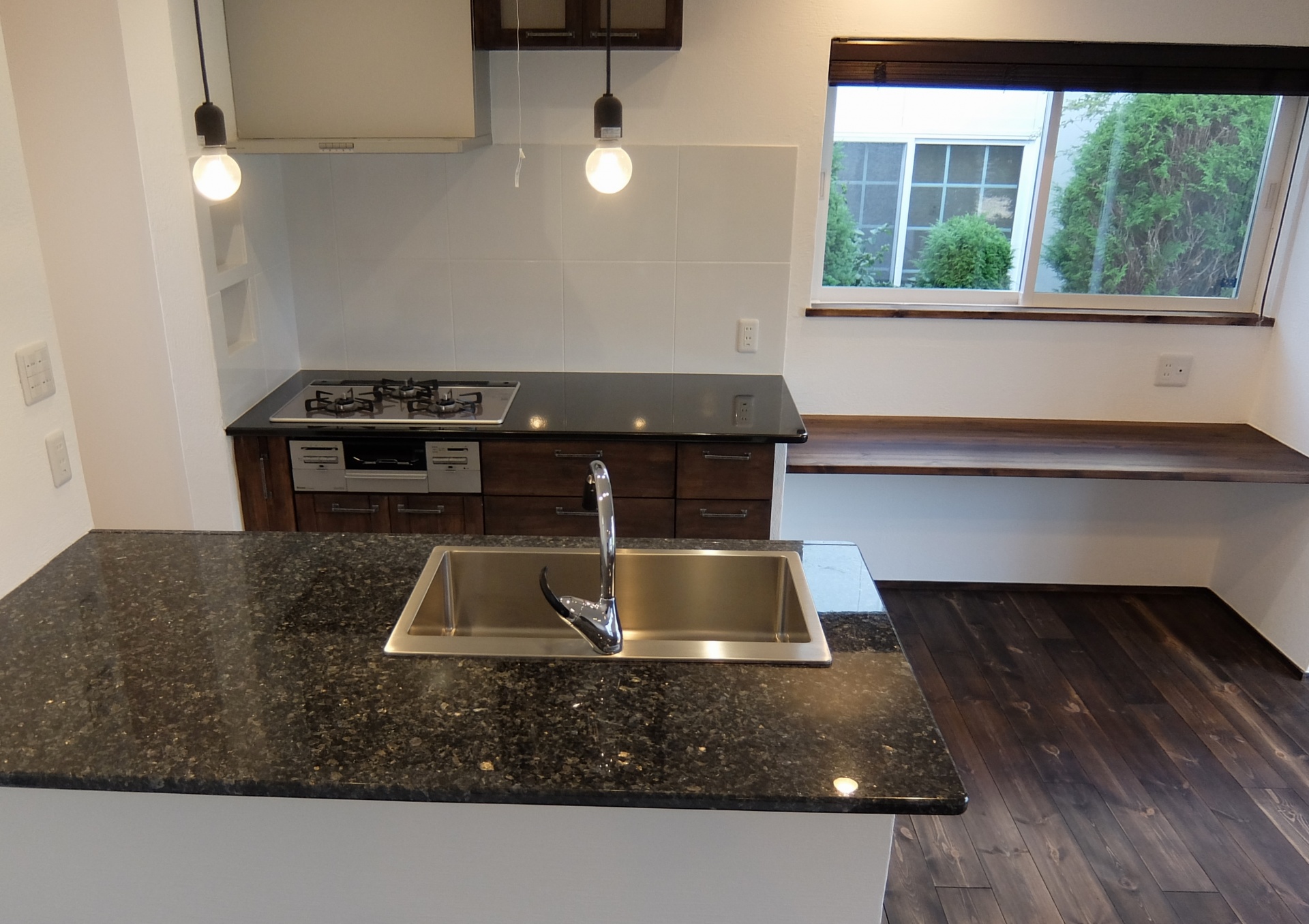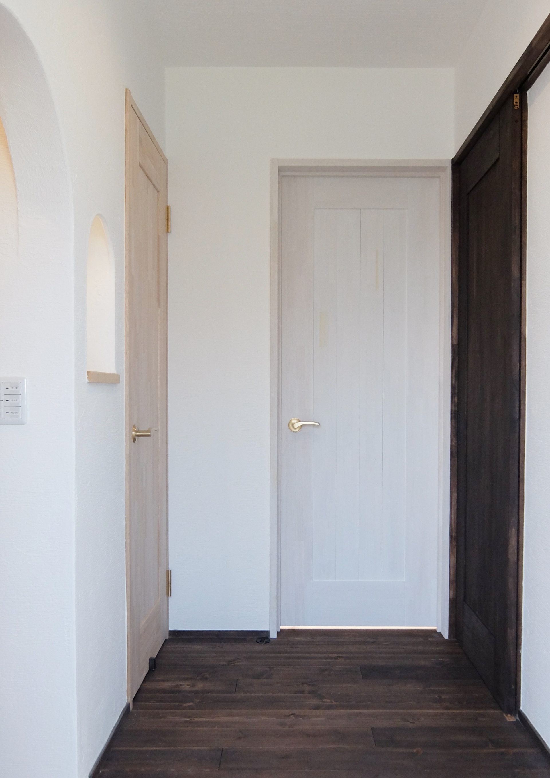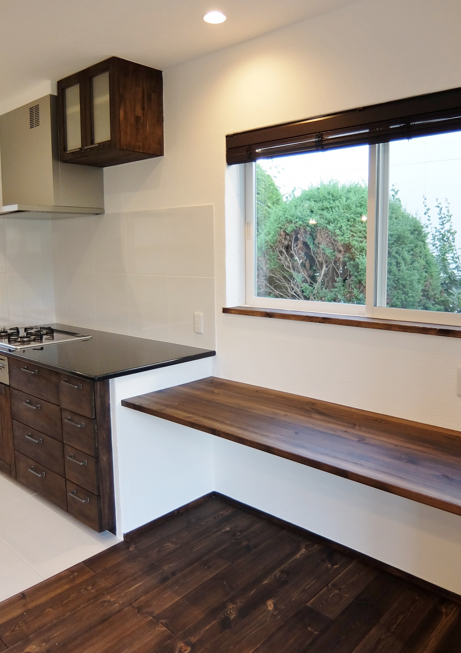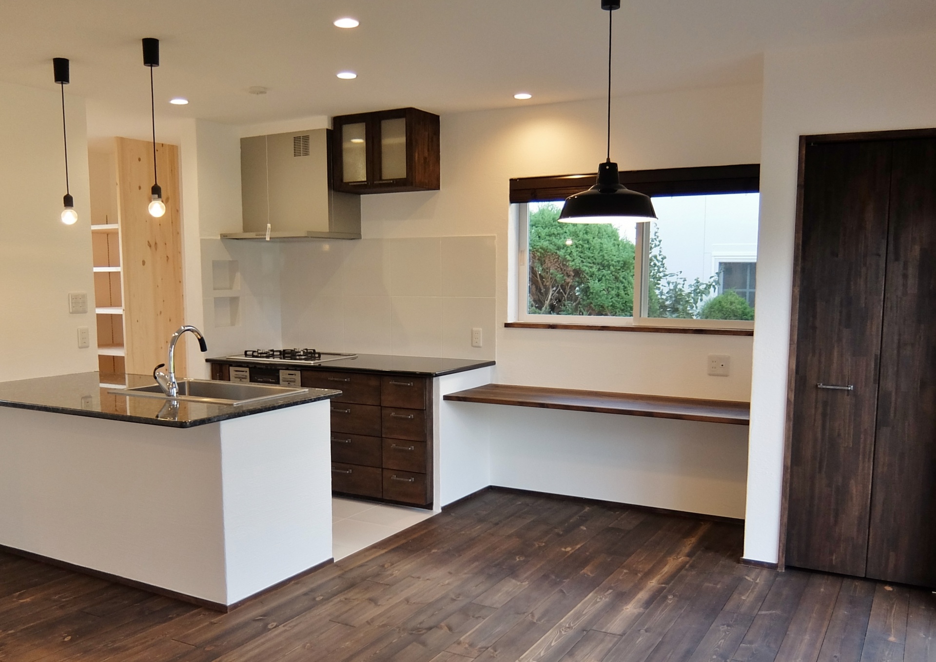 扉と同じビターチョコレート色の空間。インダストリアルな雰囲気が随所に散りばめられ“塩系“のインテリアにも似合う空間です。