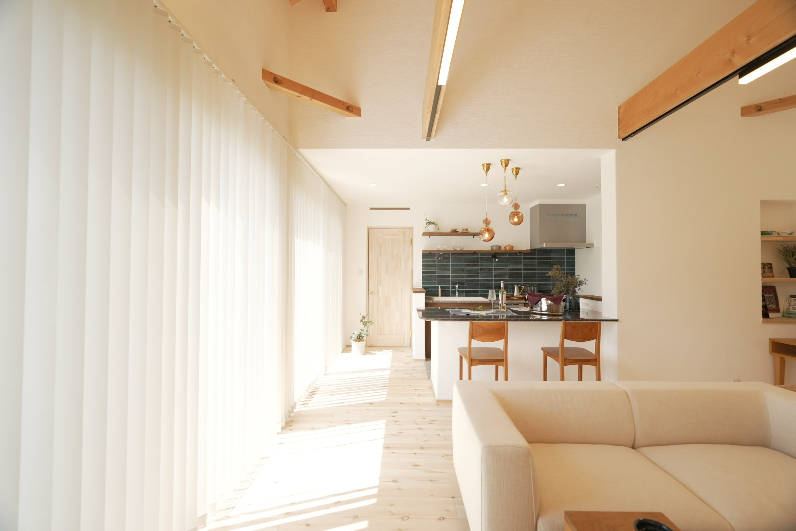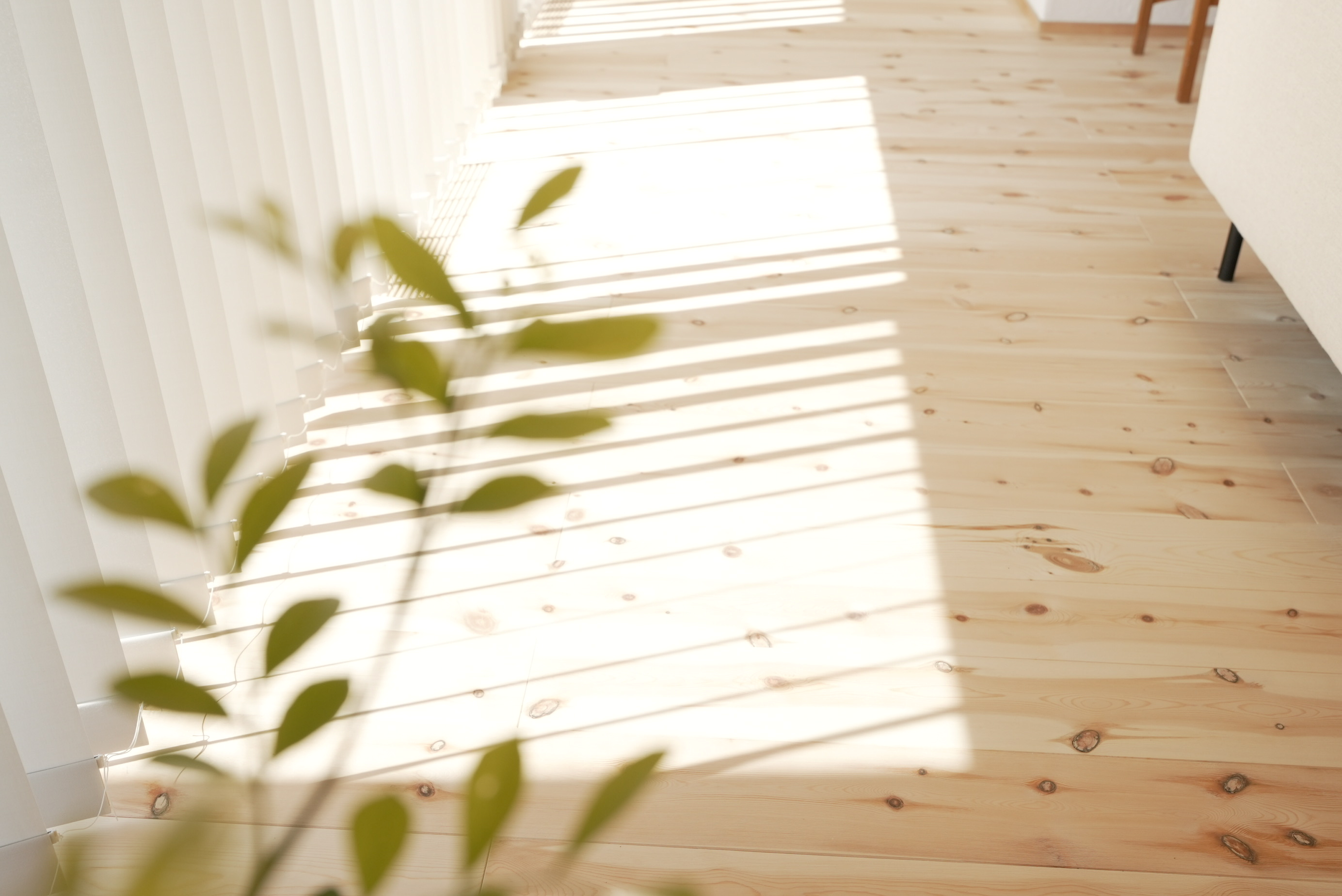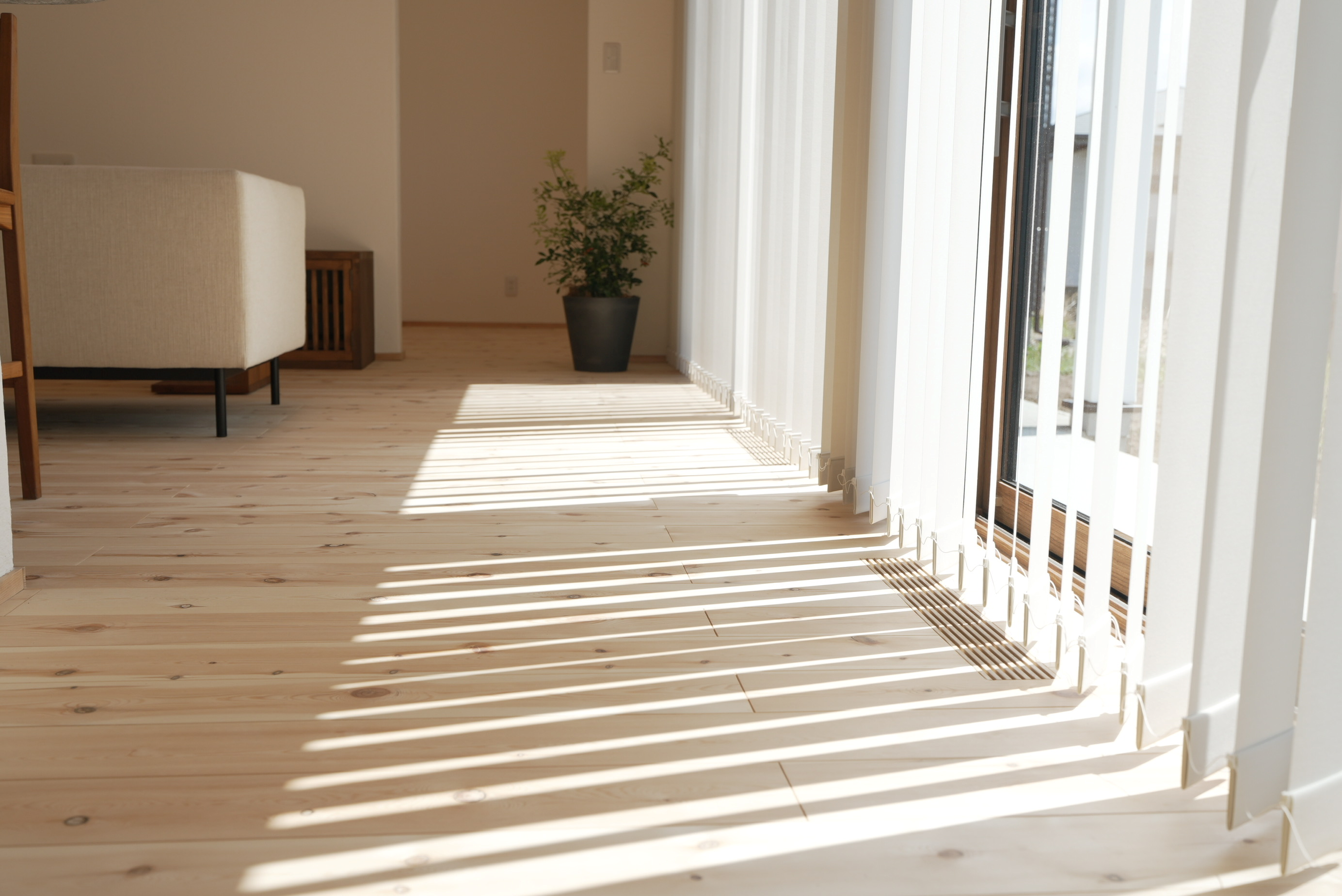 大きな掃き出し窓からの光が無垢床にゆらゆらと映えて、心地良いリビングになりました。