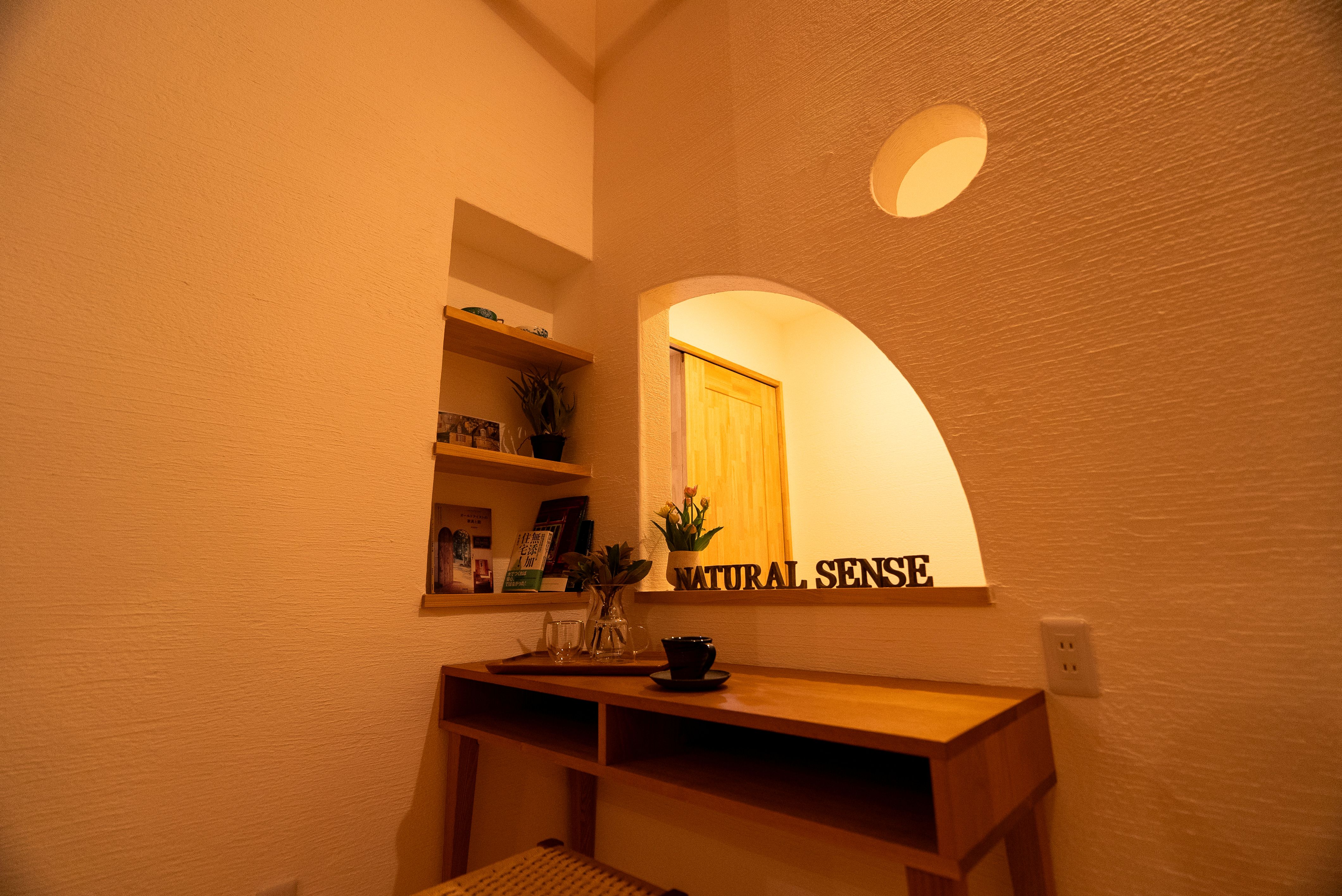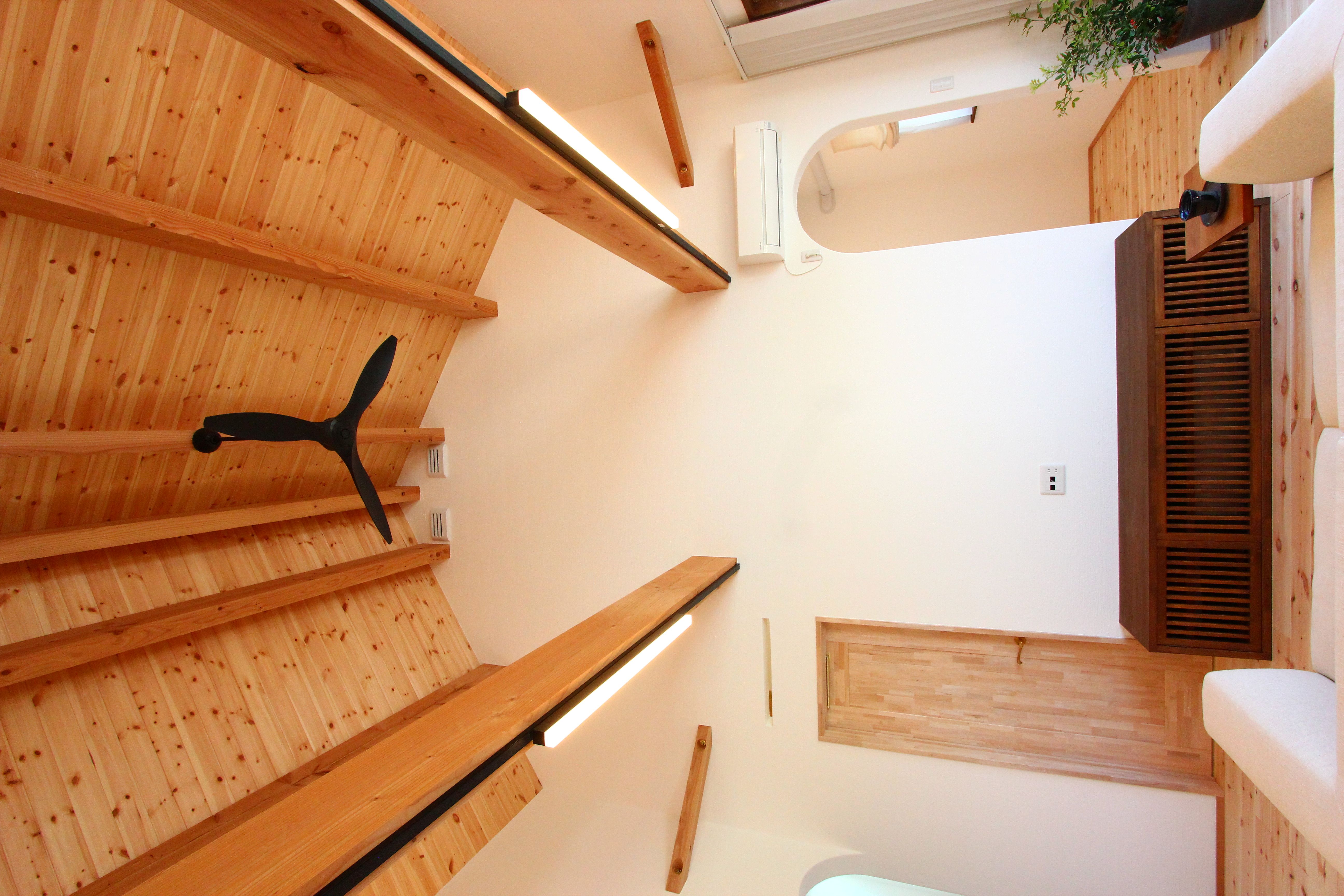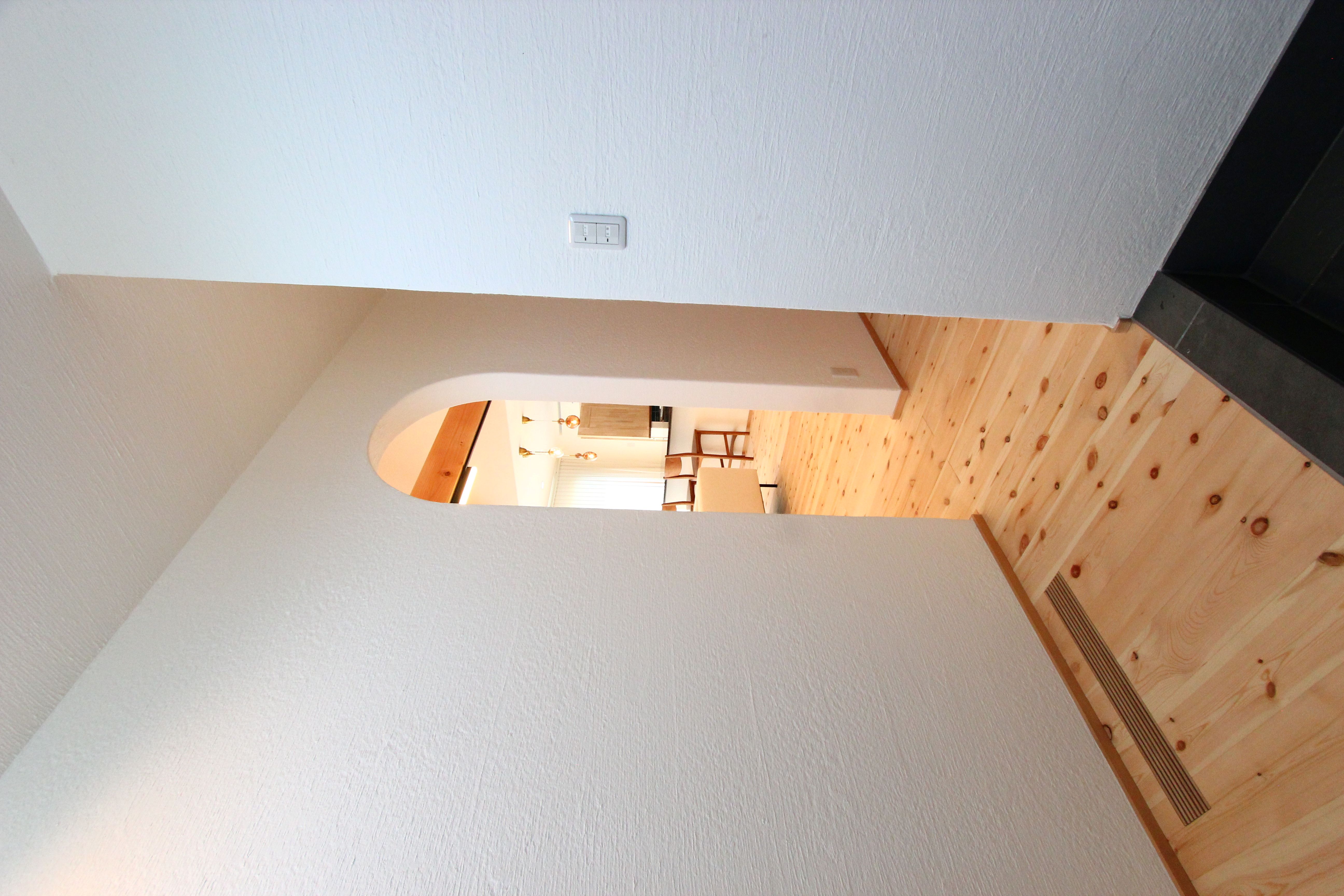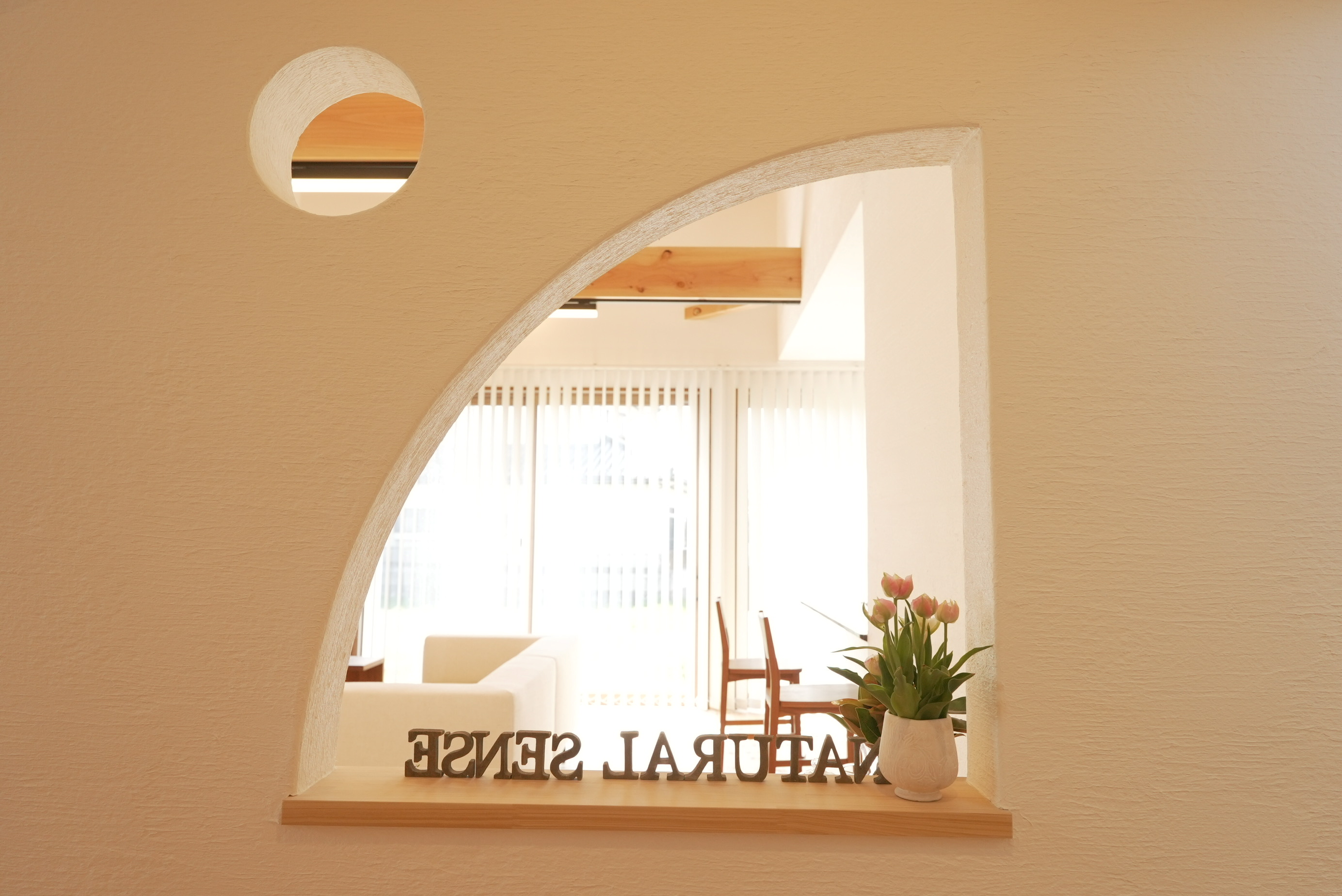 こんな形に壁をくりぬけるのも、漆喰壁だからこそです。窓がない北側の収納スペースに明るい光が入ります。