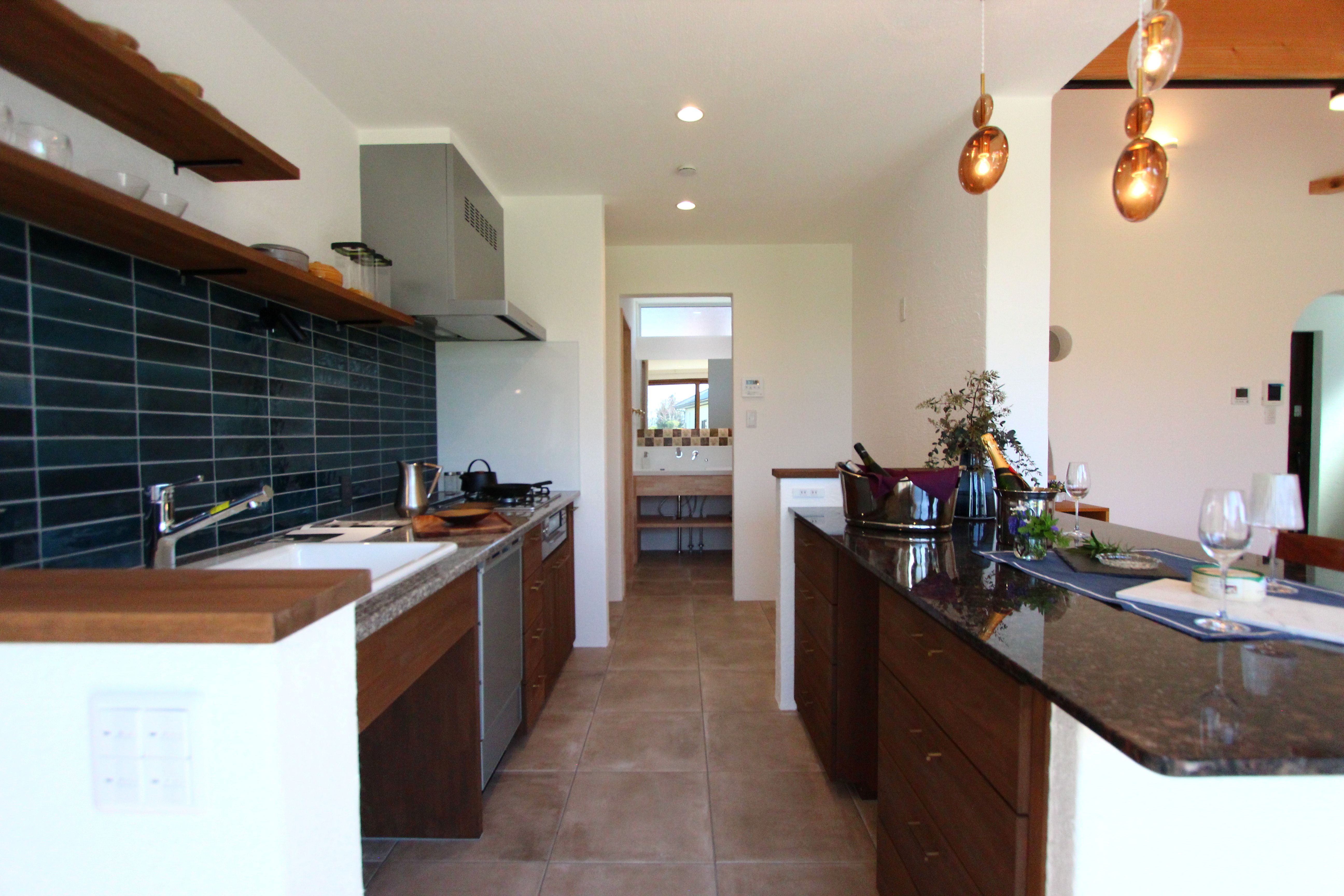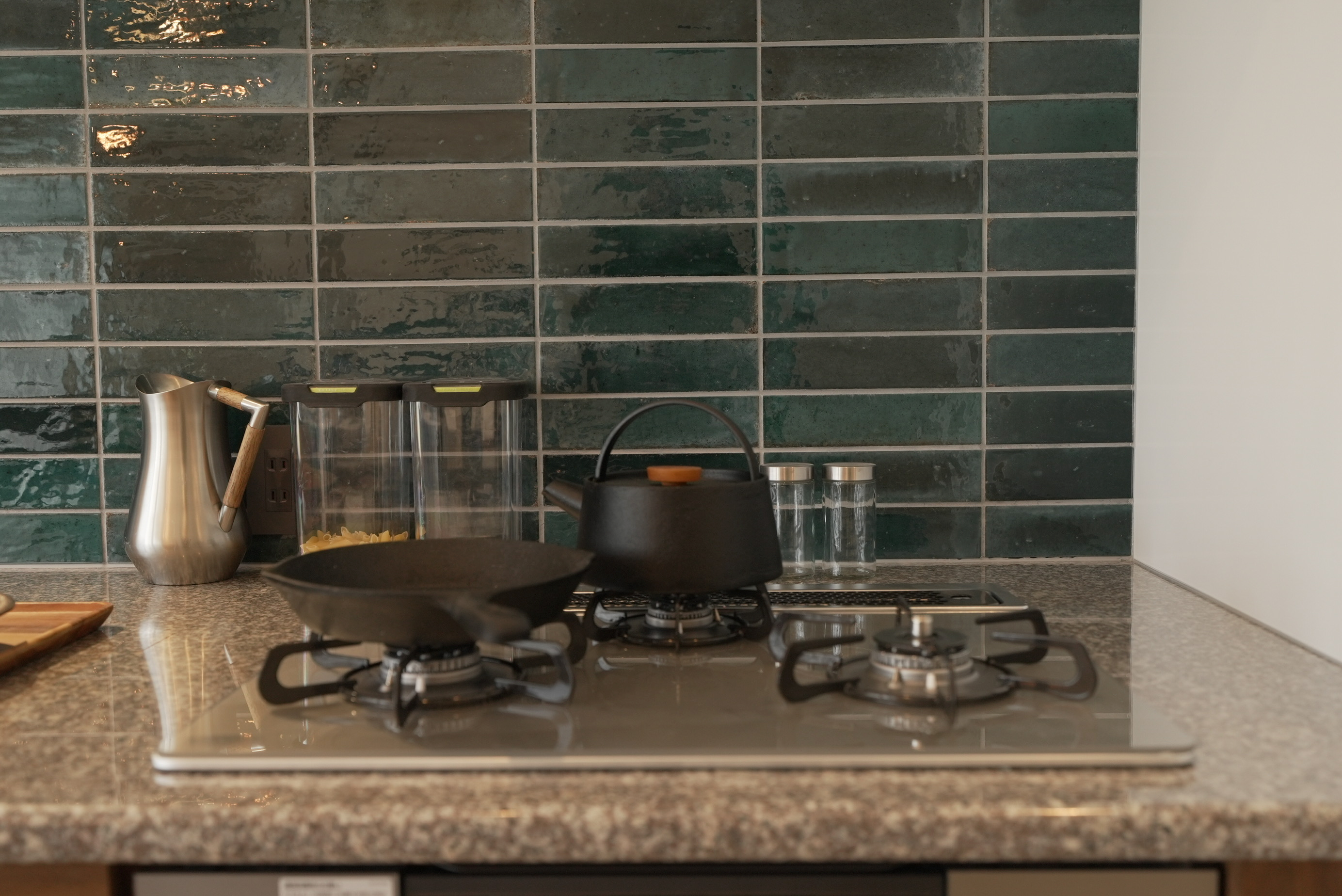 天然石のキッチンの壁に、深みのある、濃いグリーンのタイルが映えます。