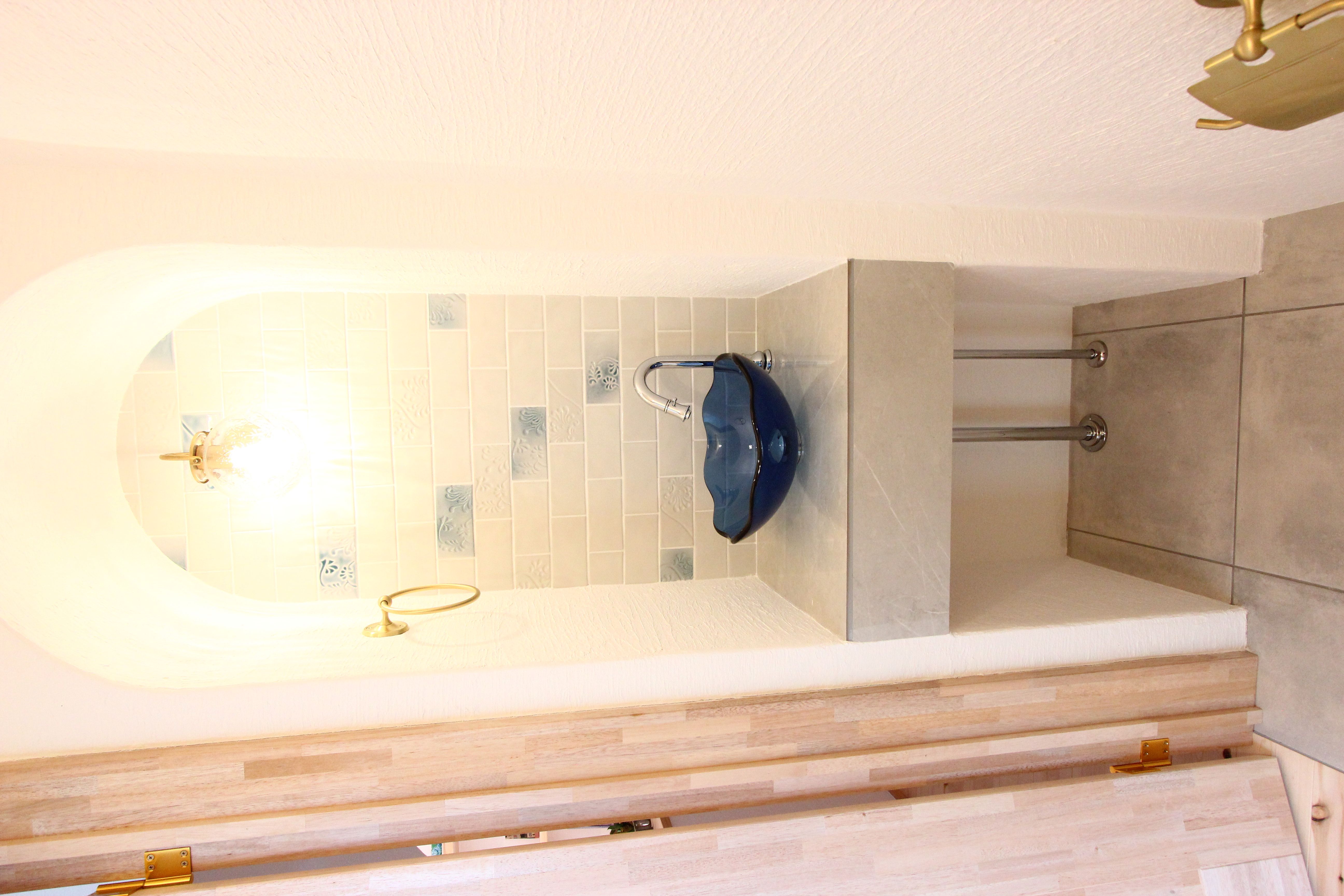 トイレの中に手洗いをつくりました。上品でさわやかなブルーのボウルと、淡いタイル、優しい照明の組み合わせがが印象的です。