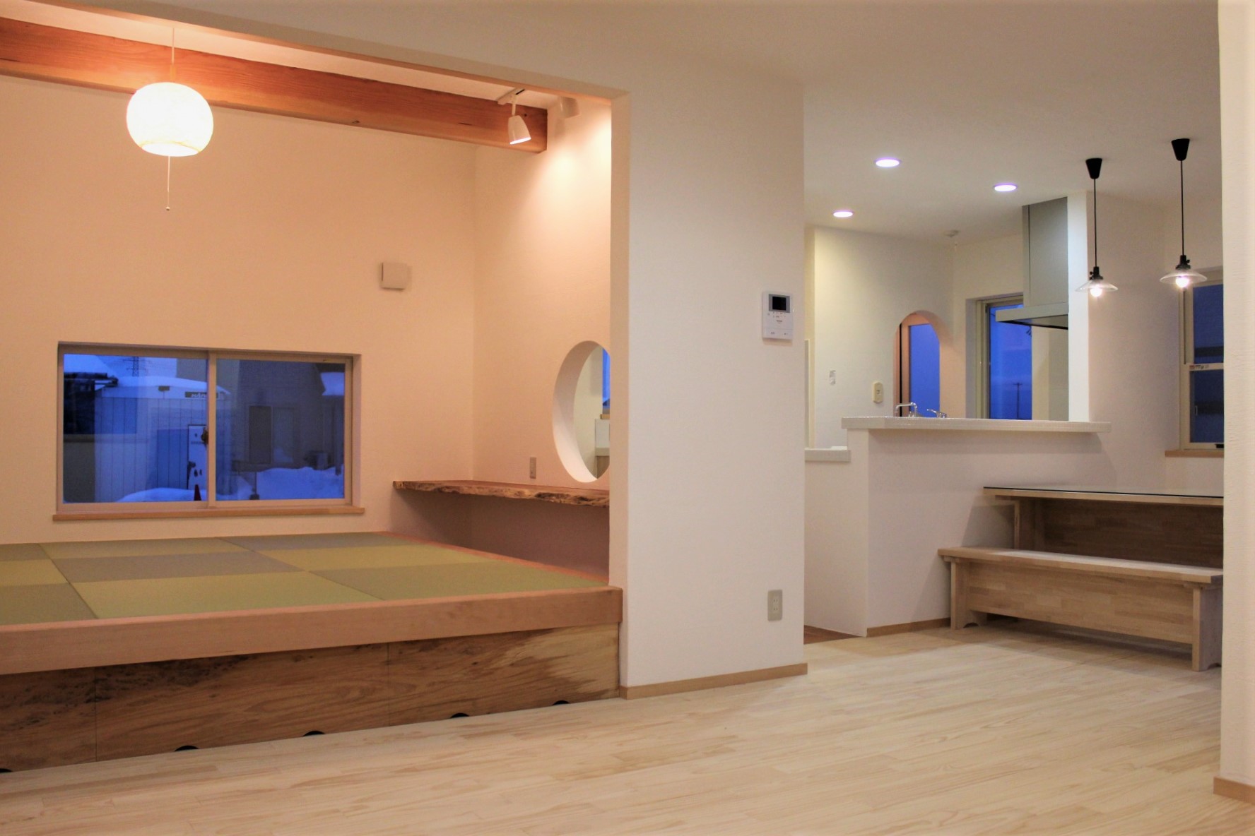 一覧 < new back > 北上市 H様邸 シンプルだけど暖かい。くつろぎ感いっぱいの和室と開放的な吹抜けがアクセントのお住まい。 オープンなシューズクロークや遊び心のある小上がりの和室など、随所に見どころの多いH様邸。お施主様こだわりのスイッチカバーやお洒落な照明などデザインにこだわったインテリアも魅力です。 一階に設置したペレットストーブの熱を全室に循環させるため、室内上部の間仕切りをなくしたり、二階の床をスノコ状にする工夫を施しています。 Gallery 一覧 < new back > CATEGORY 平屋 外観 エントランス 玄関 シューズクローク リビング ダイニング キッチン 和室 洗面脱衣室 在来浴室 サンルーム トイレ 吹抜け 階段 ファミリーホール 主寝室 子供室、洋室、書斎 ロフト、小屋裏収納 ウォークインクローゼット、納戸 パントリー