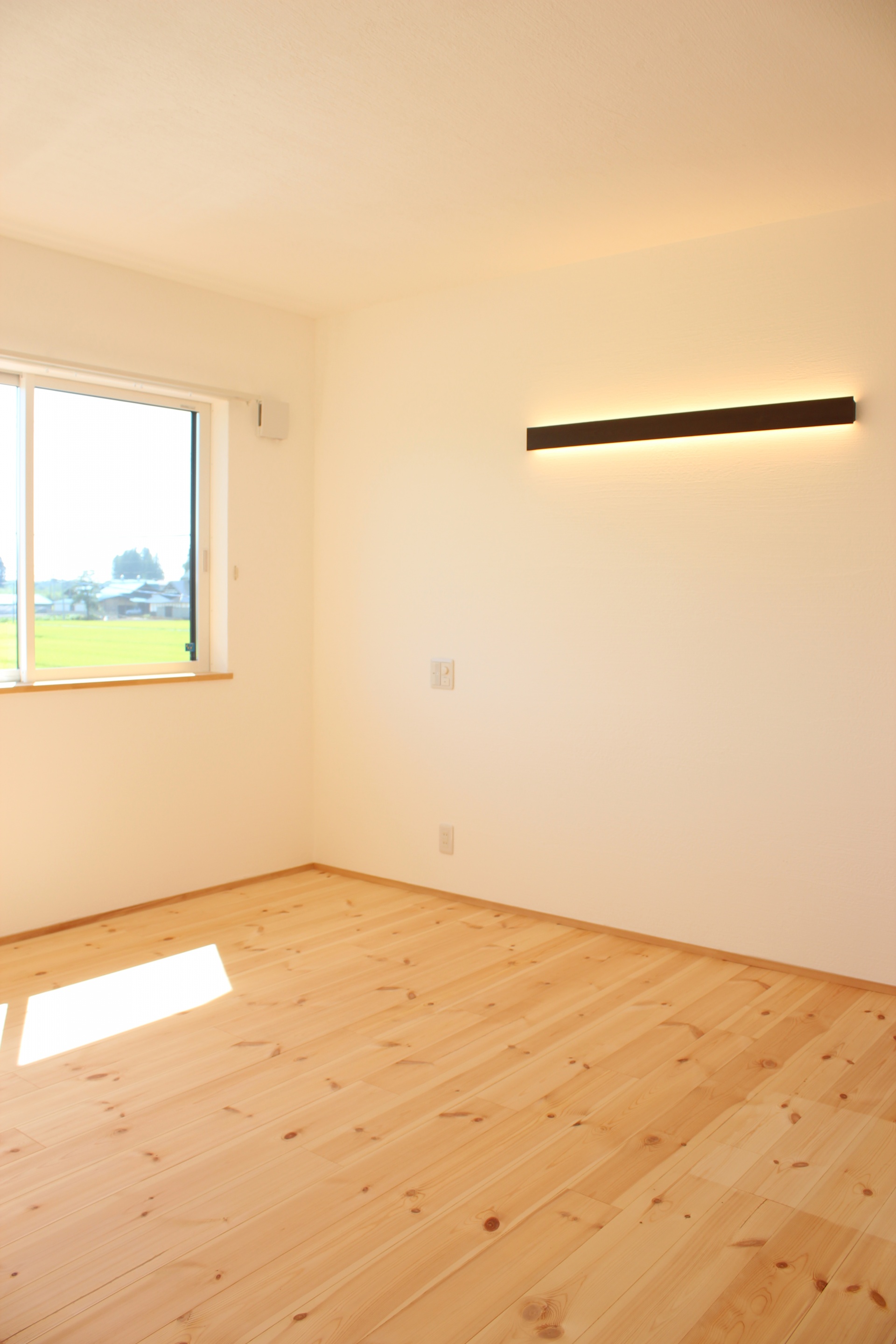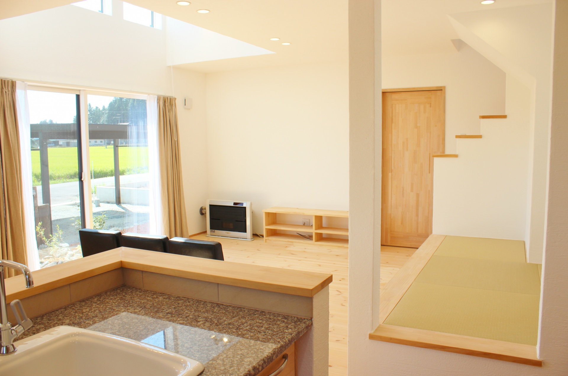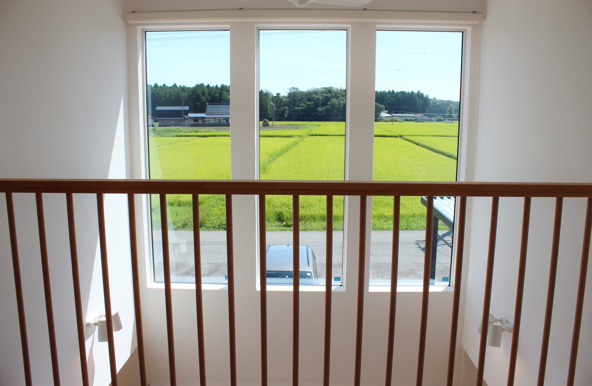青空に映える、どっしりとした大屋根が印象的なM様邸。シンプルな佇まいが落ち着きを感じさせます。目の前は、胆沢の田園風景が広がり開放的でゆったりと健やかな暮らしを印象付けます。