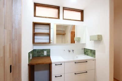 奥様が考えたこだわり洗面スペースは、家の真ん中なので、リビングからの光を採りいれて心地良い空間になりました。無垢材の窓枠・造作棚は、無添加の塗料を塗りました。