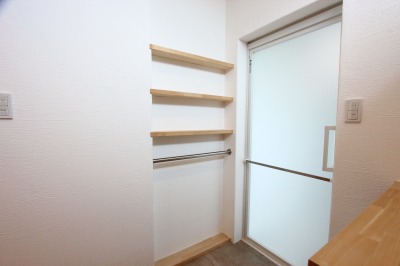 乾太くんの収納方法、ハンガーをちょっとかけておくスペースも造作しました。