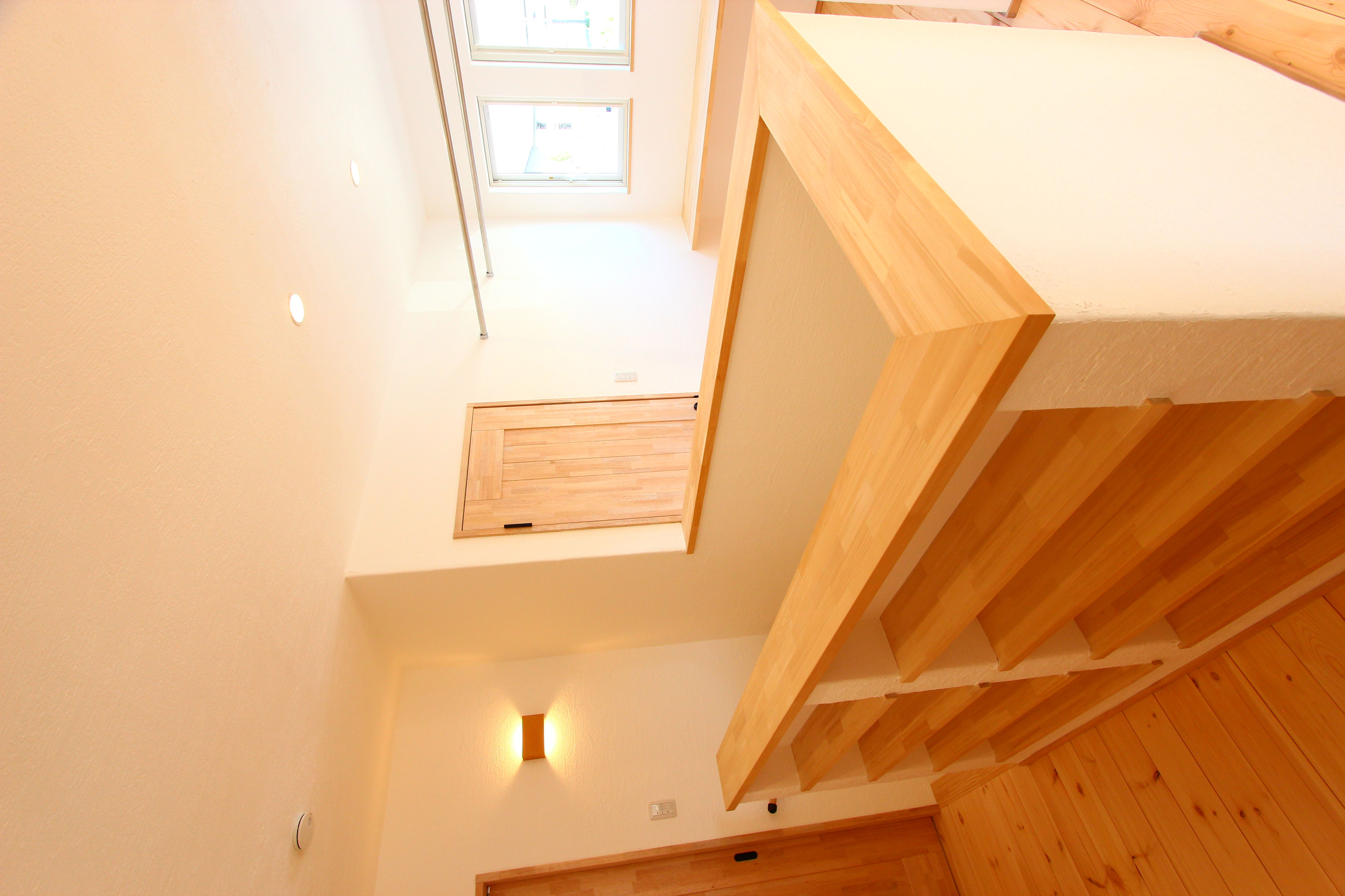 階段の下を使った収納スペースは、リビング側ではなく、水廻り側から使えるようにしました。