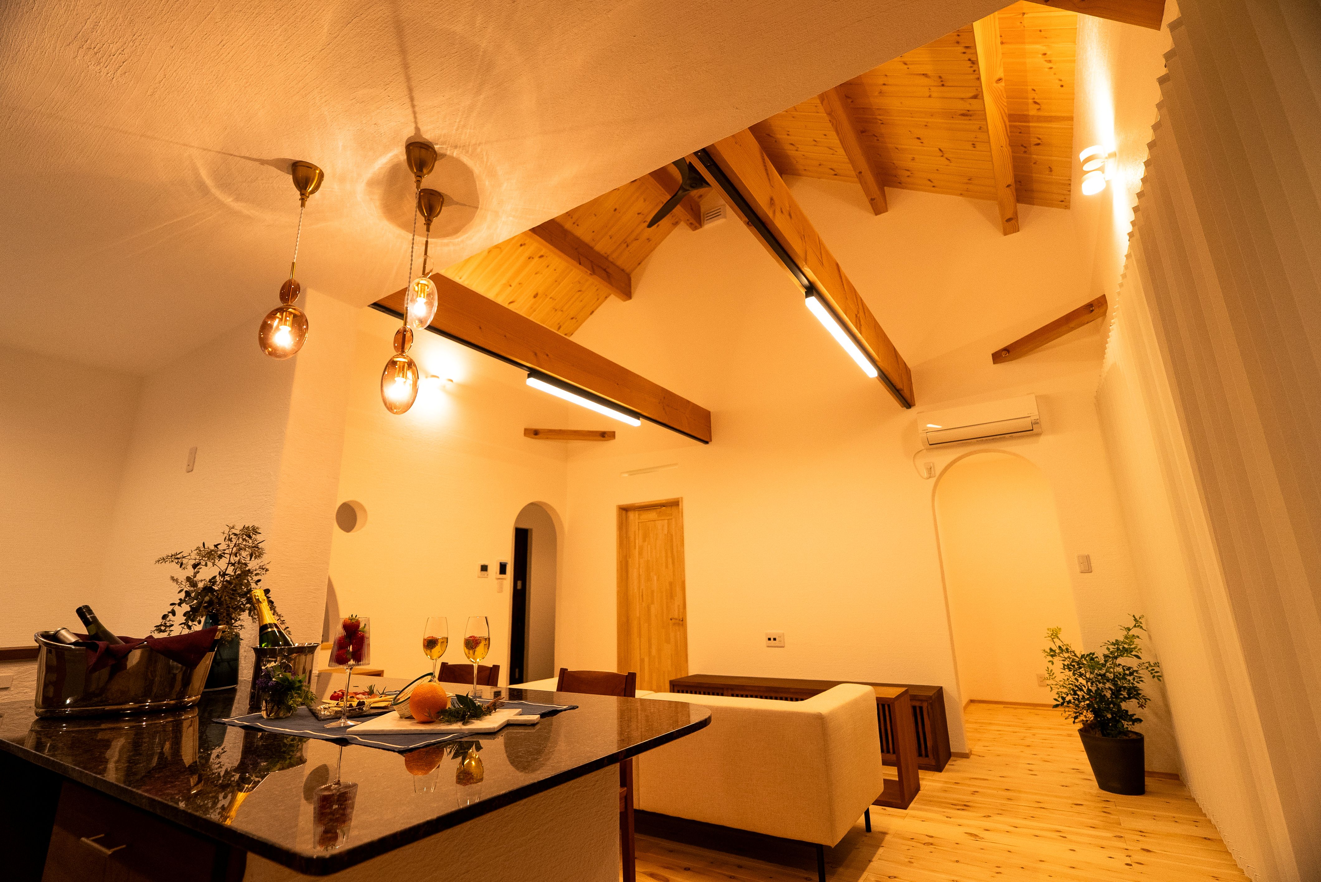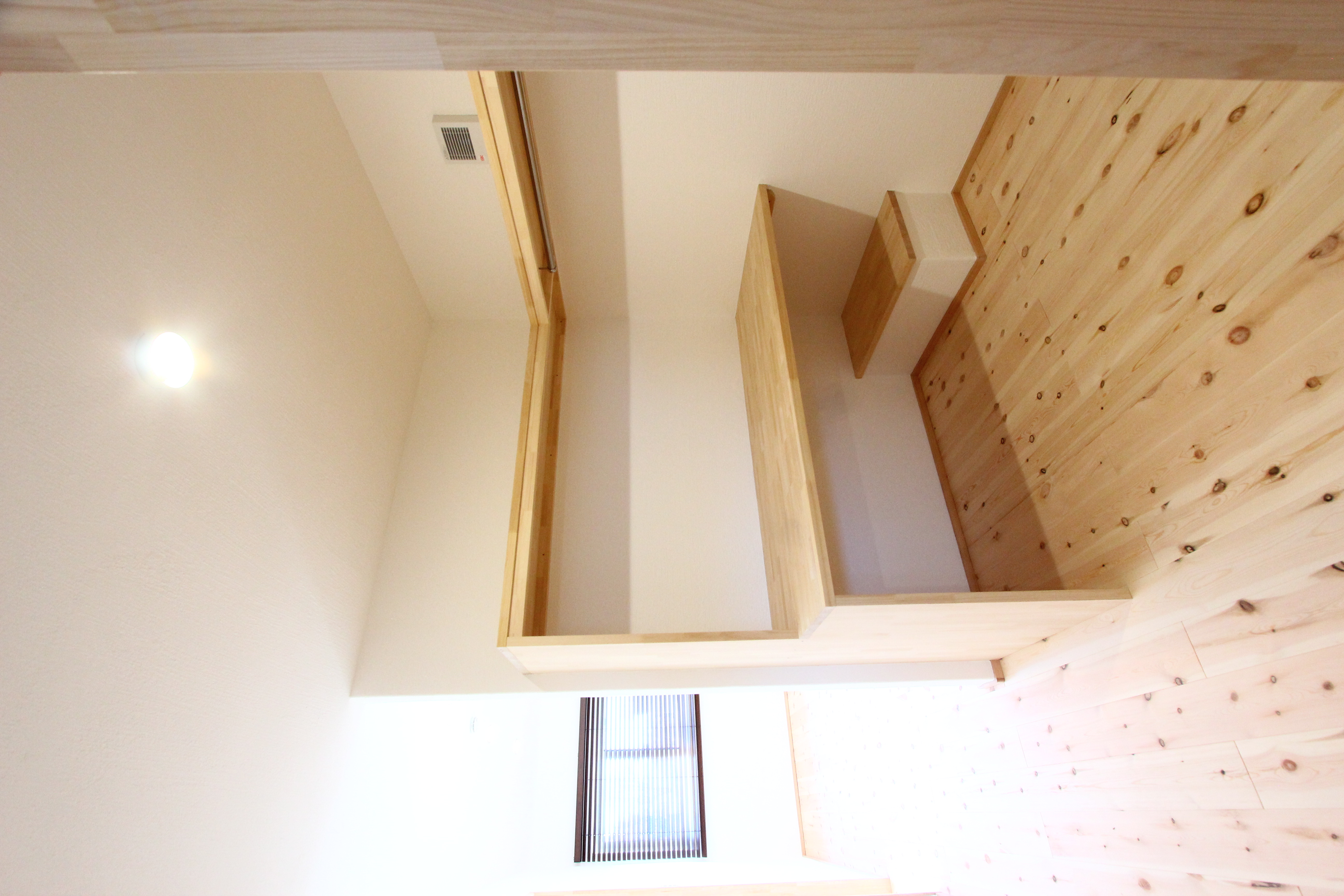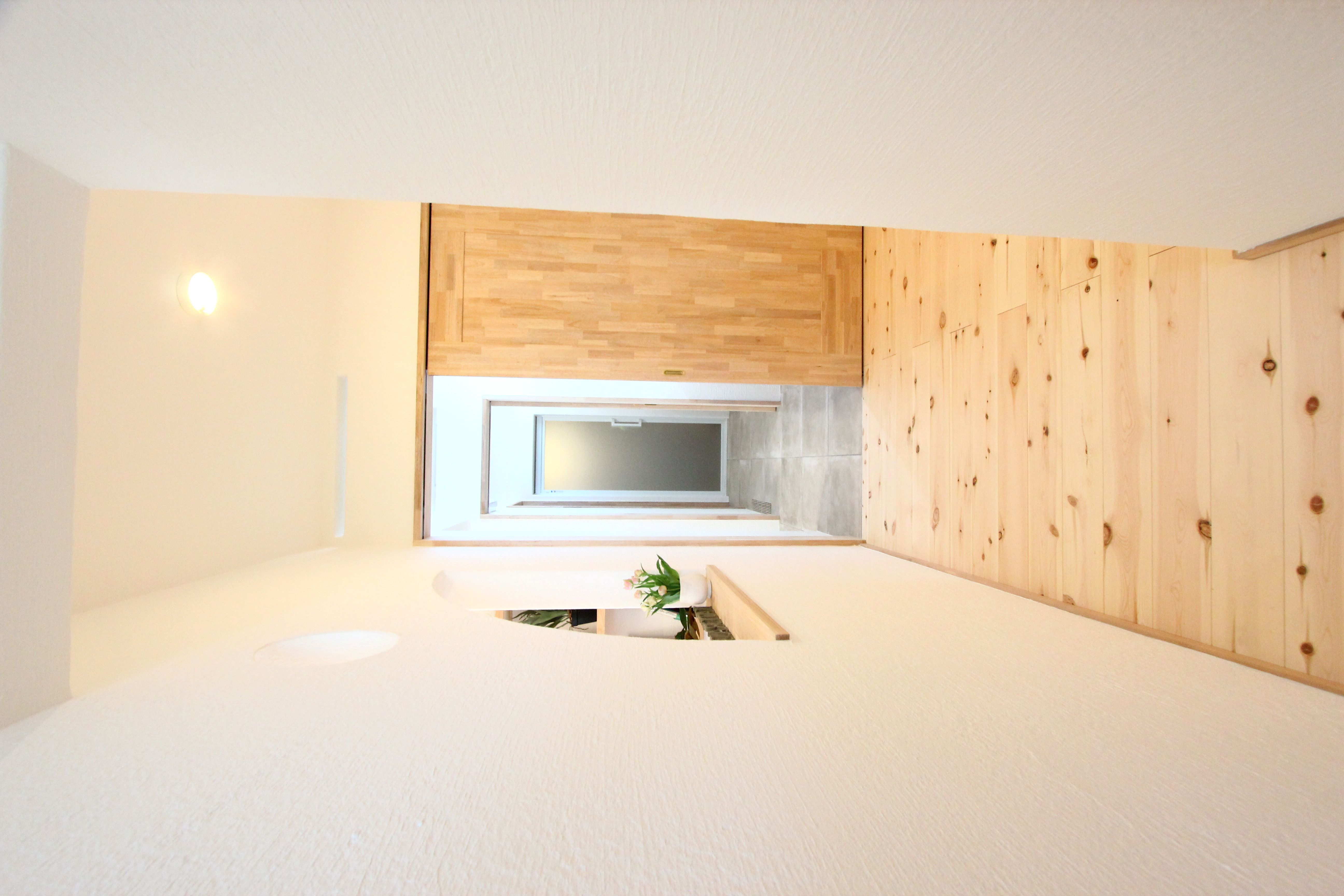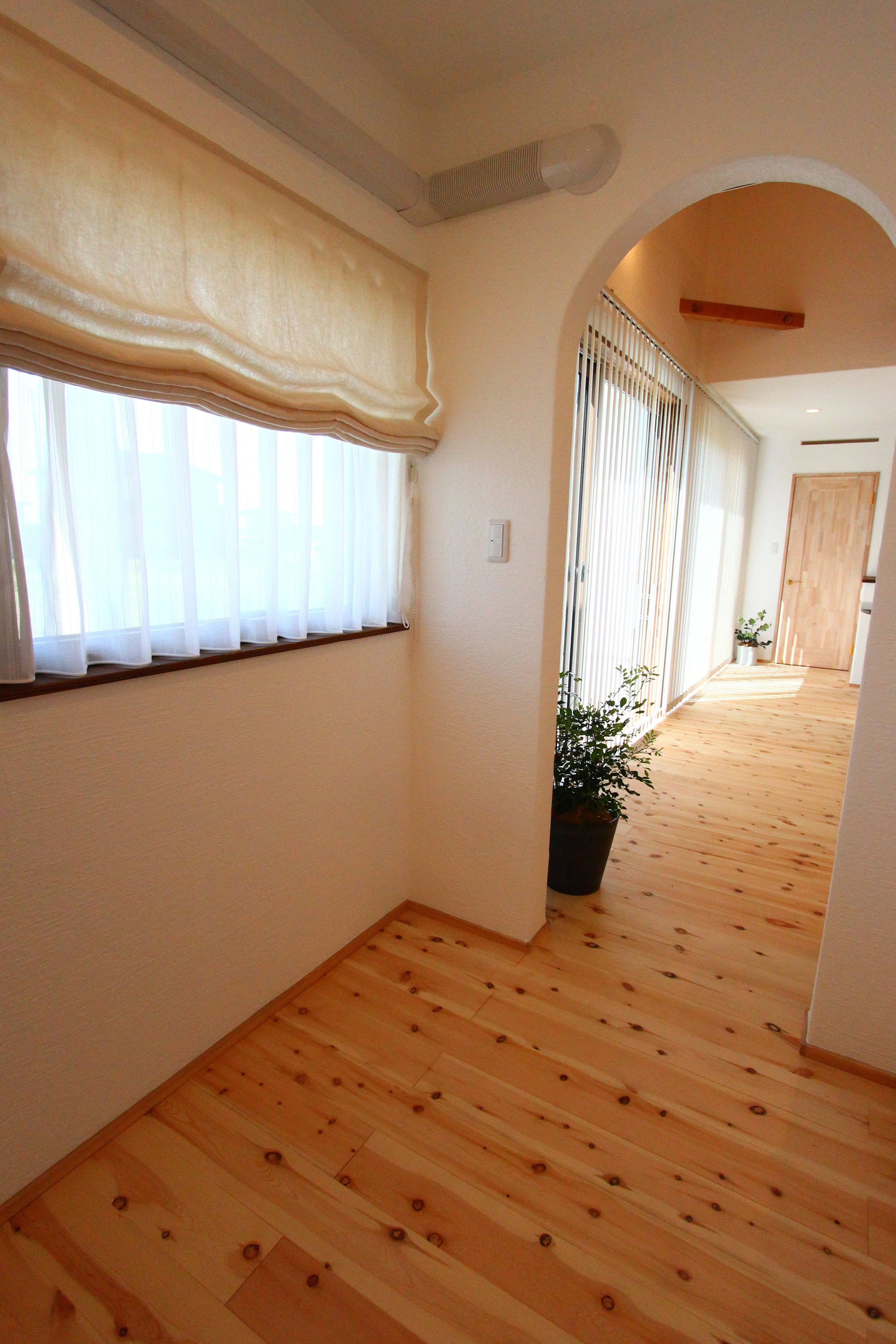 こんな形に壁をくりぬけるのも、漆喰壁だからこそです。窓がない北側の収納スペースに明るい光が入ります。