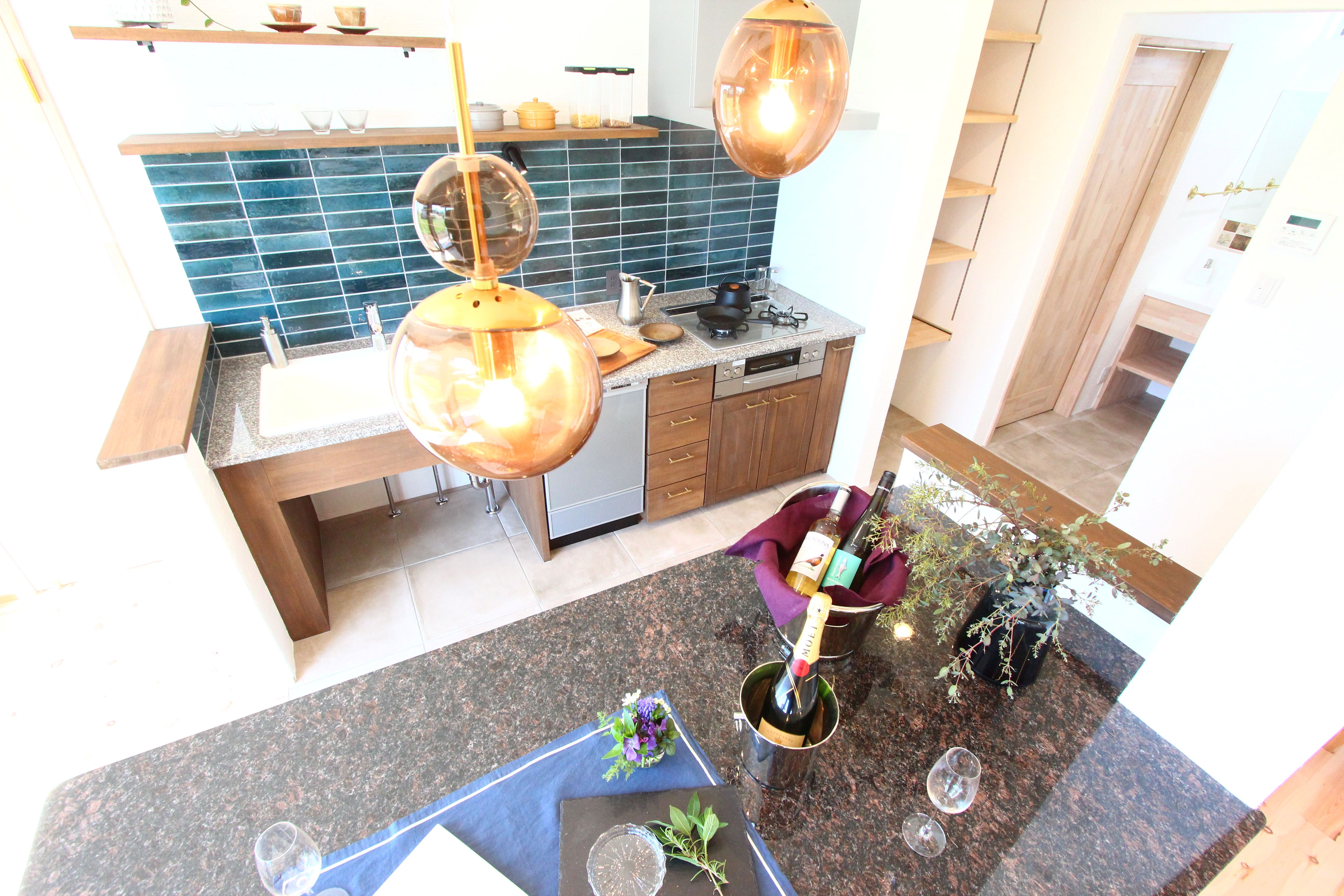 天然石のキッチンの壁に、深みのある、濃いグリーンのタイルが映えます。