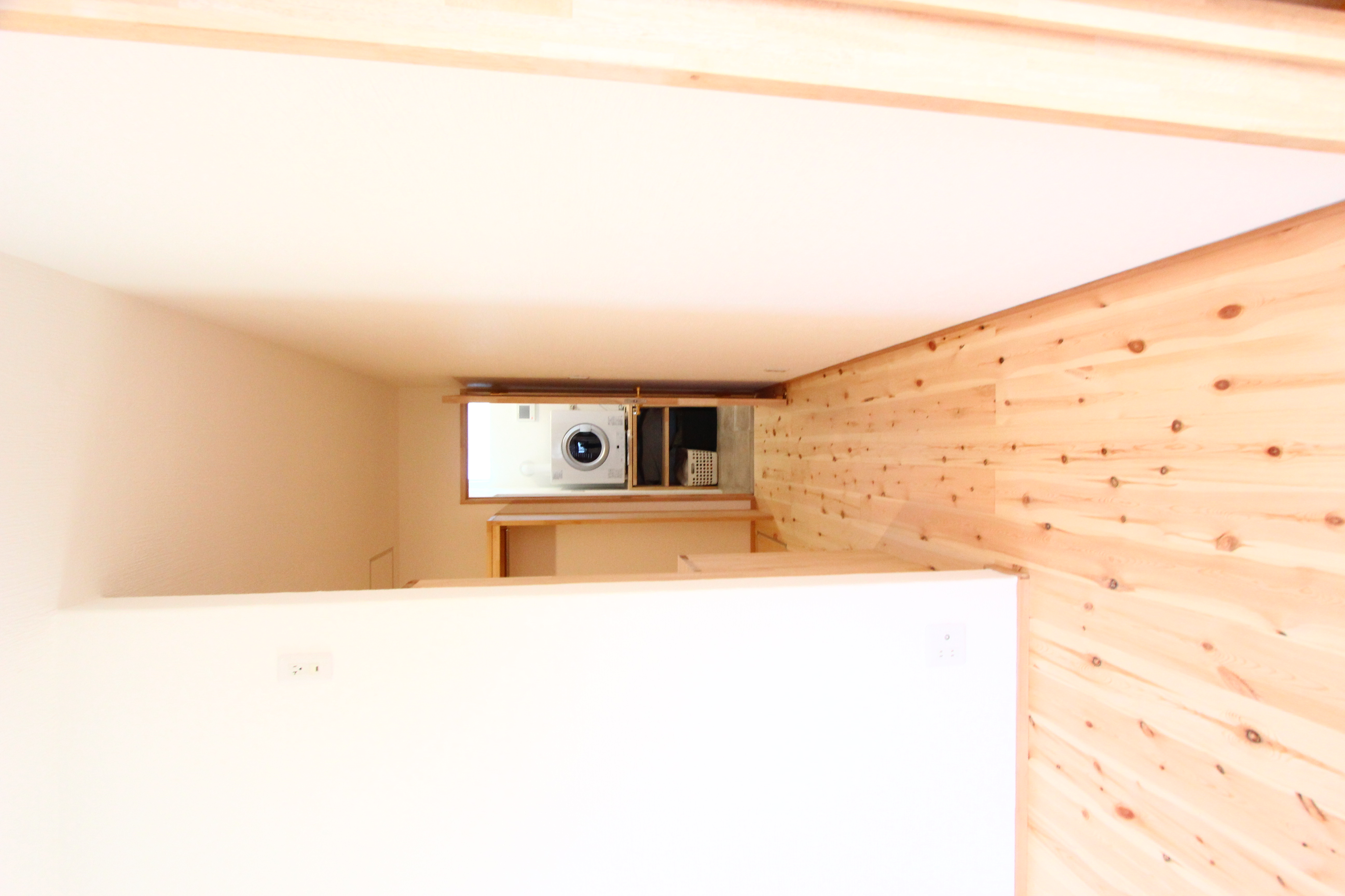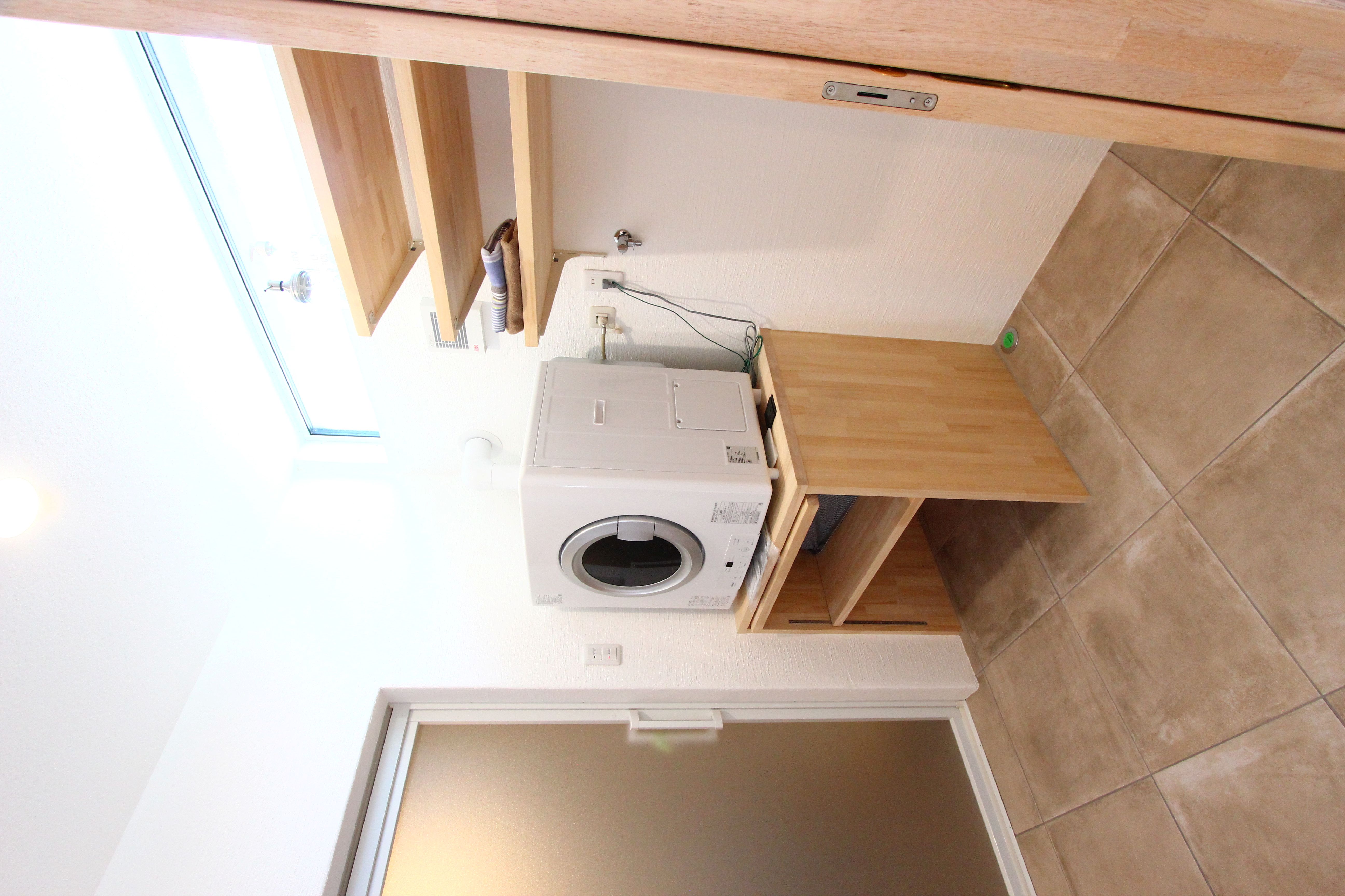洗濯機の横に、ちょうどいい高さに乾太くんを設置しました。無垢集成材で造作しています。たたむための台も、引っ張ると出てきます。