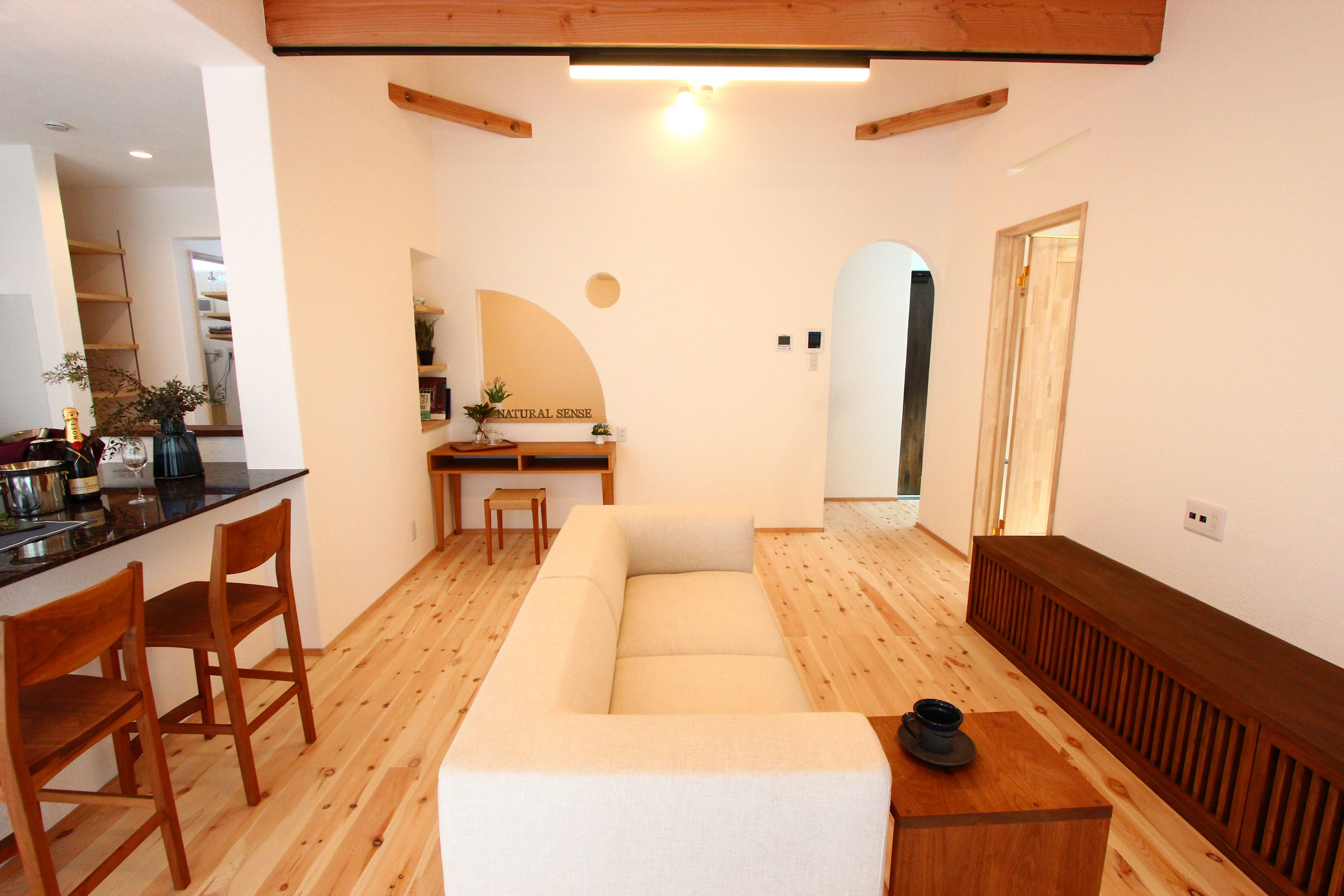 大きな掃き出し窓からの光が無垢床にゆらゆらと映えて、心地良いリビングになりました。