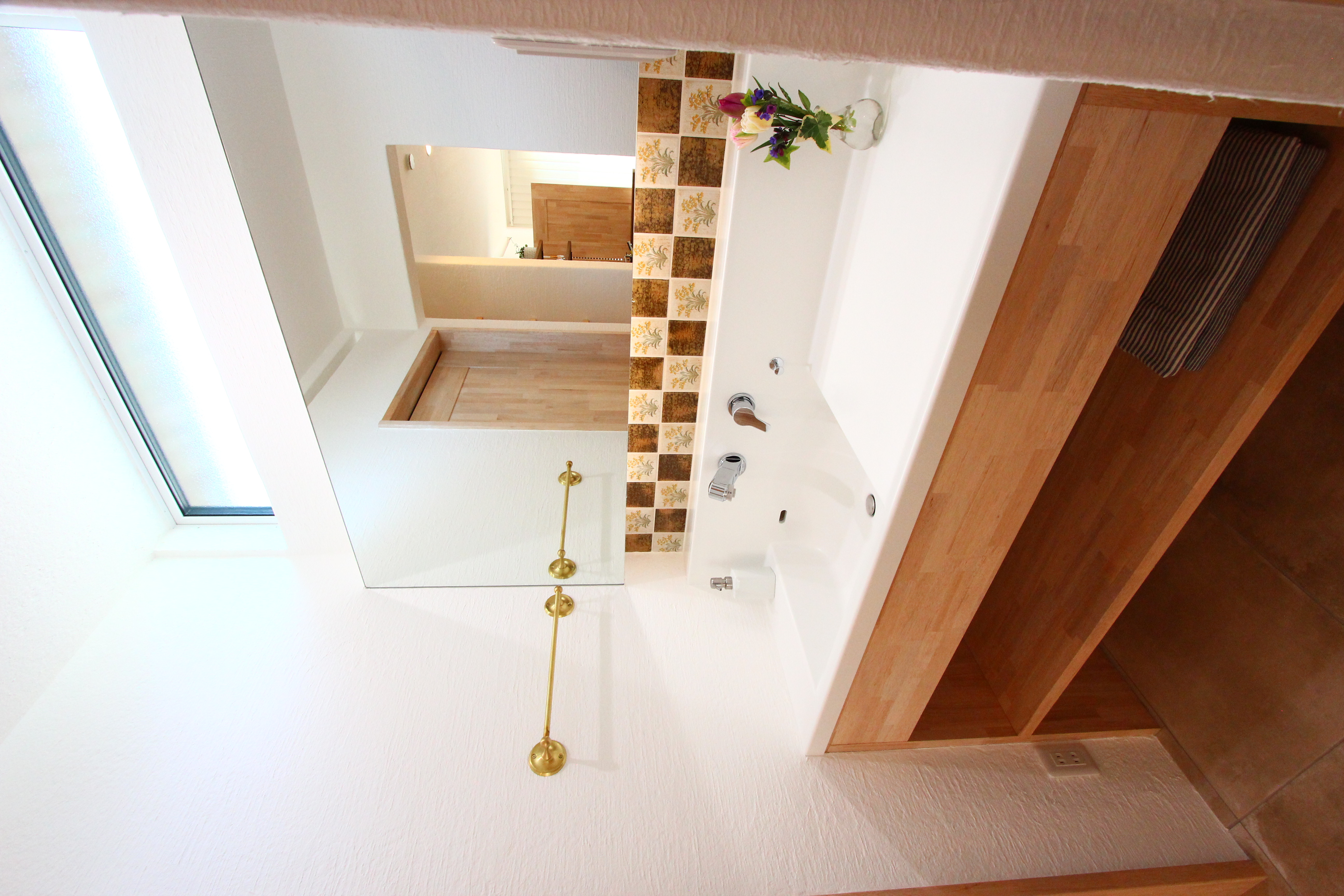 奥さまが選んだタイルが可愛い洗面コーナー。お掃除もらくらくです。キッチンからすぐ行ける動線なのも便利です。